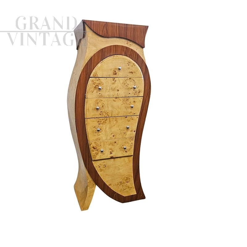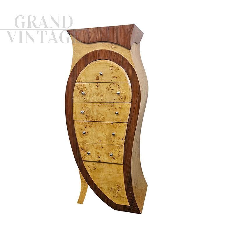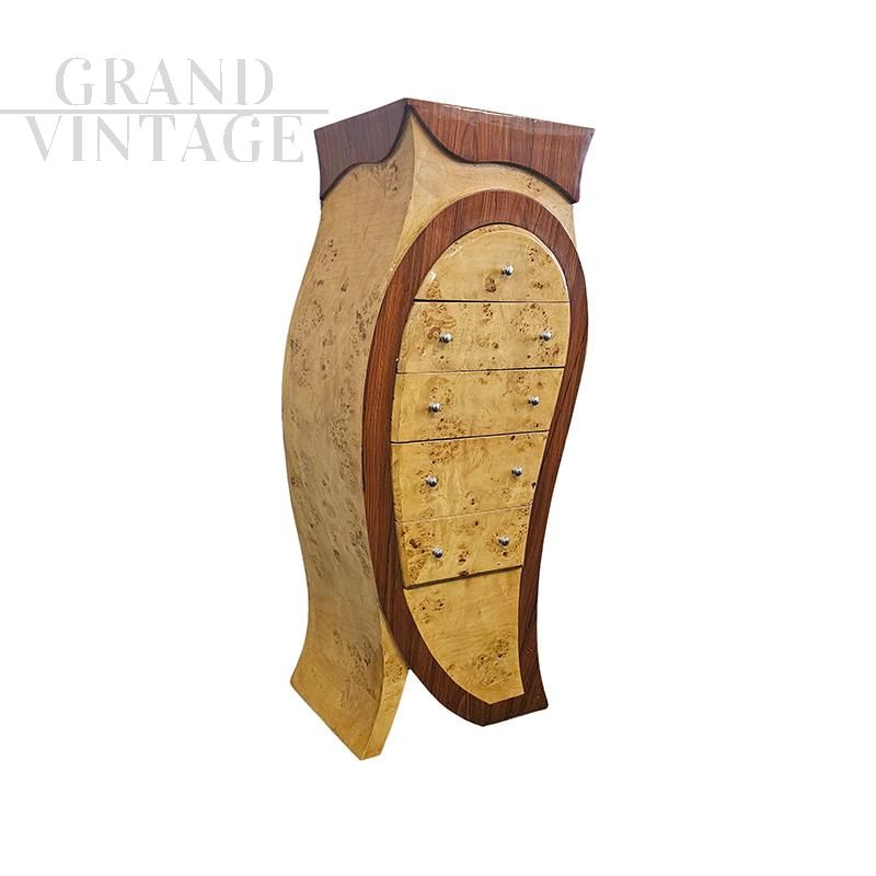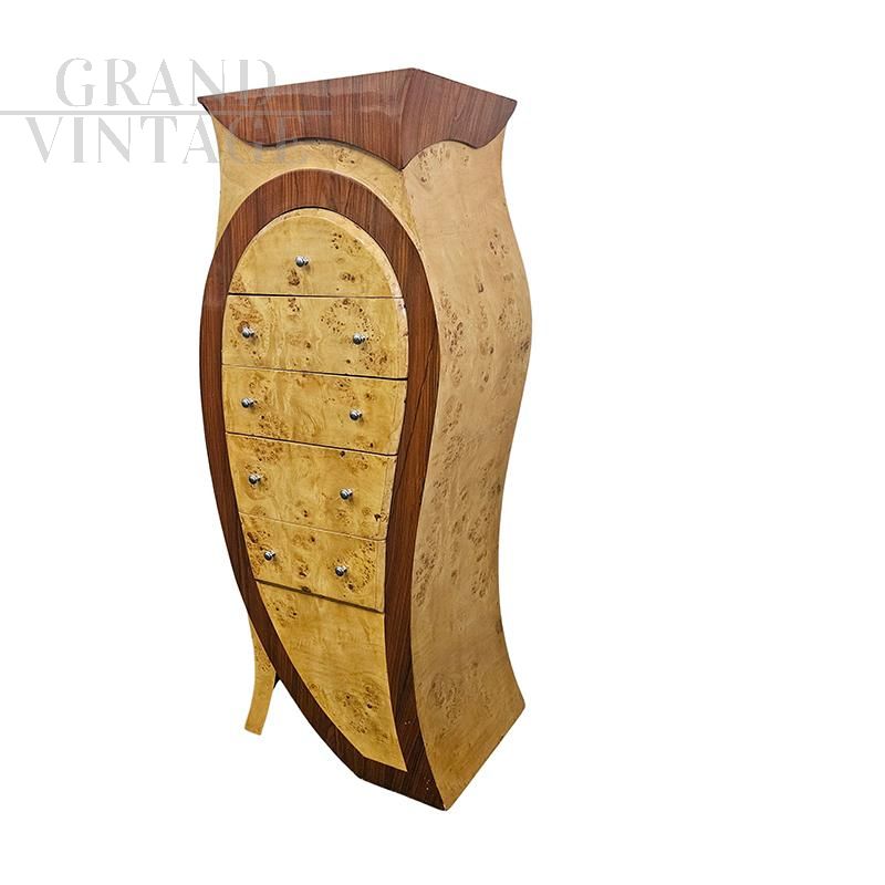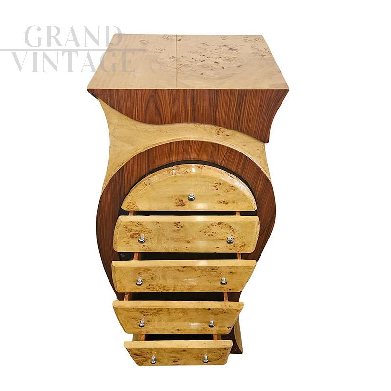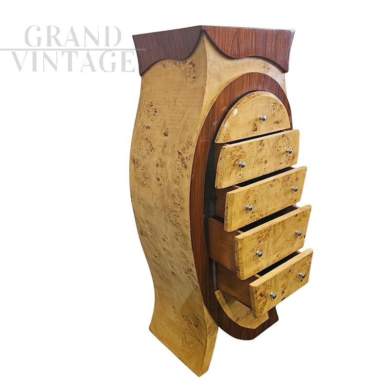 Sinuosa cassettiera in stile art déco dalla forma sagomata, realizzata in radica e radica di betulla e dotata di 5 cassetti.