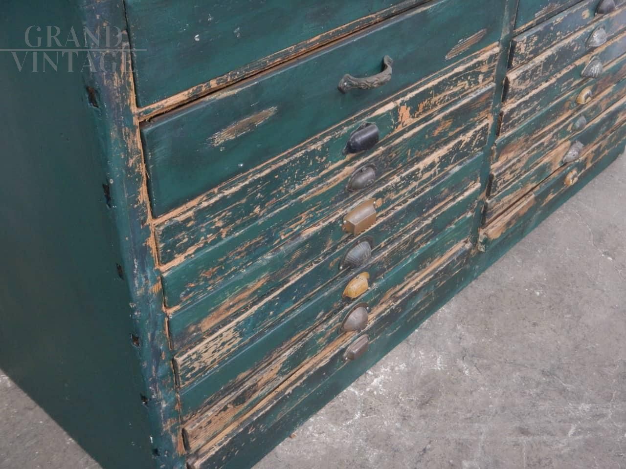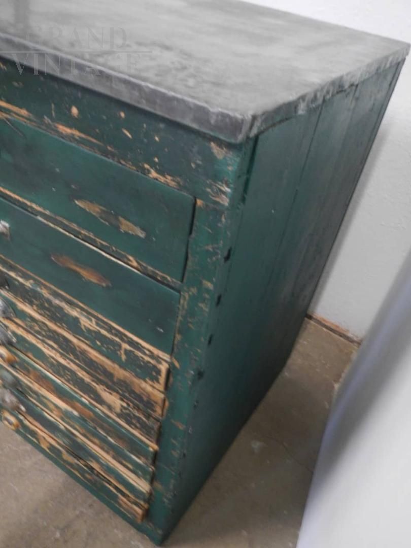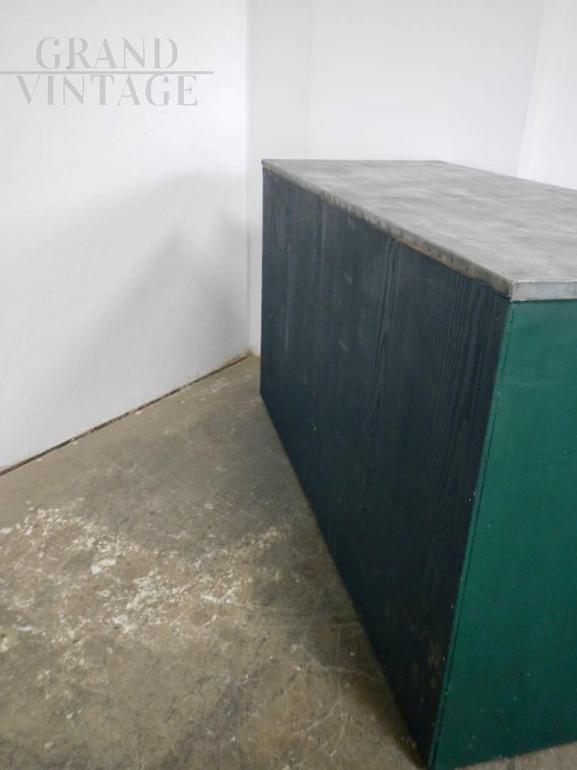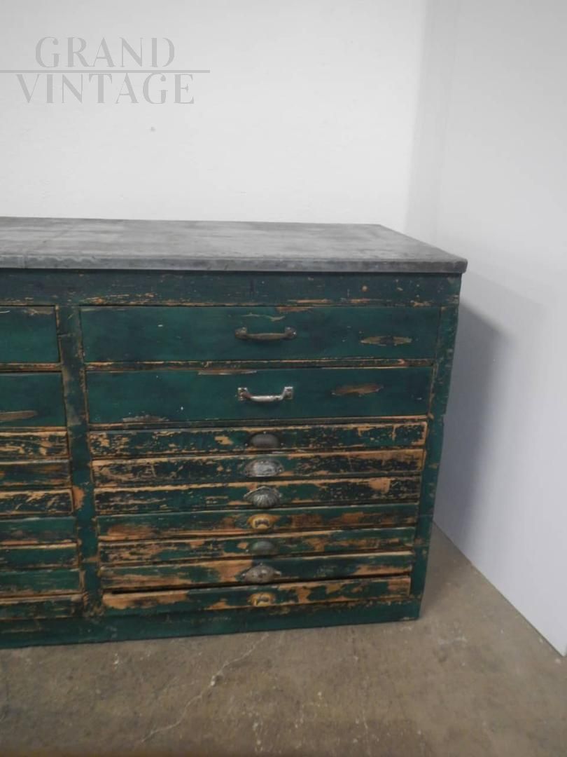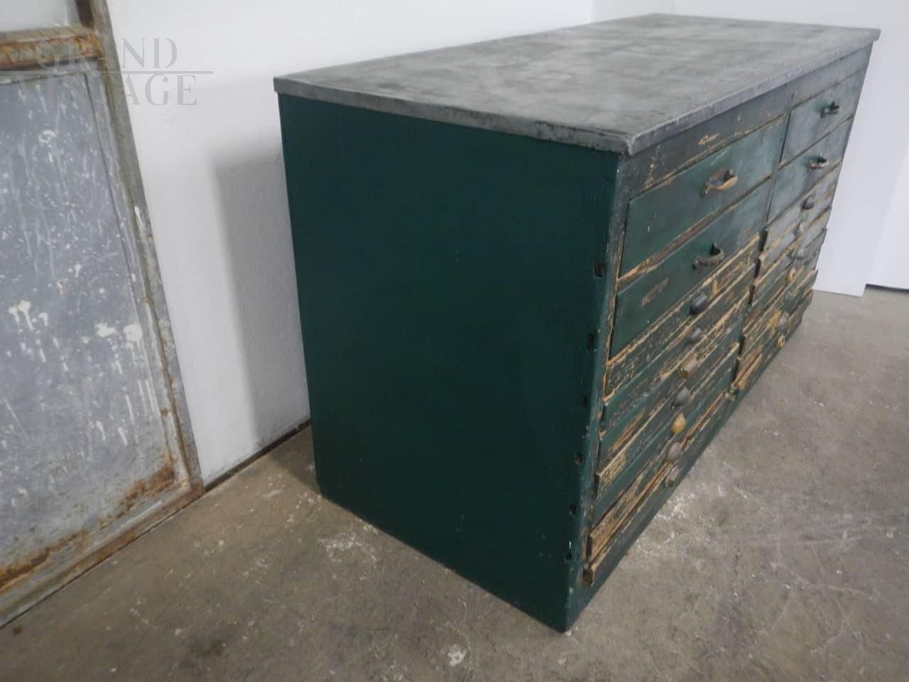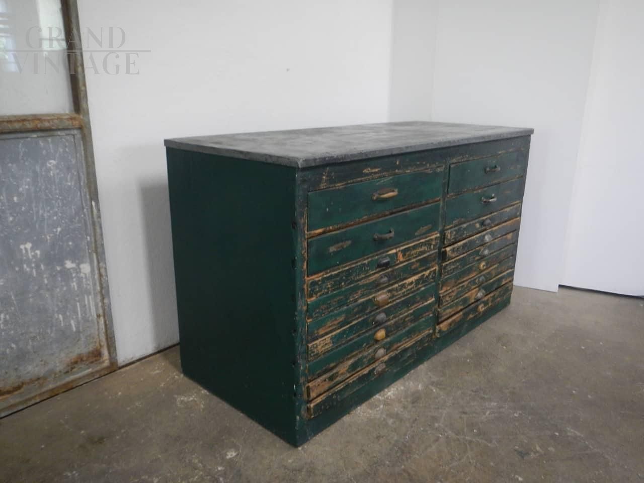 Grande cassettiera industriale da tipografia degli anni '50 utilizzabile anche come bancone grazie al piano in lamiera zincata, la struttura è in legno di abete in pittura verde ed è completa di 14 cassetti di 76 x 43 x altezza 3.5 cm e 4 cassetti di 76 x 44 x altezza 11 cm, che venivano utilizzati per riporre i caratteri da tipografia. Le maniglie dei cassetti sono originali e di diversa forma e materiale. Restaurata e lasciata in patina. I cassetti grandi sono stati ricostruiti con legno di Abete.