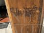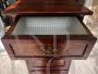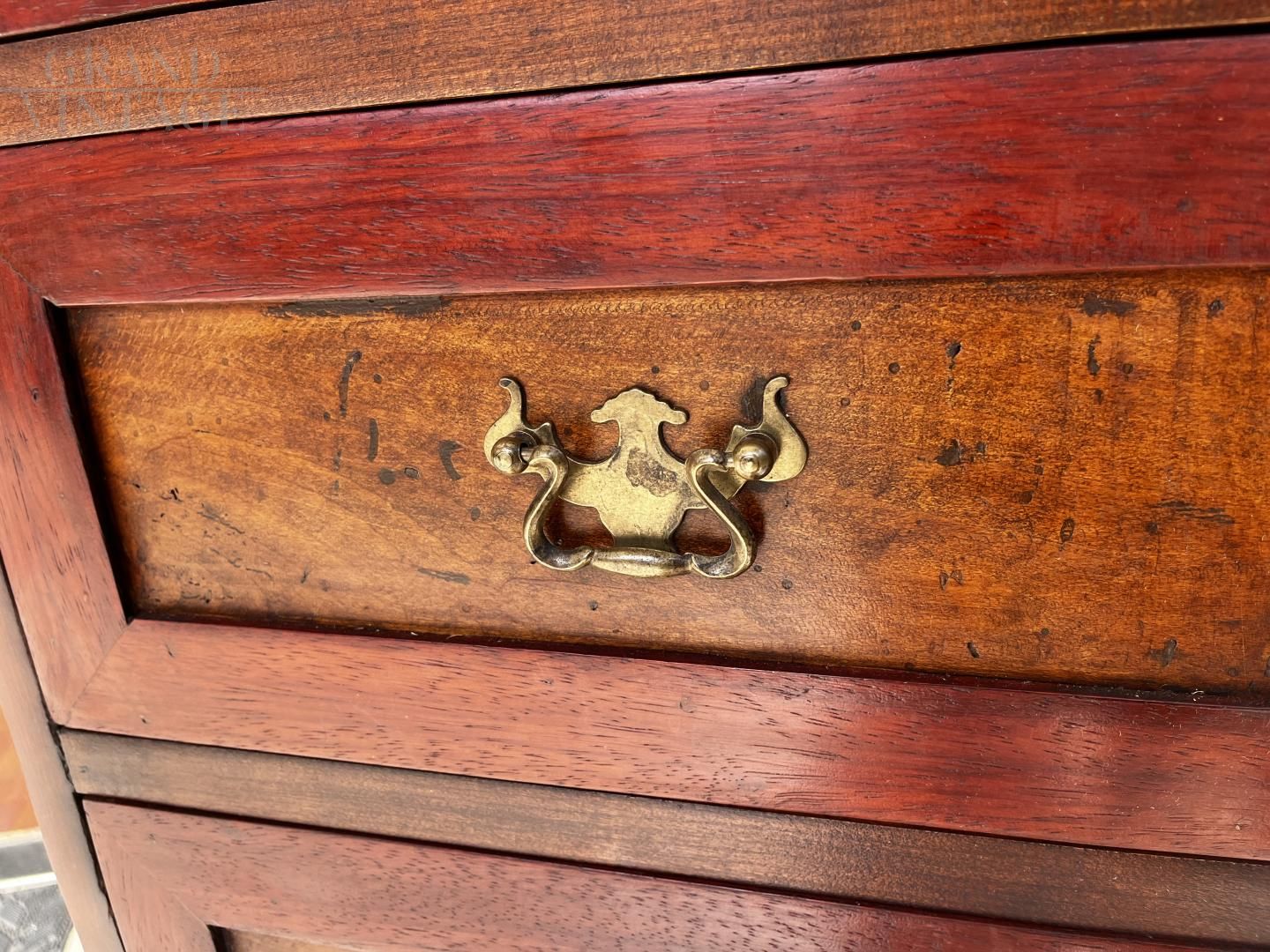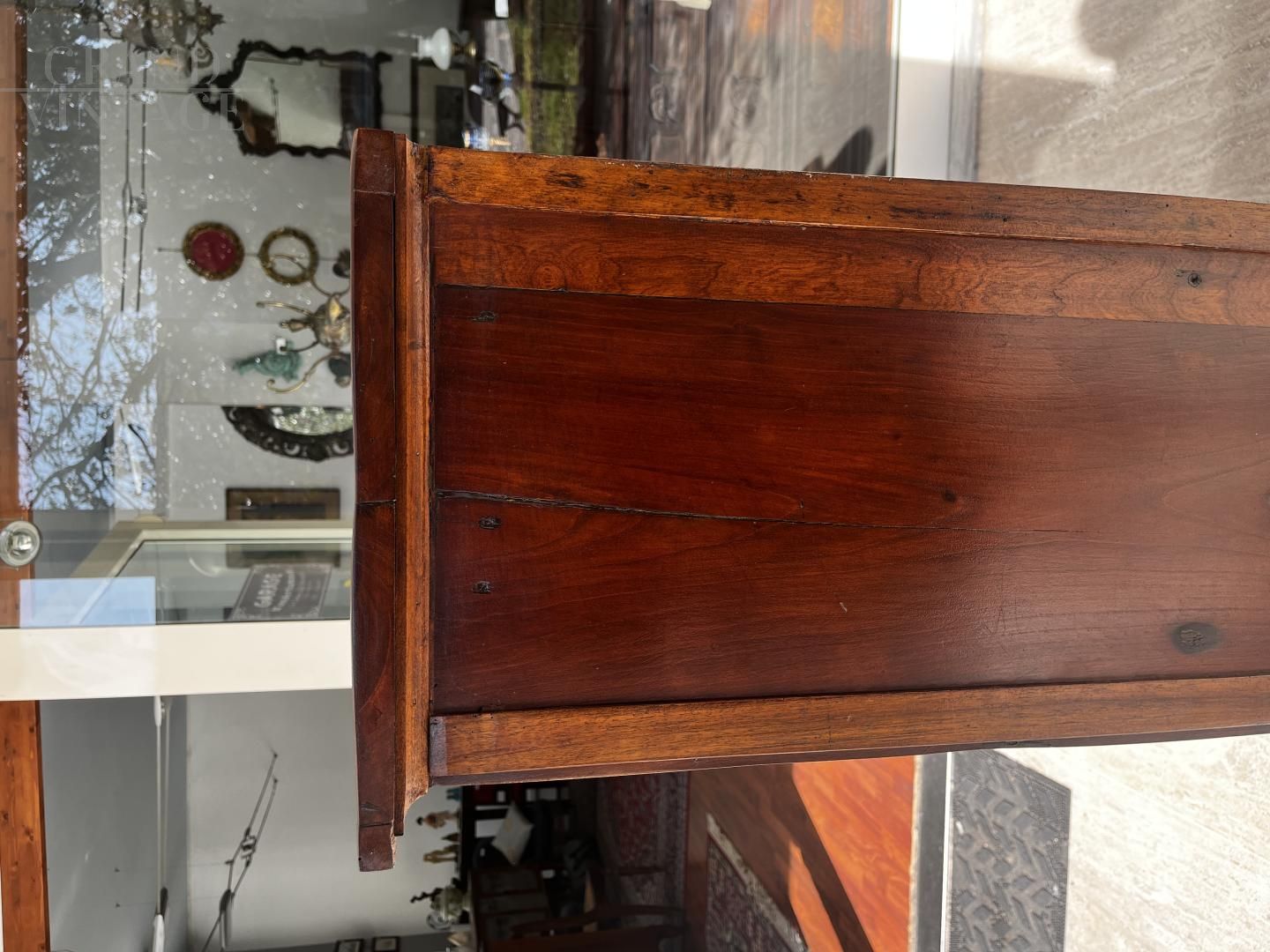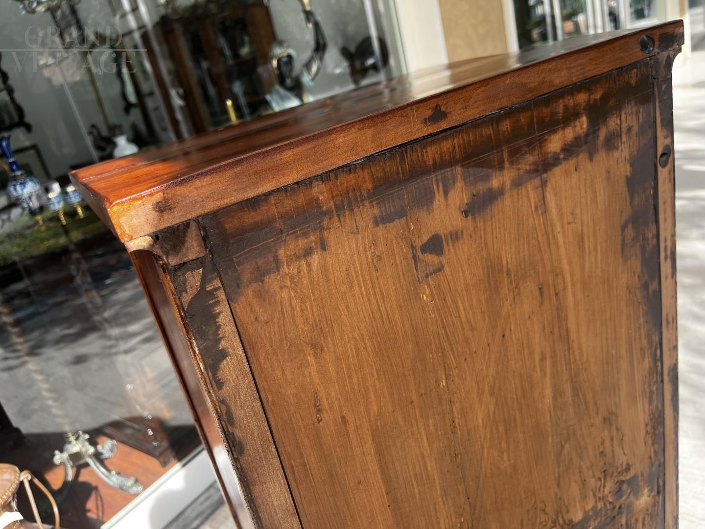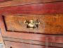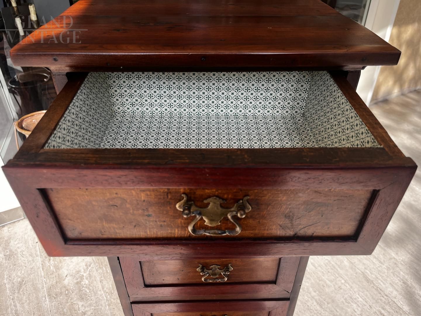 Meravigliosa cassettiera settimanale in legno di noce ed ebano dell’800, sui toni del rosso e del legno naturale, con maniglie in ottone e cassetti rivestiti. Restaurato.