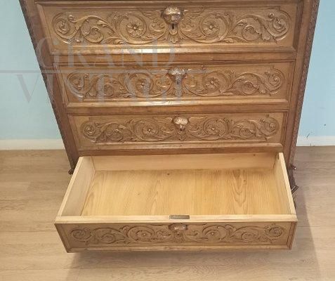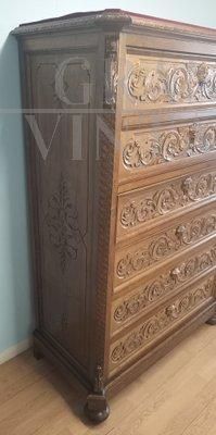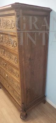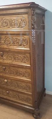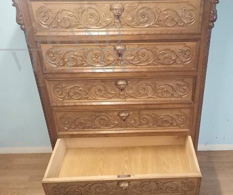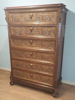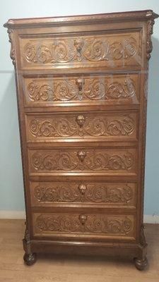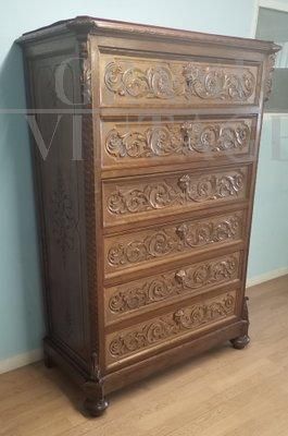 Cassettiera settimanale antica in noce intagliato del XIX secolo