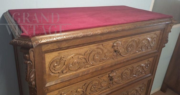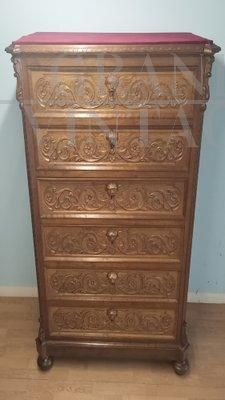 Questa cassettiera italiana in noce risale al 1890 circa, ha un piano in legno con applicazione di velluto rosso e presenta 6 cassetti in noce intagliato con chiari riferimenti neo rinascimentali. Ognuni cassetto è dotato di serratura originale funzionante. Il pezzo è completamente originale e privo di restauri, poggia su una base a zoccolo e piedi a cipolla. Provenienza: Italia Meridionale.