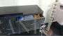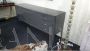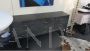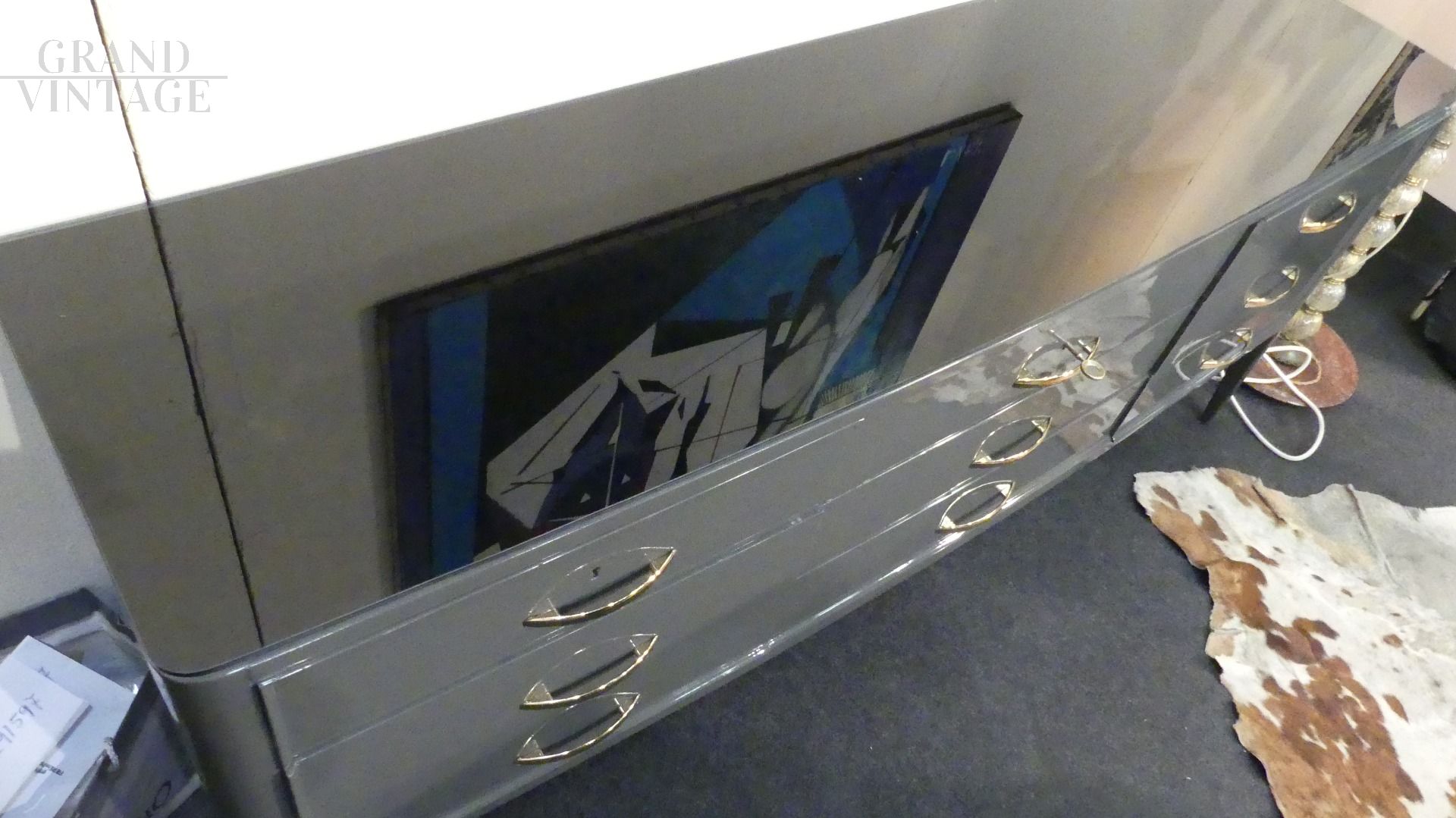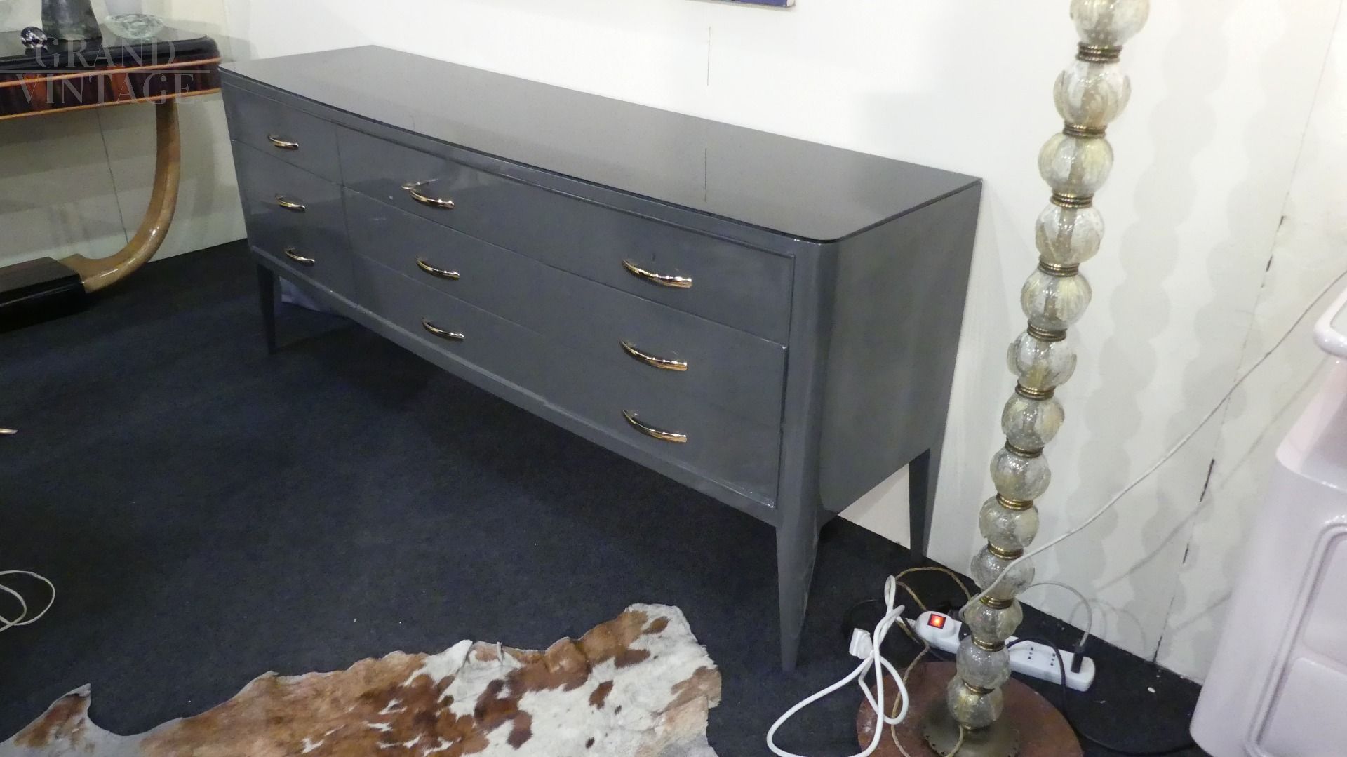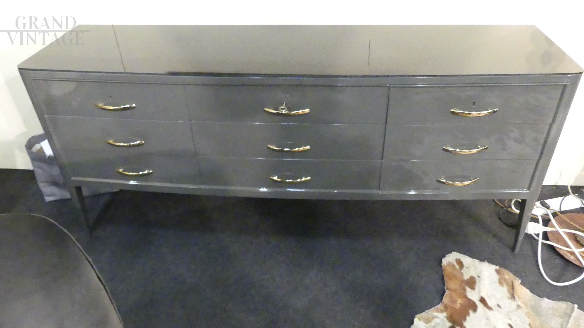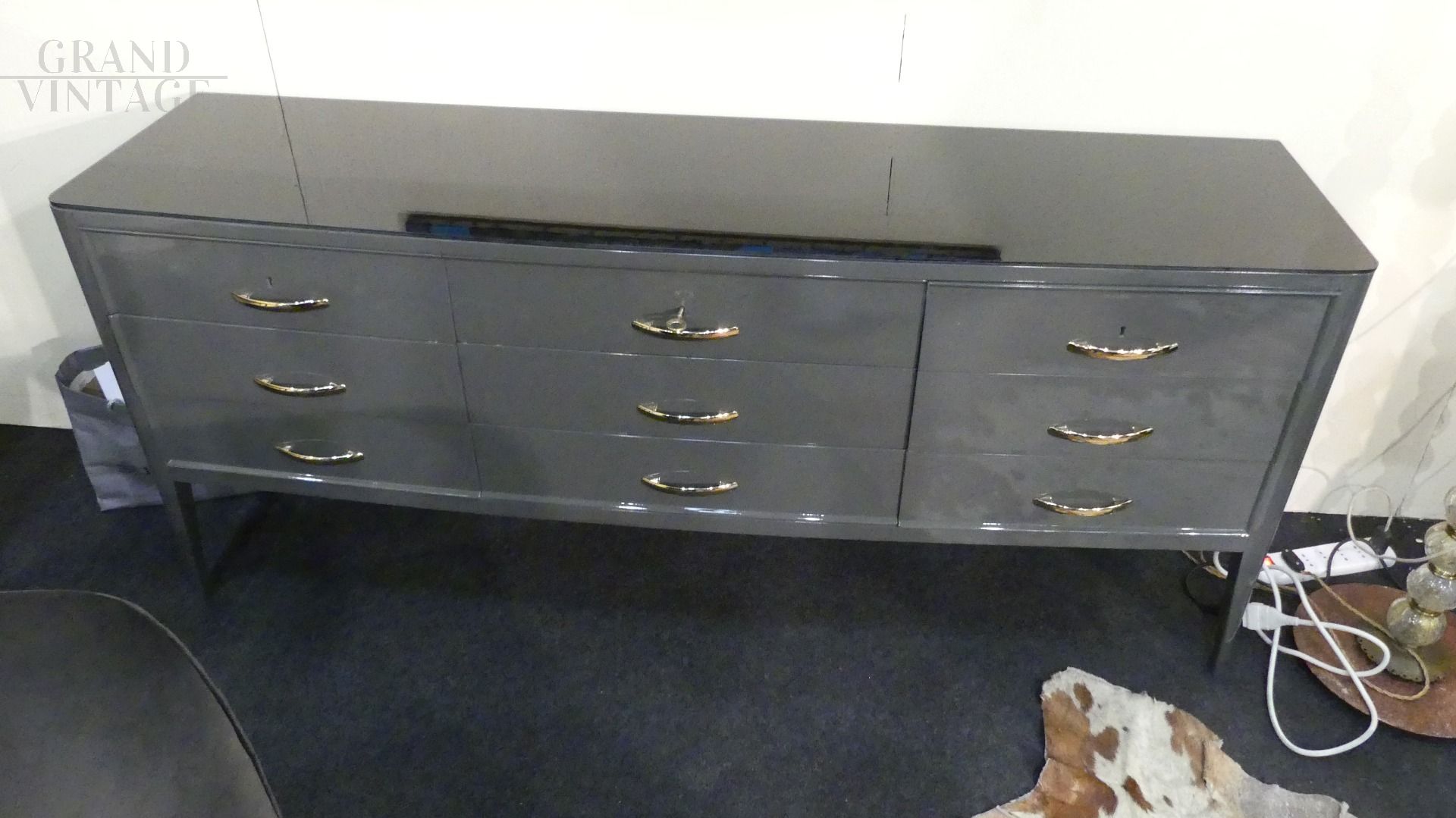 Cassettiera vintage anni '50 con piano in vetro retrolaccato di colore nero, maniglie in ottone non originali, laccata a nuovo in colore grigio antracite.