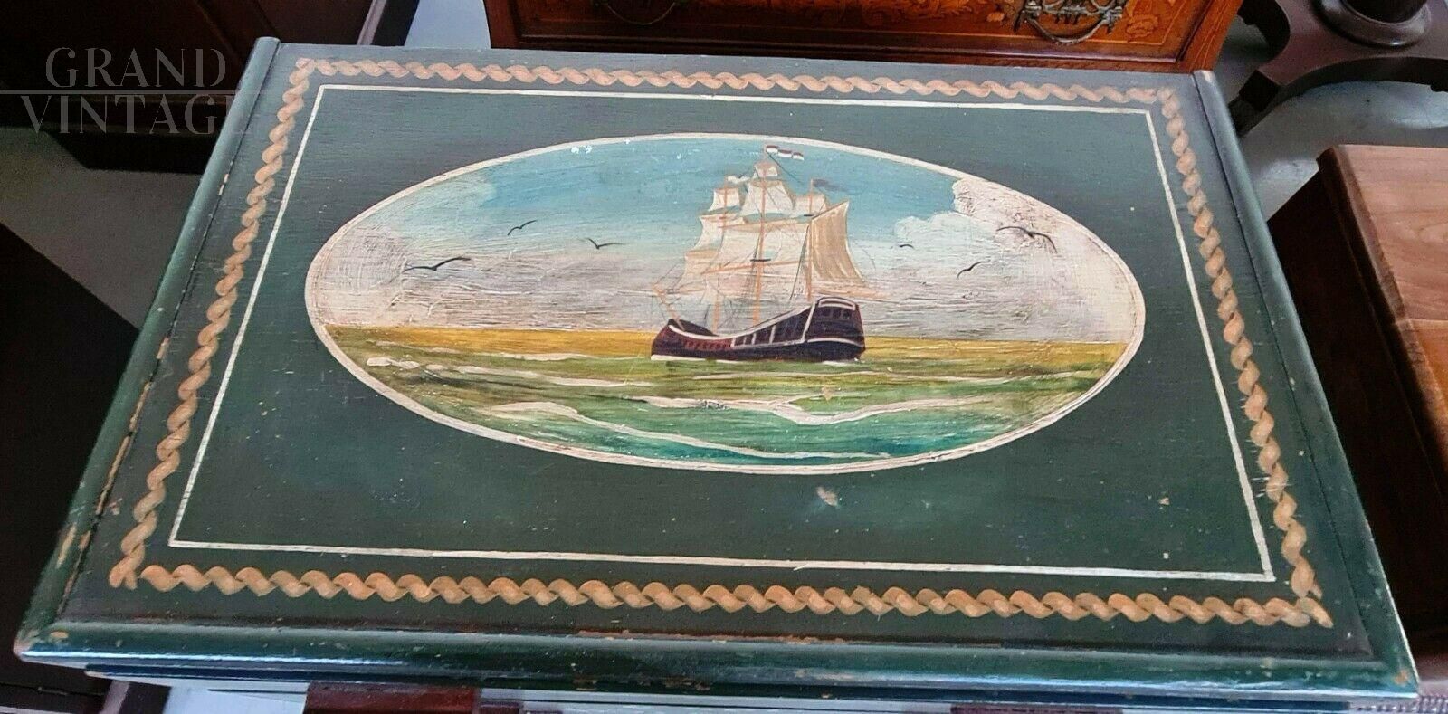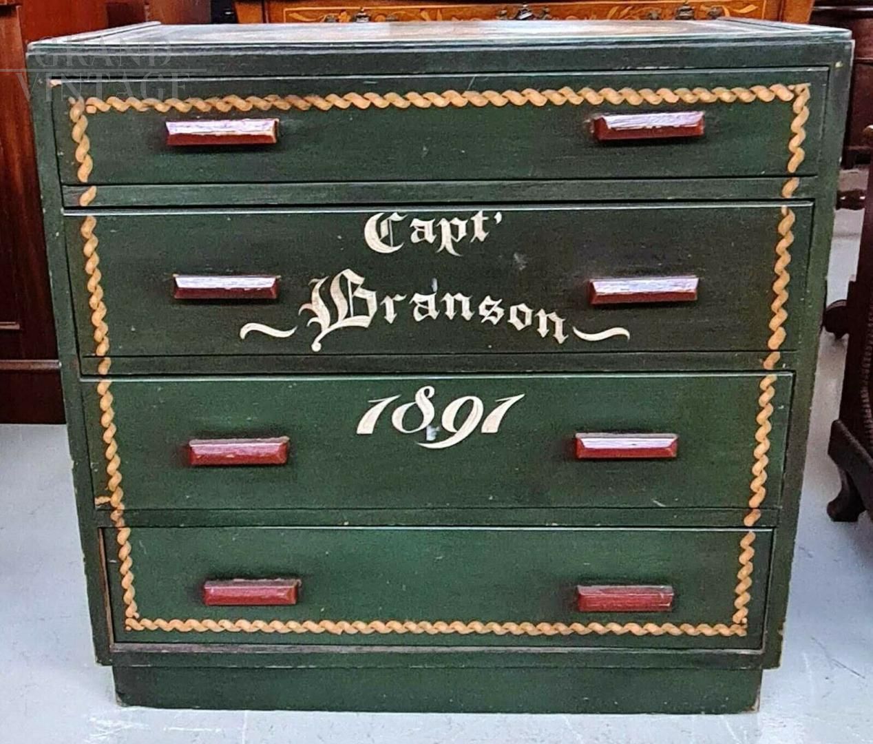 Bellissimo comò cassettiera marinara del '900, tutta in legno laccato verde, con decorazioni di nodi e con veliero dipinto sul piano, sul fronte presenta la scritta "Capt' Branson, 1891".