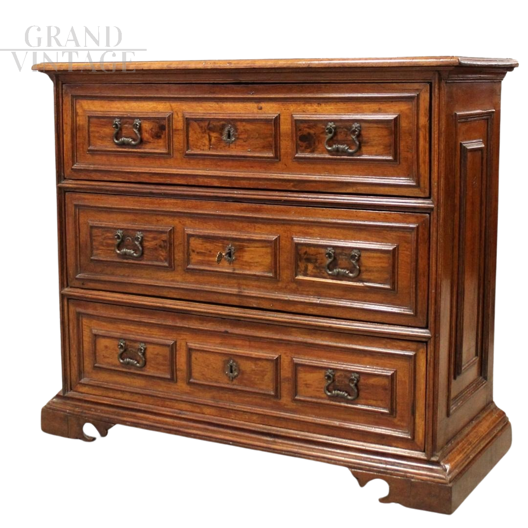 Cassettone comò canterano antico italiano del '600 a tre cassetti in noce massello, provenienza Emilia Romagna, Parma, restaurato.