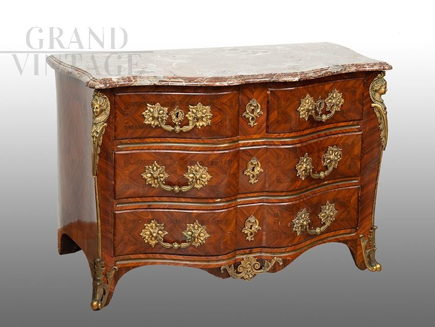 Cassettone comò antico Luigi XV Francese a tombeau in legno esotico pregiato con piano in marmo rosso Francia. La fascia sottopiano presenta due grandi cassetti estraibili tramite maniglie in bronzo dorato finemente cesellato. Il secondo e il terzo cassetto sono unici e sono estraibili sempre tramite maniglie. I due cantoni sono impreziositi da elementi in bronzo raffigurante busti di donna e terminano con scarpette a cabriolet. Lateralmente presenta un movimento curvilineo impreziosito dalla messa in opera del legno a spina di pesce. La base è di tipo mistilineo ed è adornata da un medaglione centrale in bronzo dorato. I fondi dei cassetti sono tutti in massello di noce e le serrature sono originali dell'epoca. Buono Stato, Francia XVIII secolo.