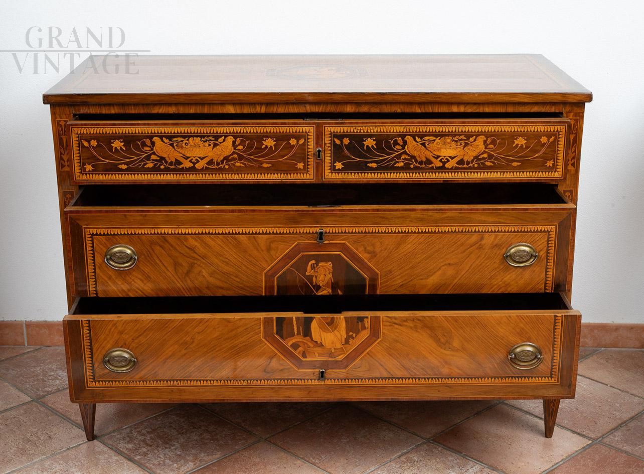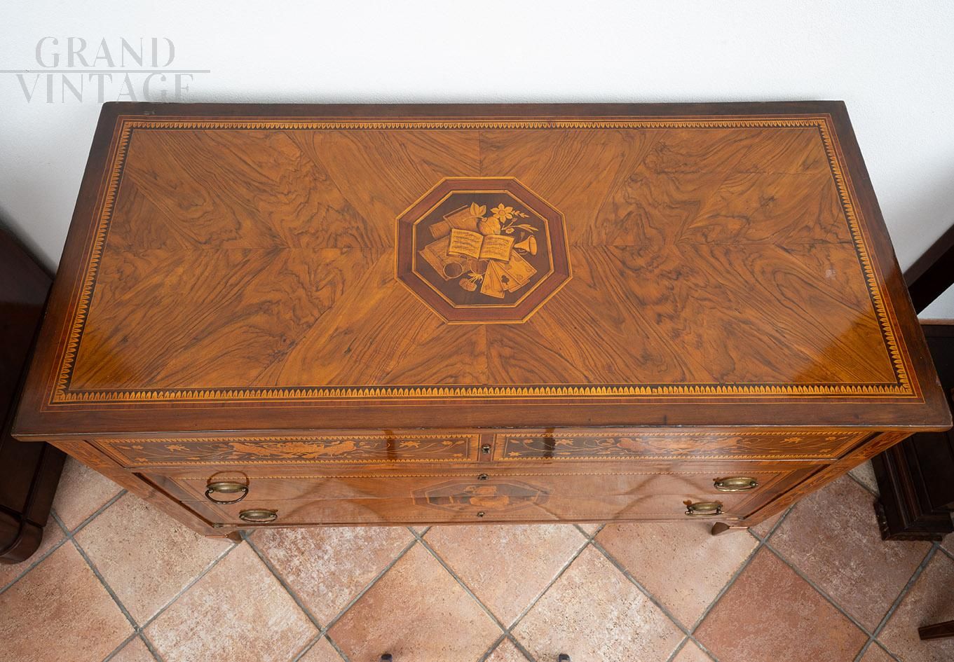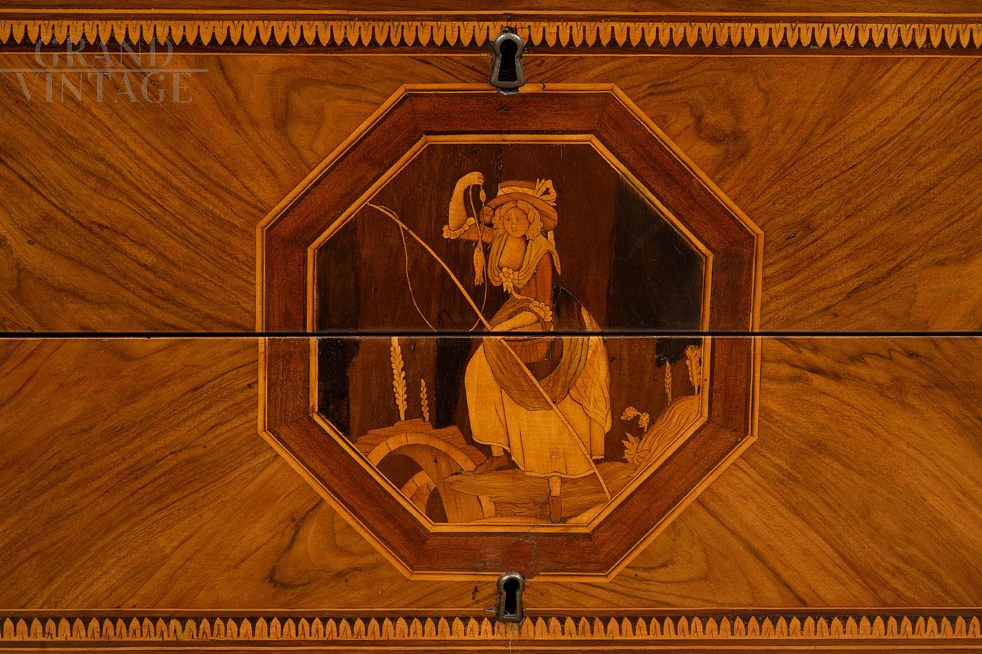 Cassettone comò antico lombardo a tre cassetti con struttura lastronata in legni esotici e intarsiato con essenze lignee pregiate sormontato da un piano recante al centro un intarsio raffigurante fiori, carte da gioco e libri. Il fronte è scandito da tre cassetti di cui uno sottopiano esaltato dalla presenza di un fitto intarsio raffigurante colombe con cesti di fiori,mentre la parte sottostante è sottolineata graficamente da due giri di filettatura con al centro un intarsio raffigurante una dama. Sui laterali si ripete lo stesso impianto del fronte con al centro dei medaglioni raffigurante paesaggi. Tipici piedini tronco piramidali con strozzatura nobilitati da filetti disposti di testa a sottolineare gli angoli. Condizioni: Ottimo Stato. Provenienza: Lombardia XVIII secolo.