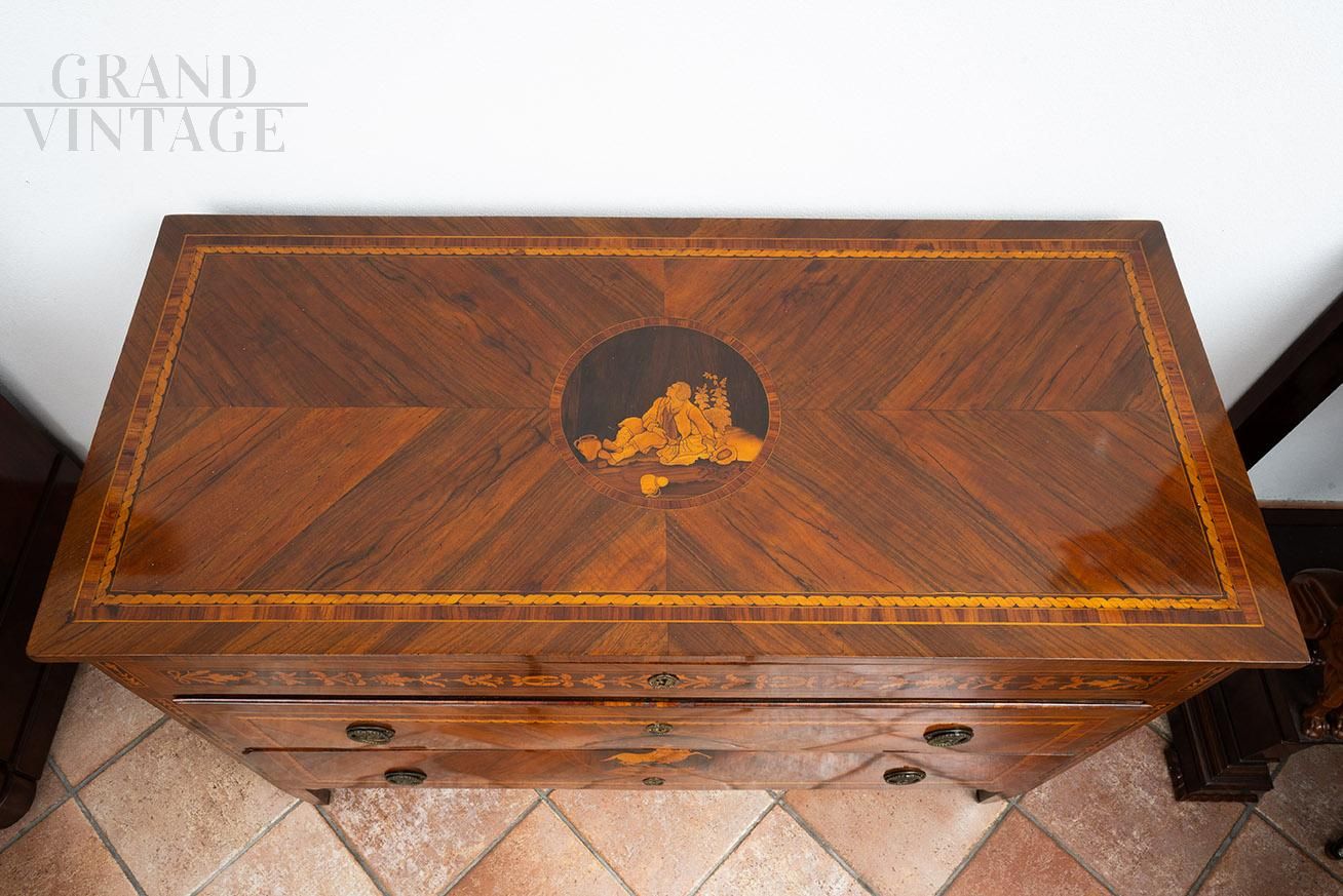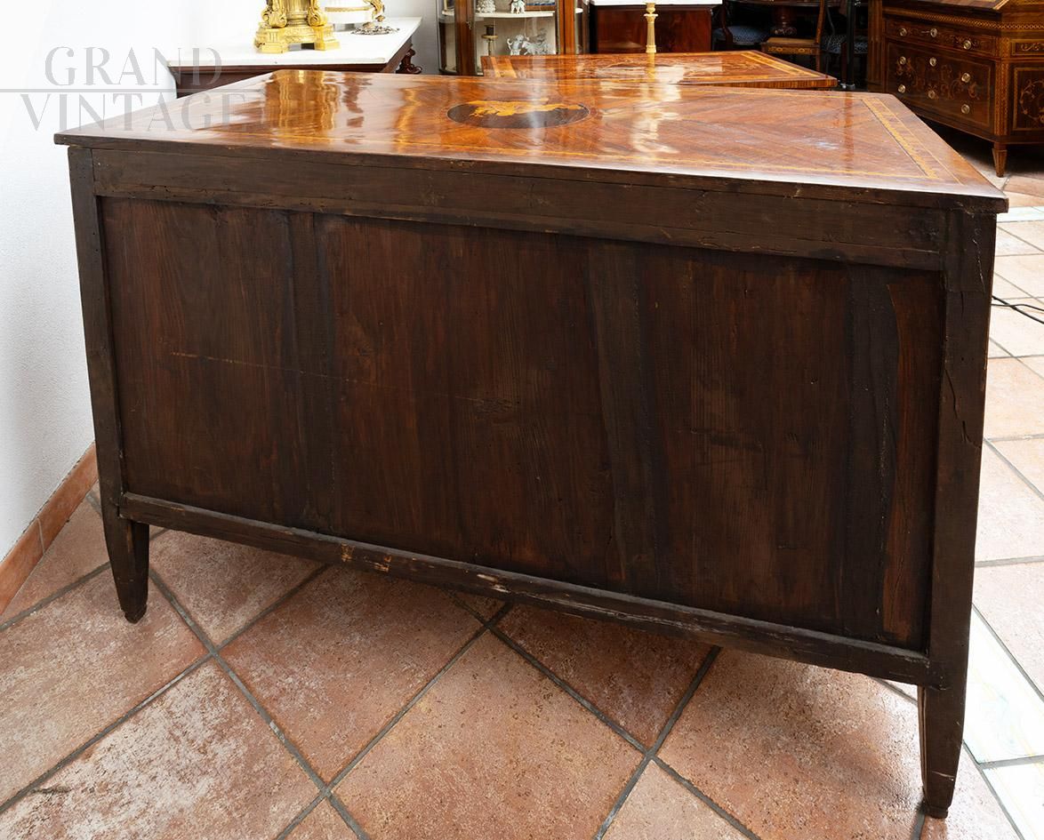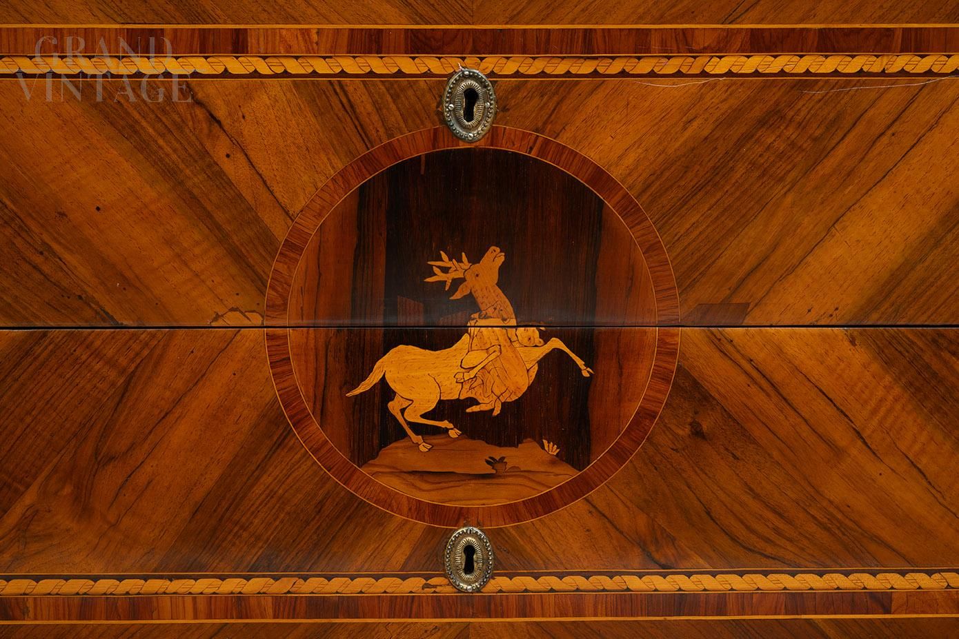 Cassettone antico Luigi XVI Lombardo in radica di noce con innesti di intarsio in legni esotici pregiati. IL prospetto frontale è caratterizzato da due grandi cassetti con al centro una figura di cervo e uno più piccolo sottopiano impreziosito da un intarsio a motivo floreale. Sui fianchi del mobile all'interno di cornici geometriche è raffigurato una figura di colomba mentre sul piano viene rappresentato una figura di pastore. I piedi rastremati e leggermente svasati (a tronco di piramide rovesciata)sono anch'essi decorati con filettature e dettagli intarsiati. Gli angoli e i bordi del mobile sono arricchiti da elementi decorativi geometrici e vegetali.