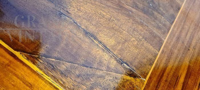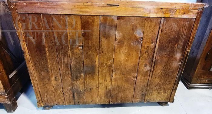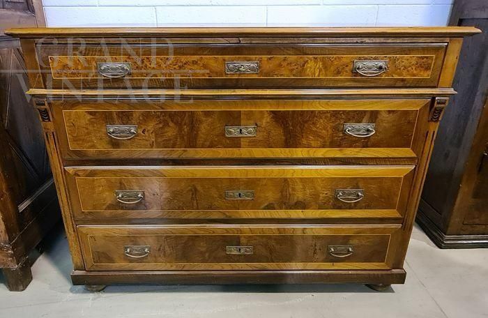 Cassettone Italiano in noce e radica dell'inizio del XX secolo in discrete condizioni, con segni del tempo e dell'utilizzo e alcune crepe, visibili in foto.