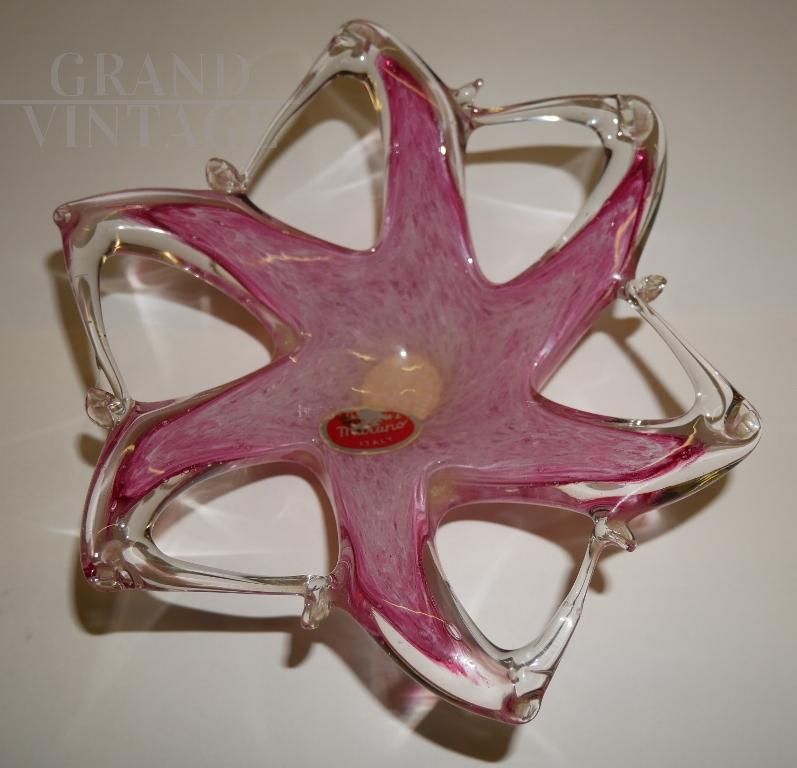 Cestino svuotatasche, posacenere o centrotavola vintage in vetro di Murano rosa, soprammobile e oggetto decorativo da collezione, anni '70 circa, con adesivo originale che ne attesta l'originalità.