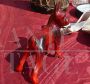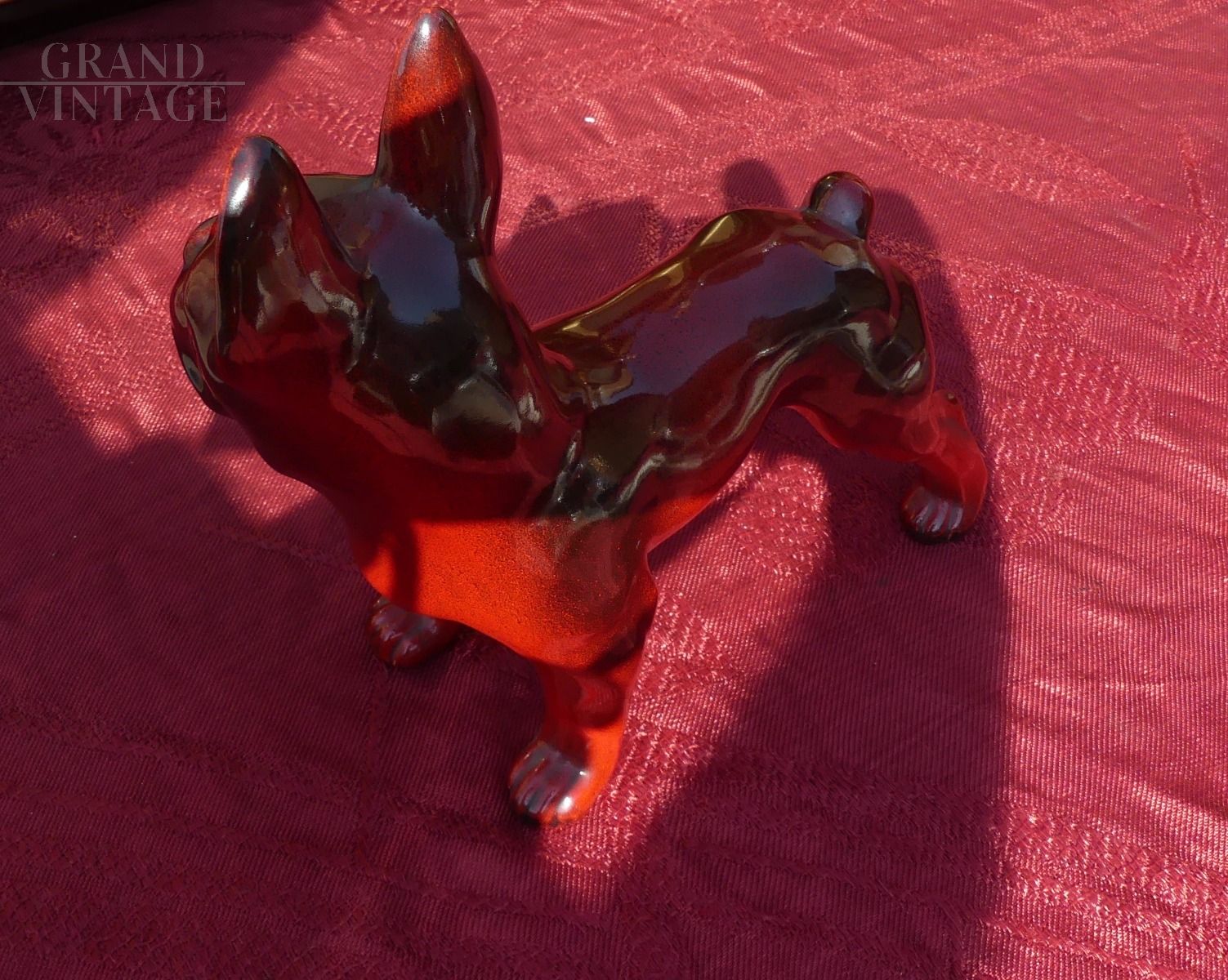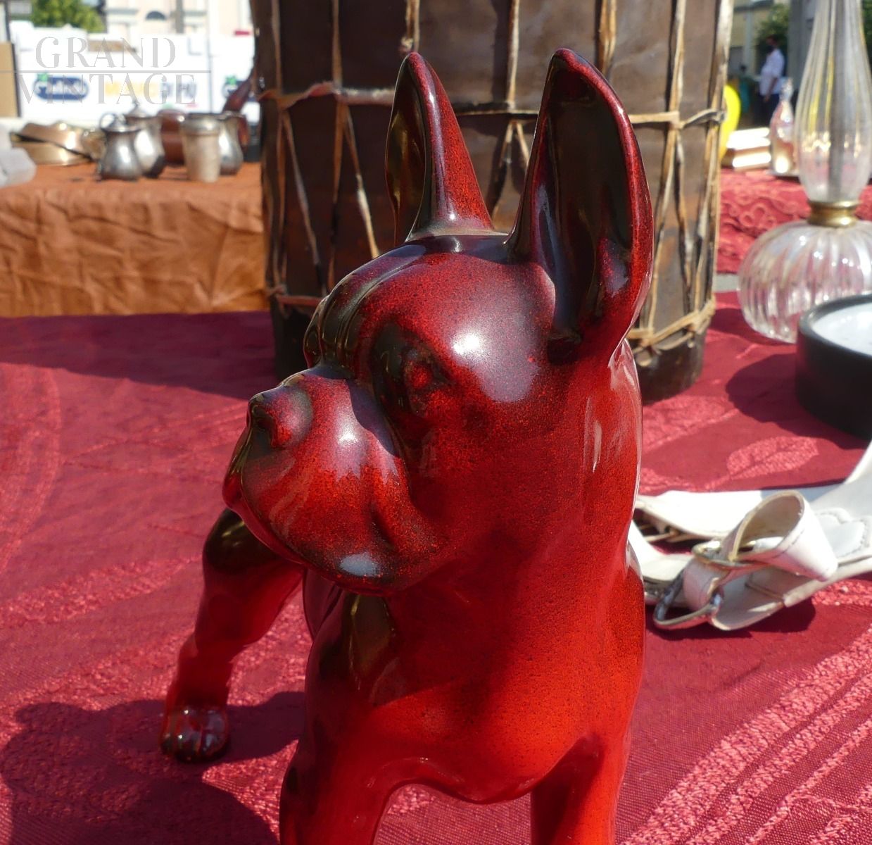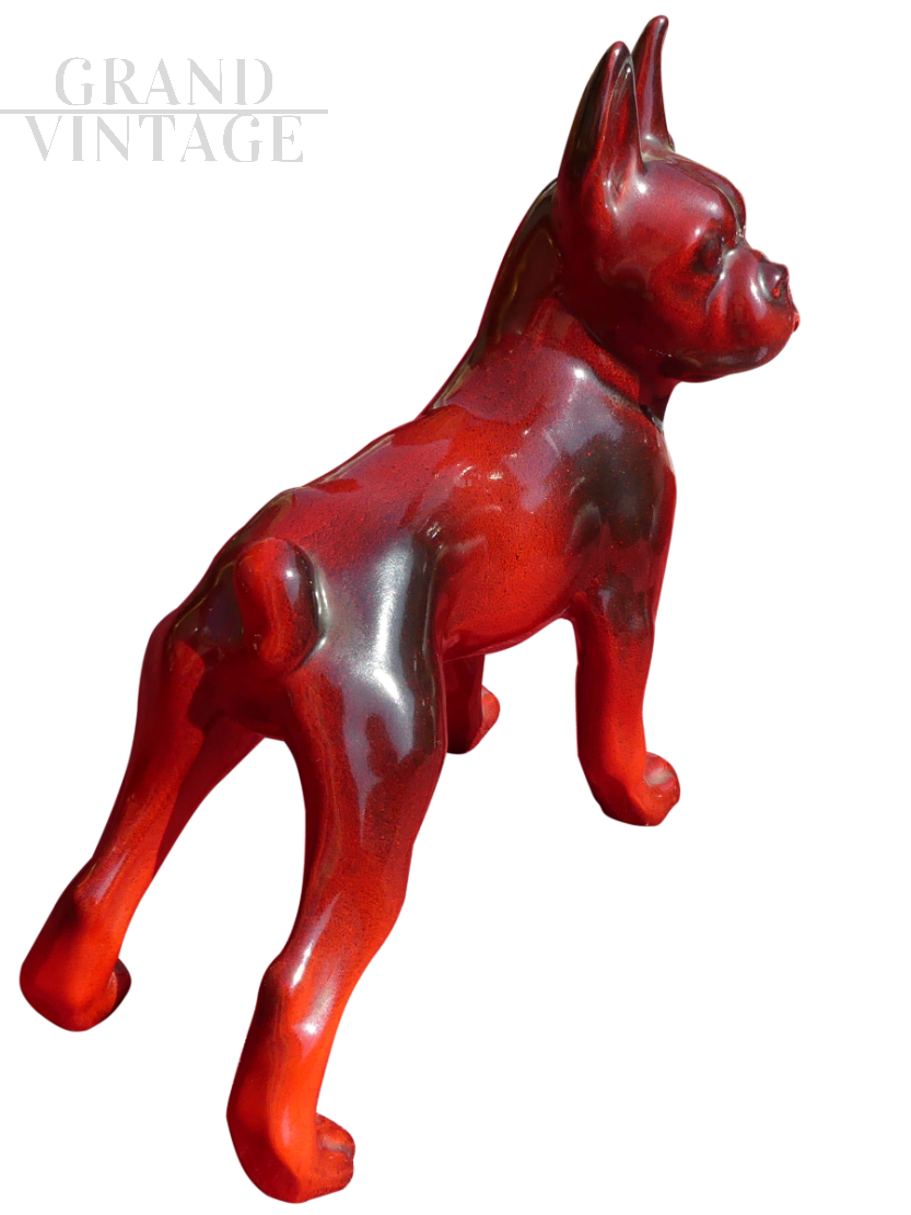 Statuetta in ceramica di colore rosso bordeaux raffigurante cane bull dog francese, realizzata da Fornasetti negli anni '70.