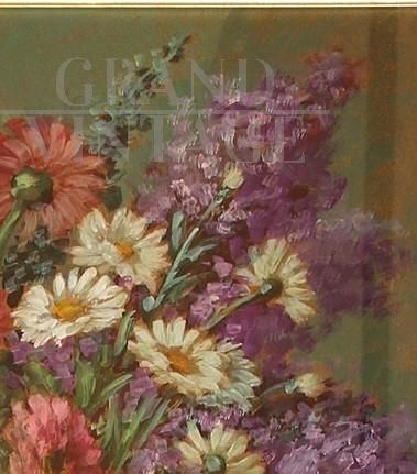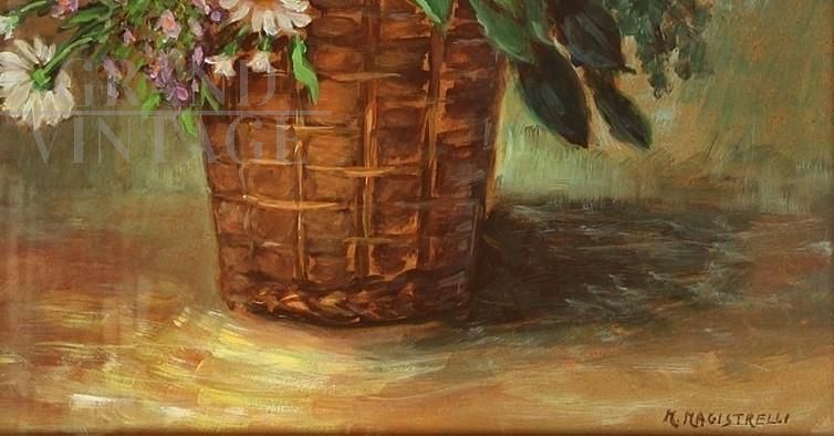 Dipinto con Cesto di Fiori di Campo, importante opera della pittrice Miranda Magistrelli, nata a Magenta (Mi) nel 1927 e morta a Vercelli nel 2007. Allieva del pittore Giuseppe Rinone, Miranda ha partecipato a numerose esposizioni personali e collettive.