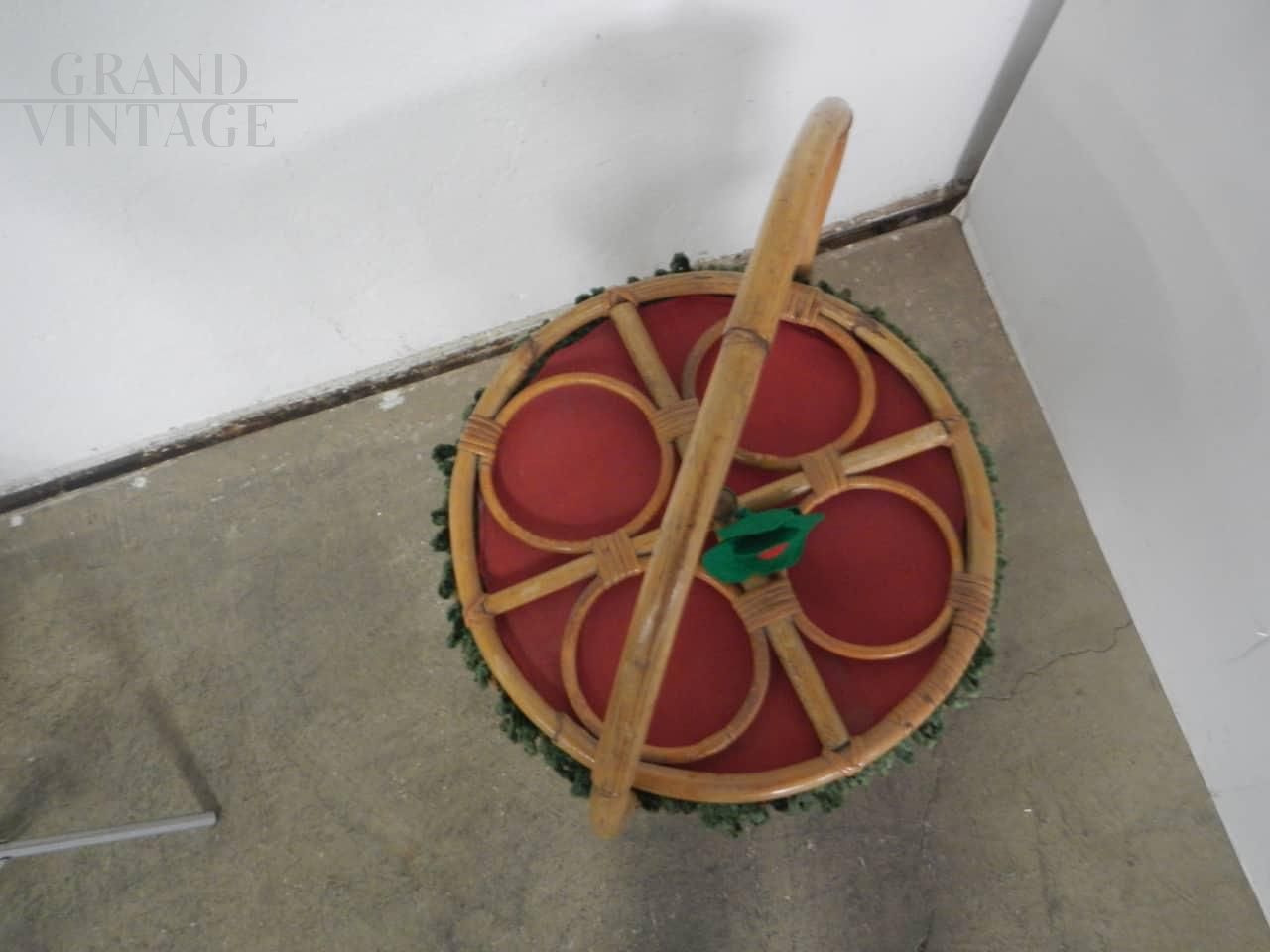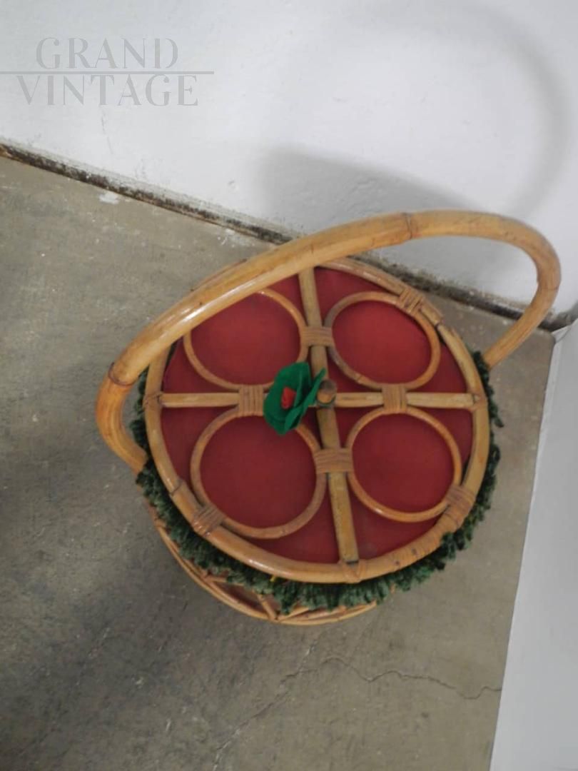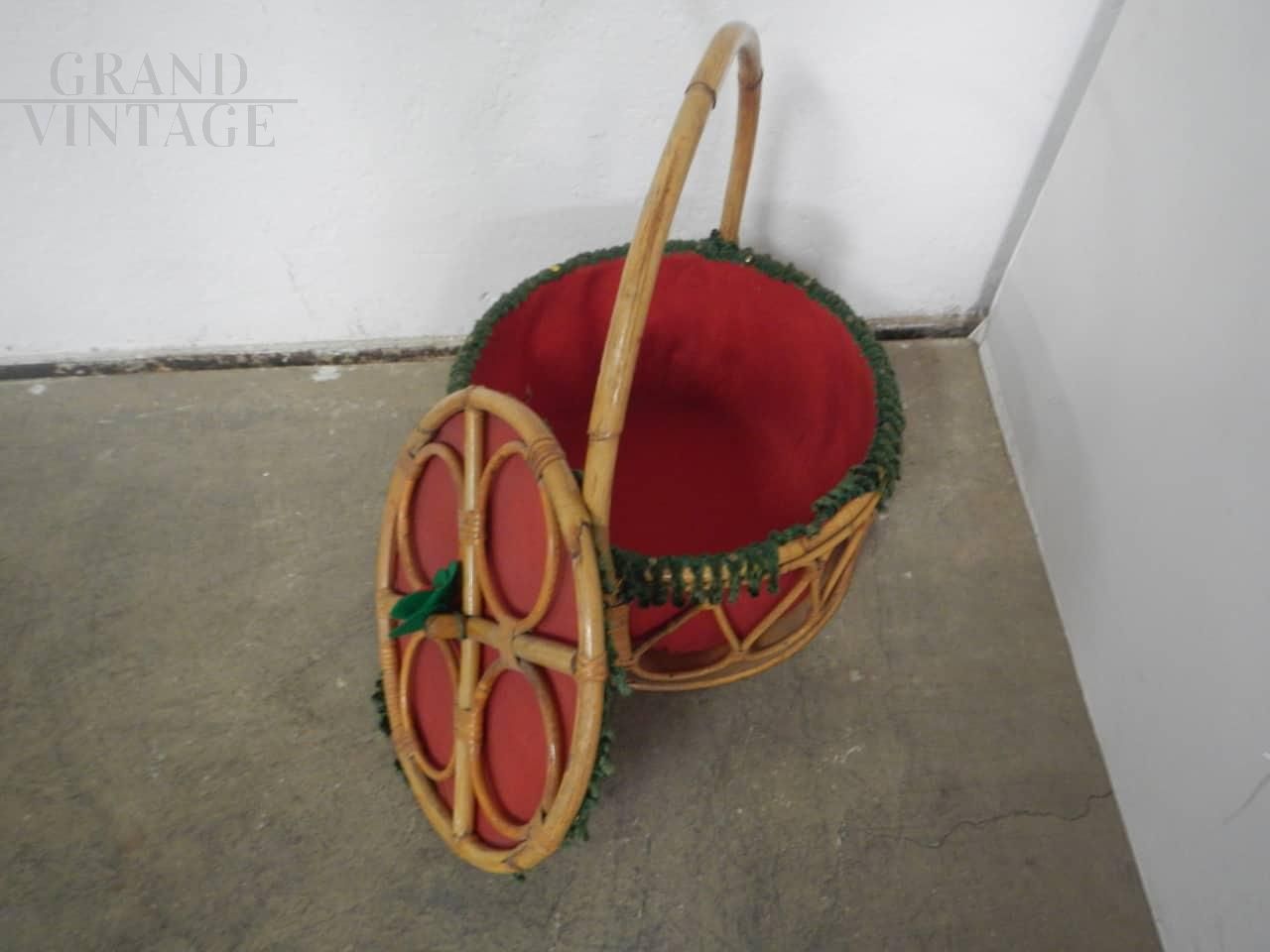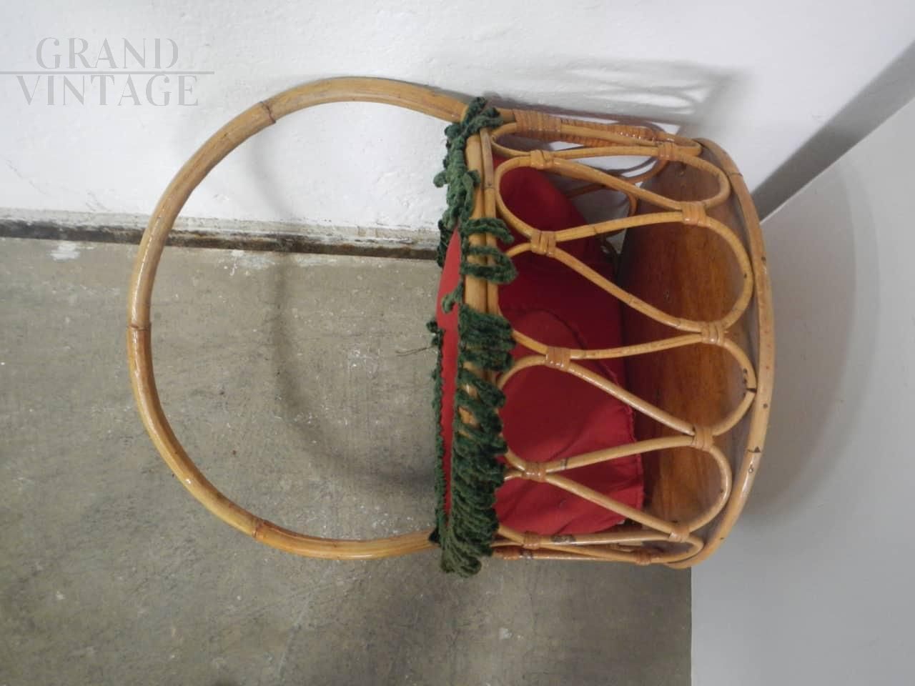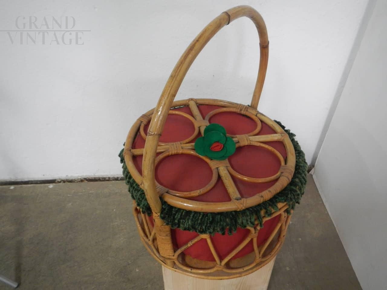 Cesto da lavoro vintage in vimini con tessuto interno, anni '70, utilizzato come porta gomitoli.