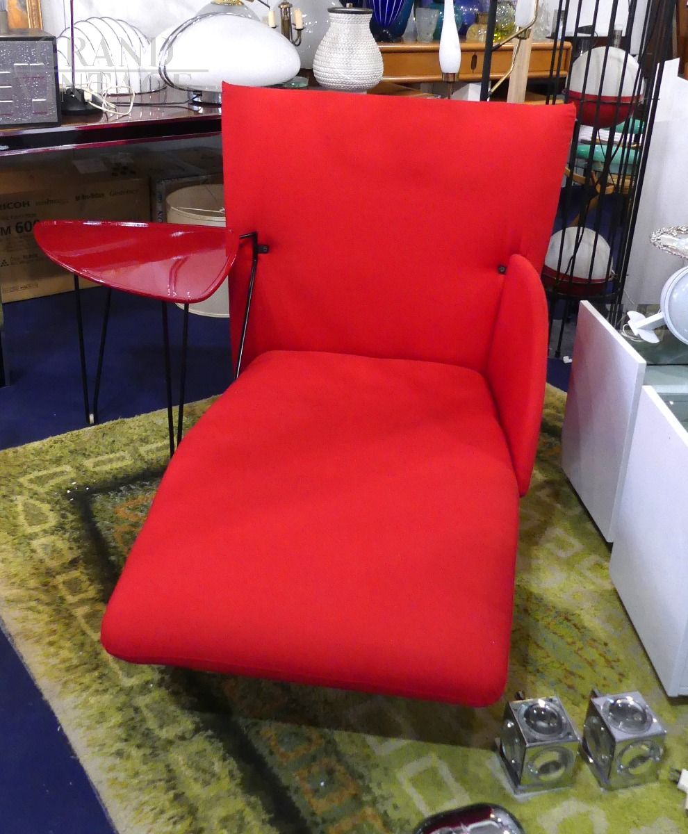 Chaise longue con tavolino di Vico Magistretti per Cassina, anni '60. La poltrona è in tessuto rosso, il tavolino con piano rosso è posizionabile a diverse angolazioni rispetto alla seduta grazie alle rotelle. Le misure indicate sono relative alla poltrona, il tavolino è alto 75 cm e suoi lati misurano 52 cm.