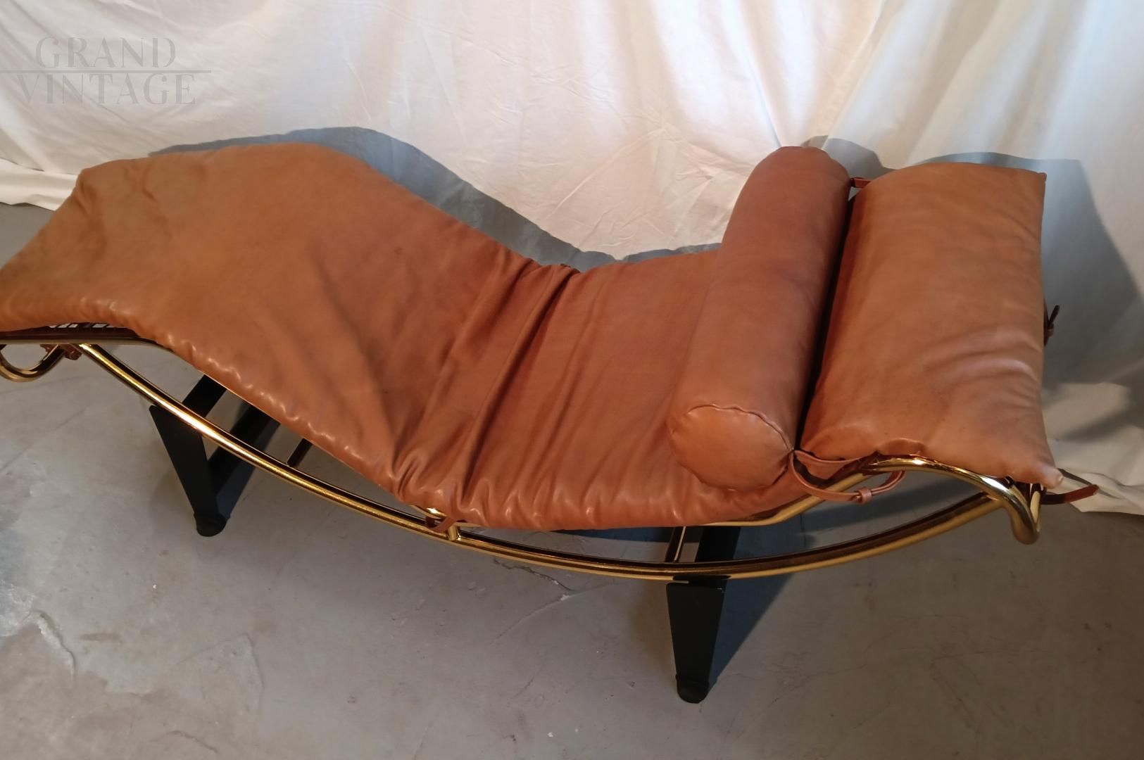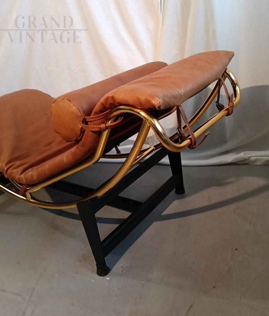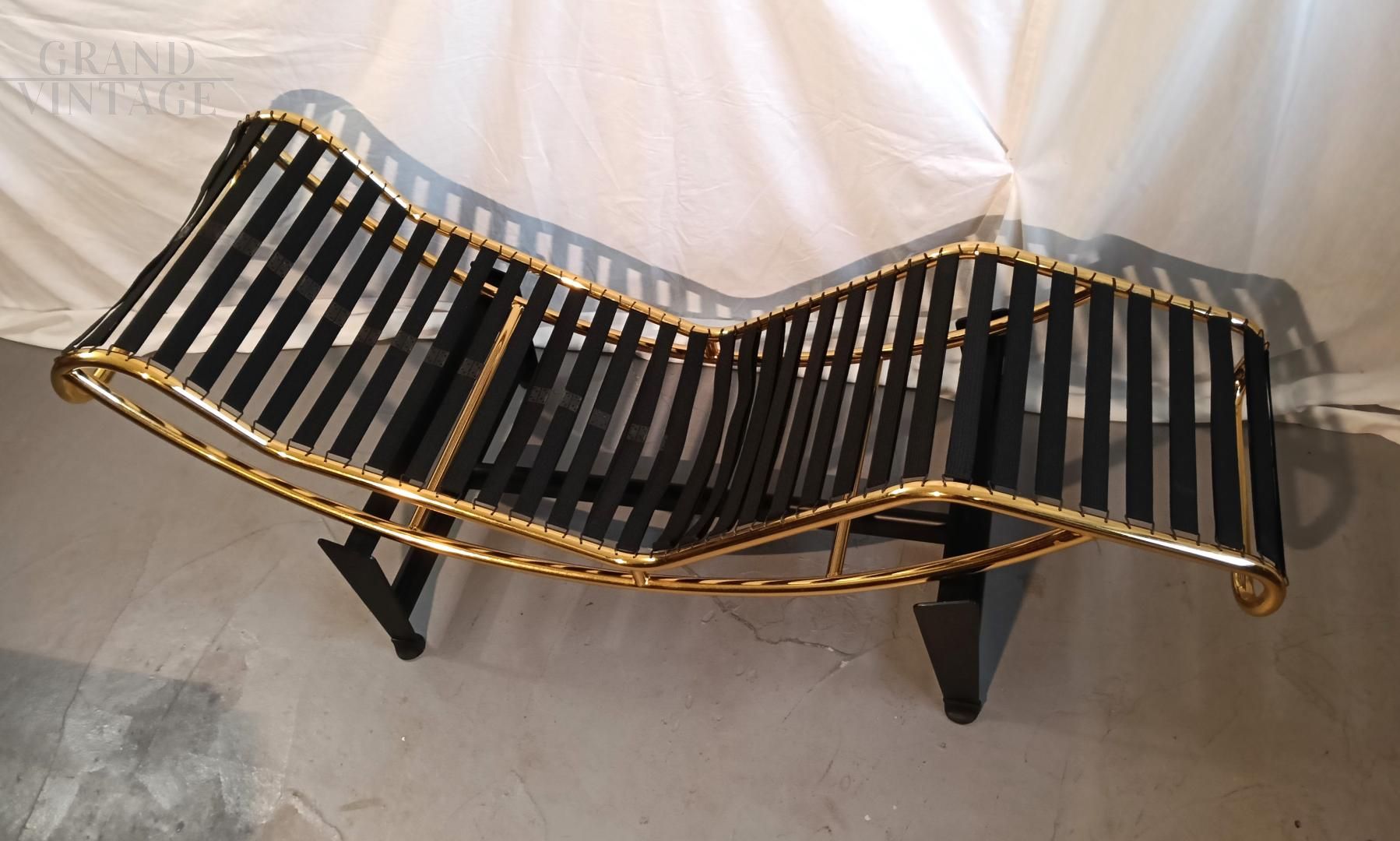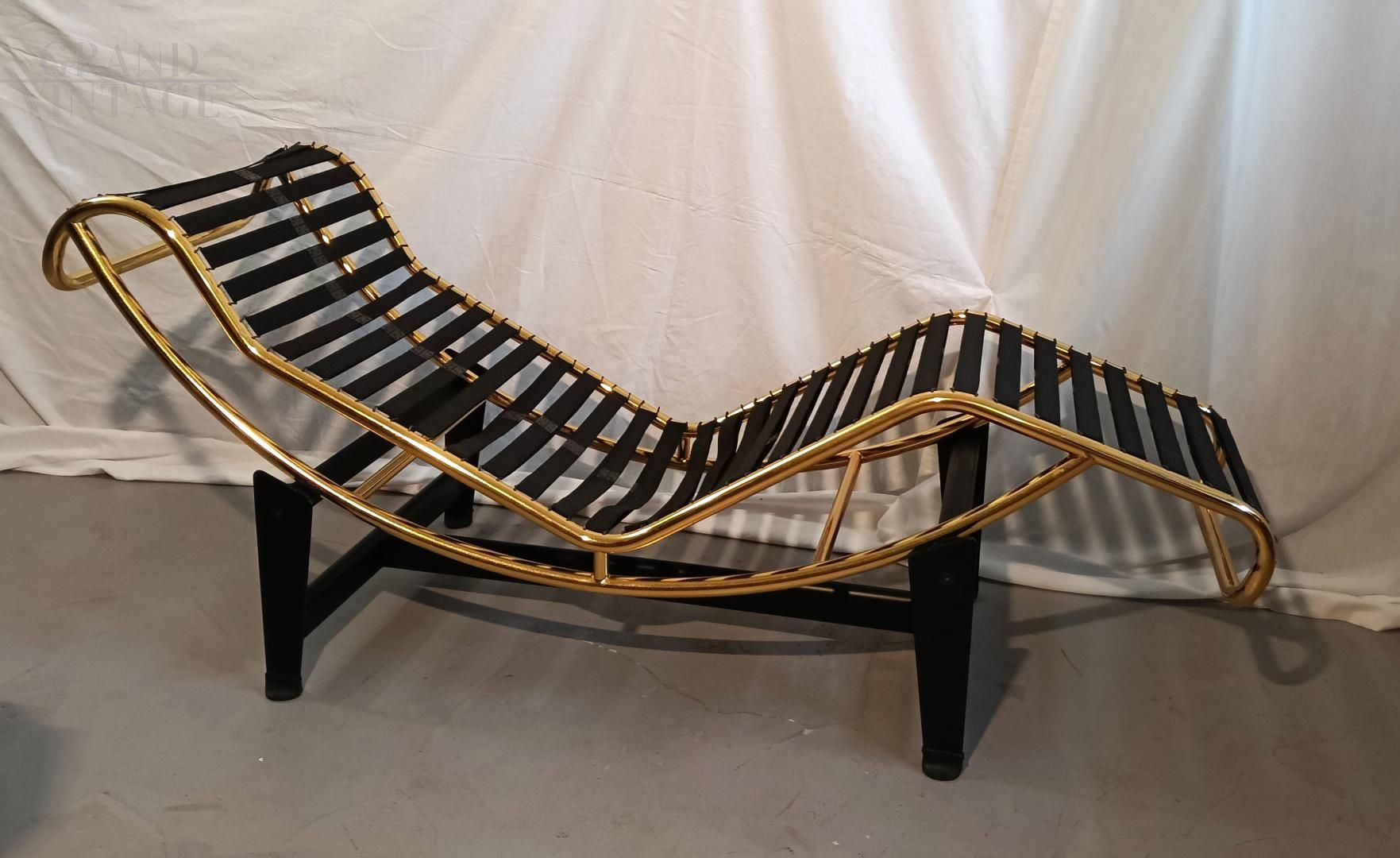 Chaise longue in stile LC4 di ispirazione Bauhaus, limited edition con marchio Pierre Cardin, anni '80. Fusto galvanizzato dorato, base nera con rivestimento in vera pelle di vitello marrone. La seduta è basculante.