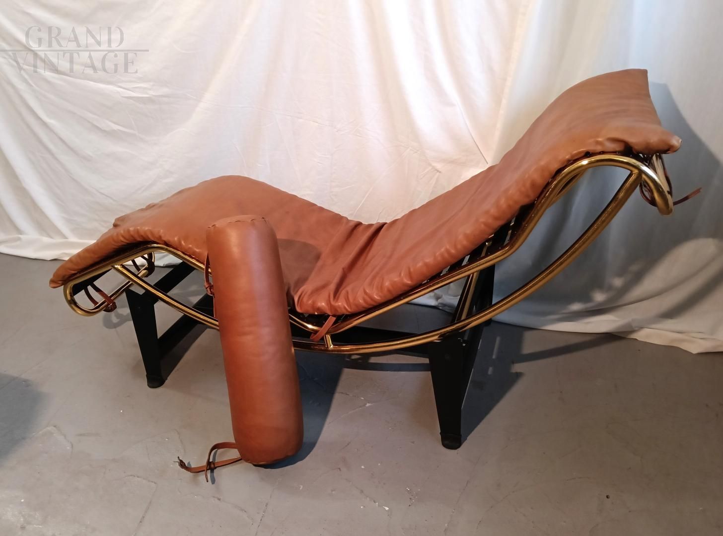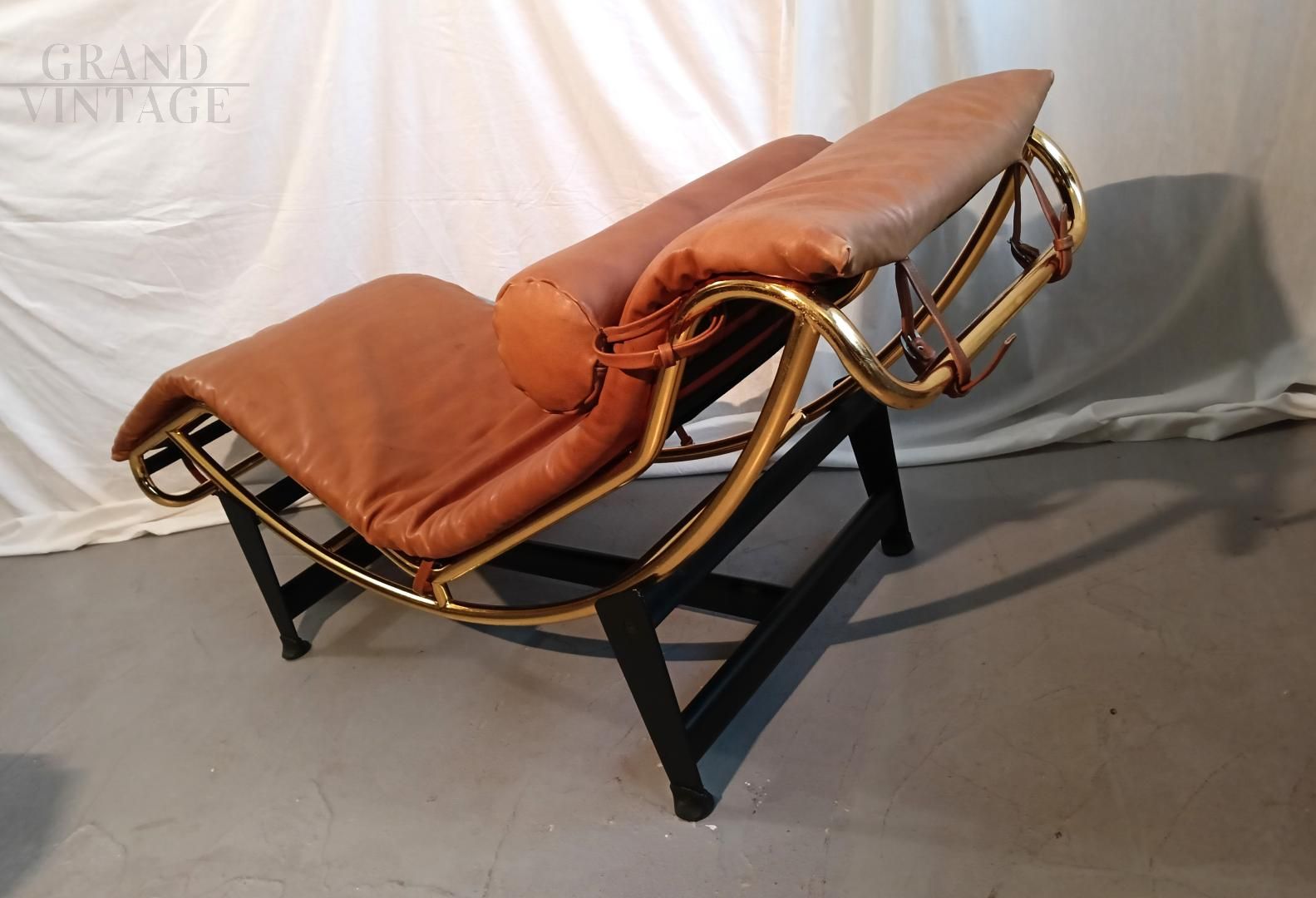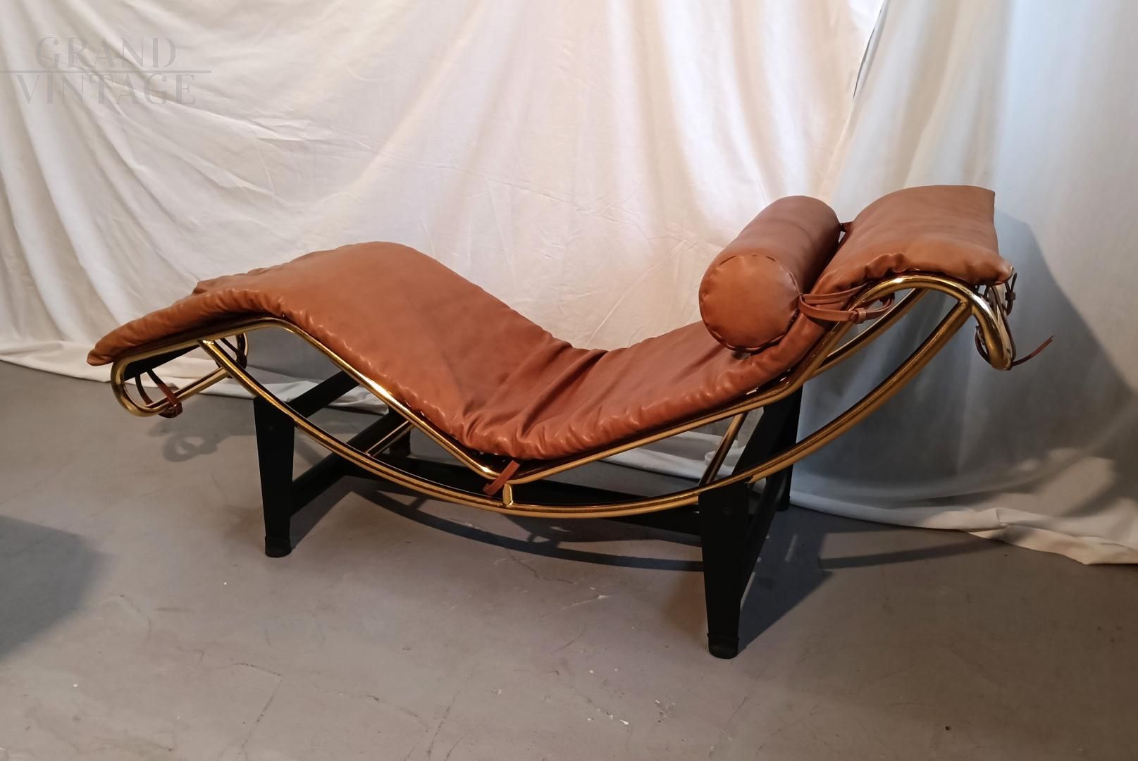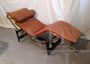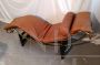 Chaise longue in stile LC4 di ispirazione Bauhaus, limited edition con marchio Pierre Cardin, anni '80. Fusto galvanizzato dorato, base nera con rivestimento in vera pelle di vitello marrone. La seduta è basculante.