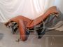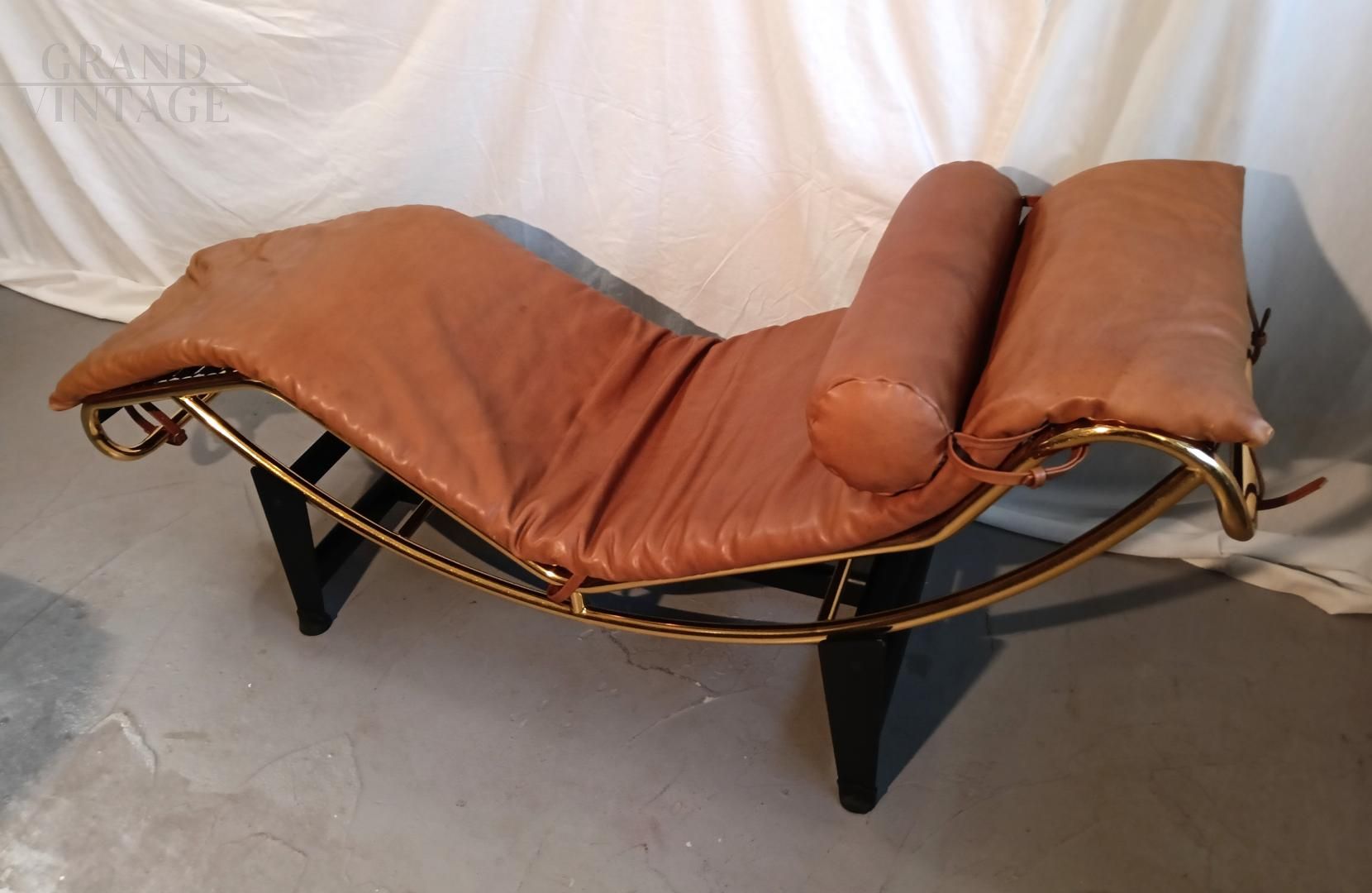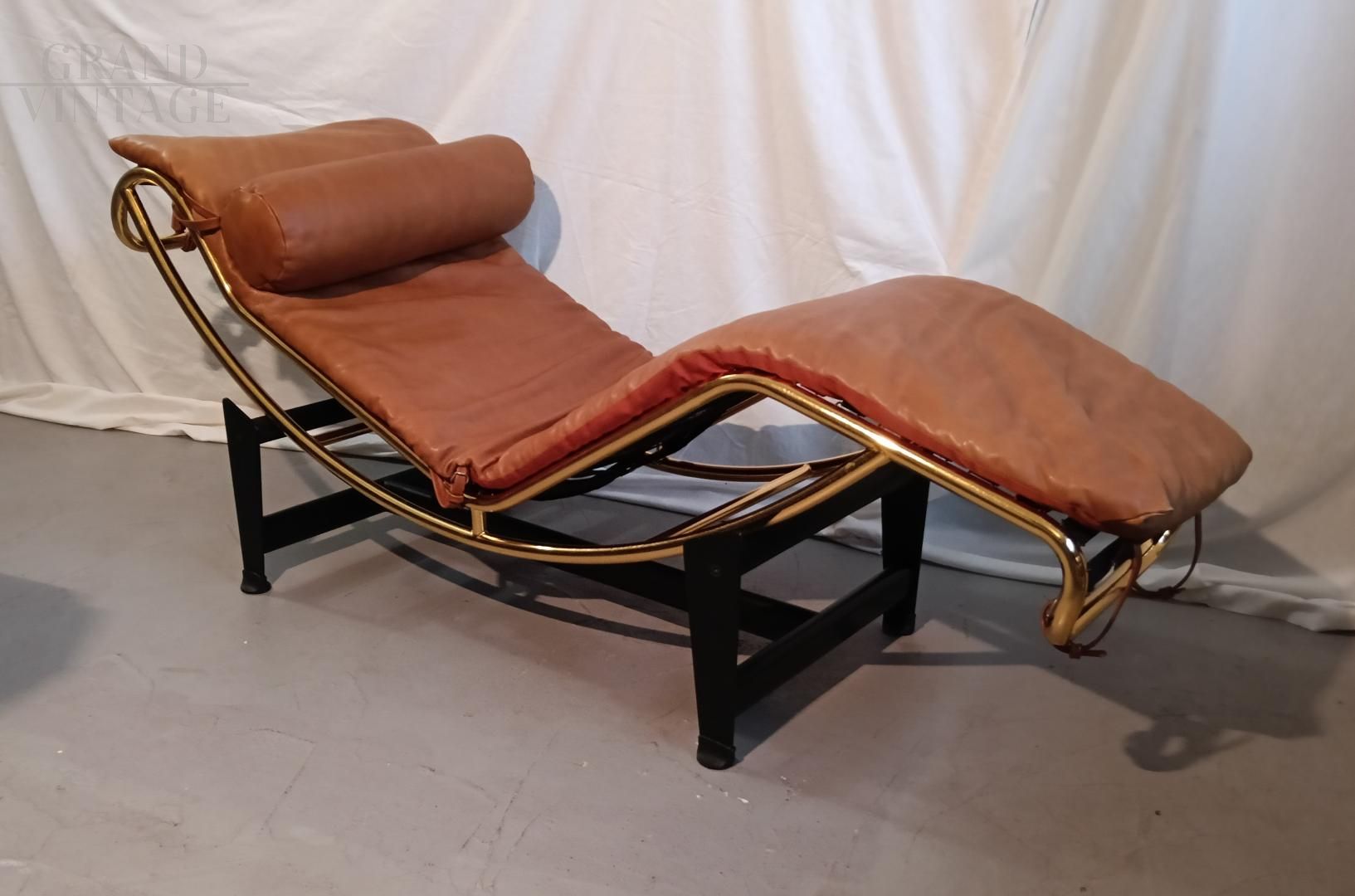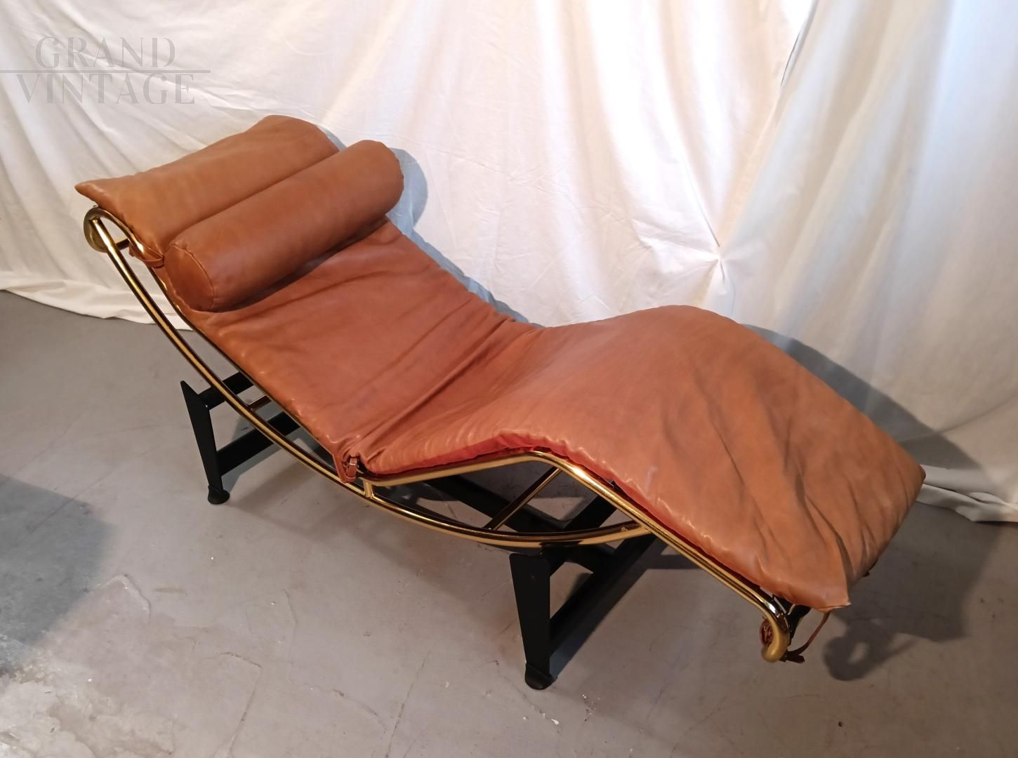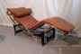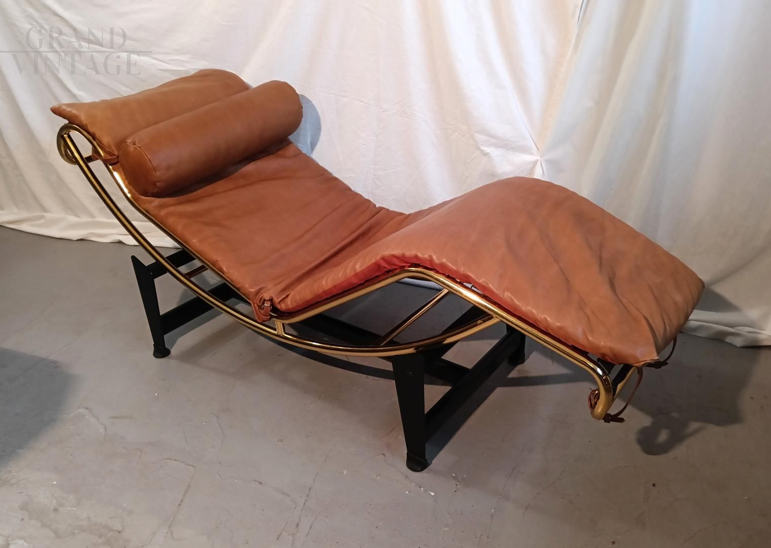 Chaise longue in stile LC4 di ispirazione Bauhaus, limited edition con marchio Pierre Cardin, anni '80. Fusto galvanizzato dorato, base nera con rivestimento in vera pelle di vitello marrone. La seduta è basculante.