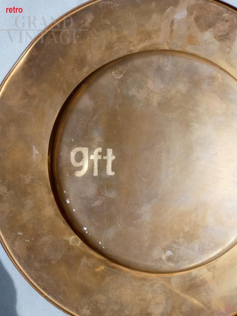 Ciotola centrotavola in peltro pesante con sottopiatto in ottone pesante. La ciotola ha un diametro di 33,5 cm con altezza 8 cm, peso 385 gr. Il piatto ha un diametro di 31,5 cm, altezza 2 cm, peso 182 gr. La ciotola è in fusione piena di peltro 95, marchiata e logata Cosi Tabellini. Il piatto è in ottone massiccio, marchio gft. Entrambi i pezzi risalgono agli anni 80/90.