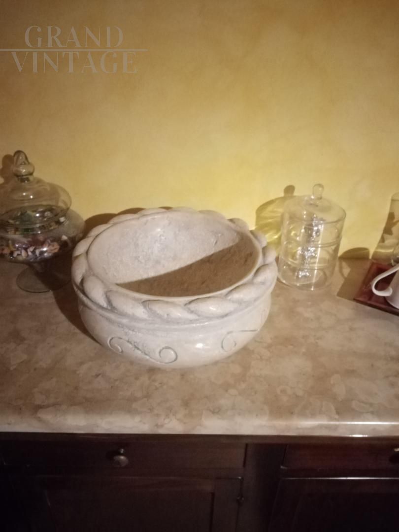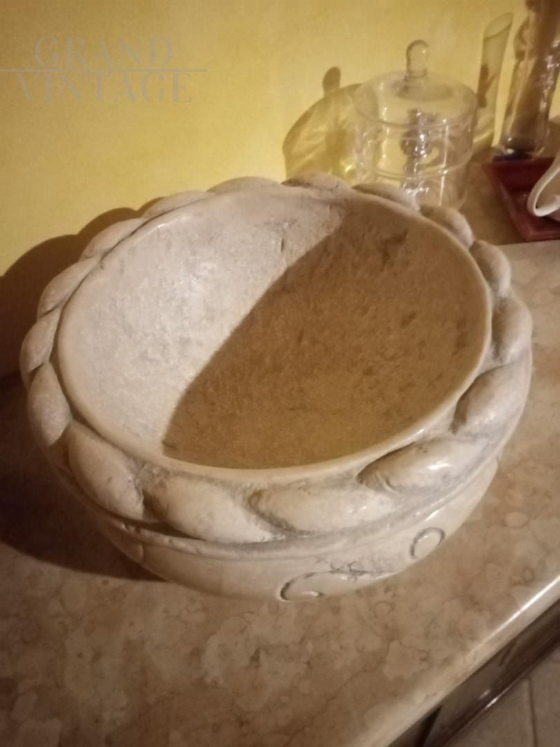 Ciotola in marmo bianco in stile antico, utilizzabile anche come piccola acquasantiera, realizzata e decorata artigianalmente in tempi recenti seguendo le tecniche antiche di lavorazione dei marmi.