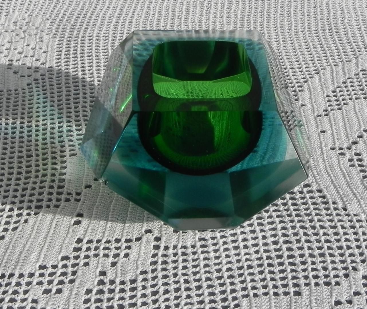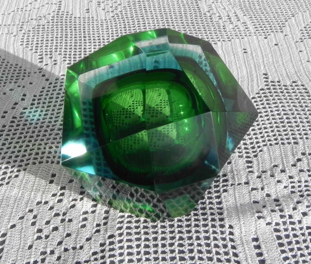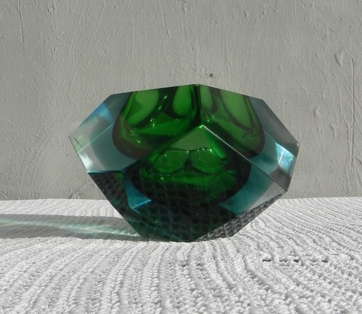Ciotola svuota tasche o posacenere design di Flavio Poli per Seguso in vetro di Murano sfaccettato con sfumature verdi e azzurre, a seconda dell'esposizione alla luce, Italia anni '70. Il posacenere è stato realizzato in vetro pieno da fusione, è in buone condizioni, porta qualche piccolo difetto su alcuni spigoli, come da foto.