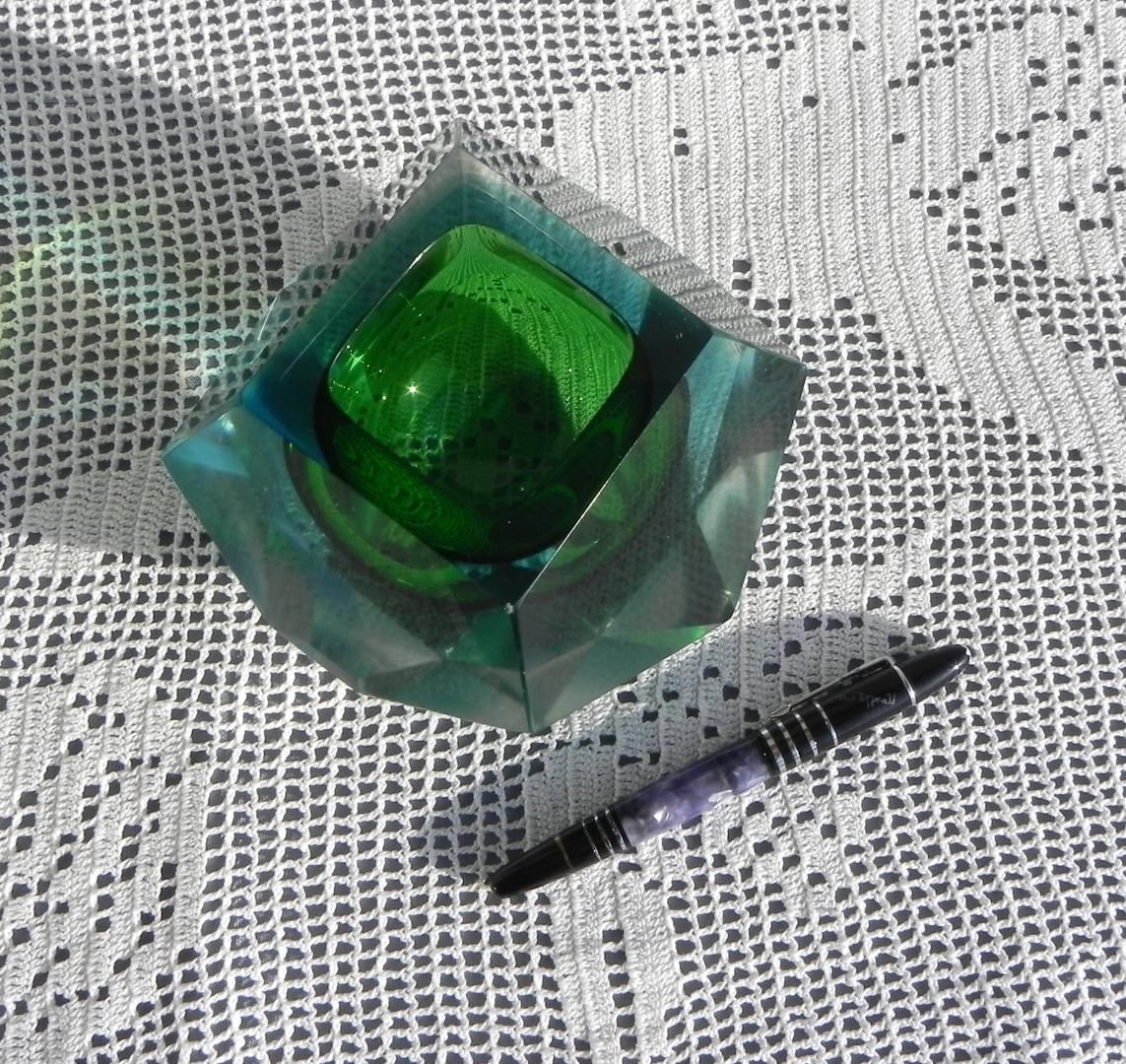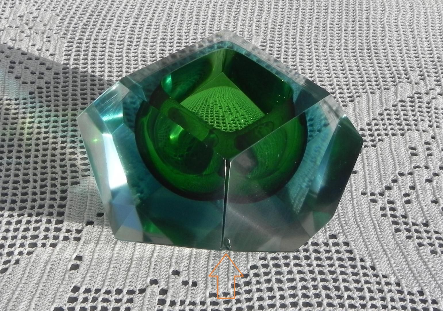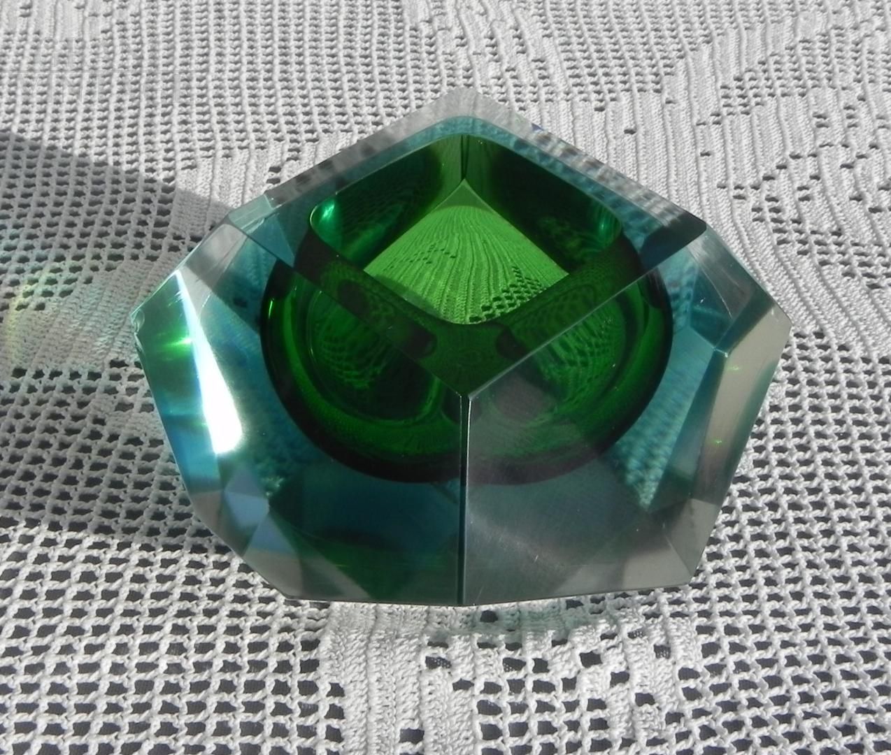 Ciotola svuota tasche o posacenere design di Flavio Poli per Seguso in vetro di Murano sfaccettato con sfumature verdi e azzurre, a seconda dell'esposizione alla luce, Italia anni '70. Il posacenere è stato realizzato in vetro pieno da fusione, è in buone condizioni, porta qualche piccolo difetto su alcuni spigoli, come da foto.