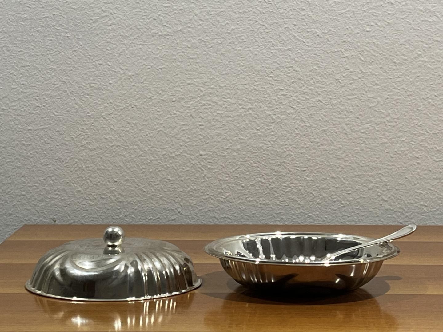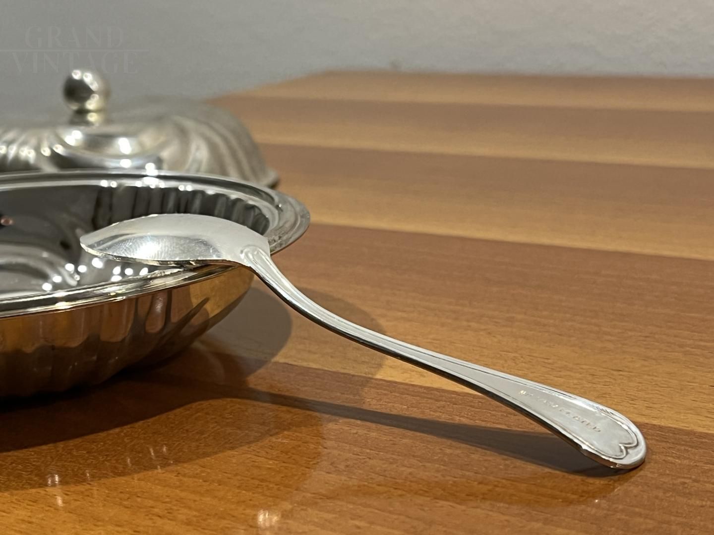 Ciotola vassoio vintage in argento placcato con coperchio e cucchiaino inclusi, anni '40.