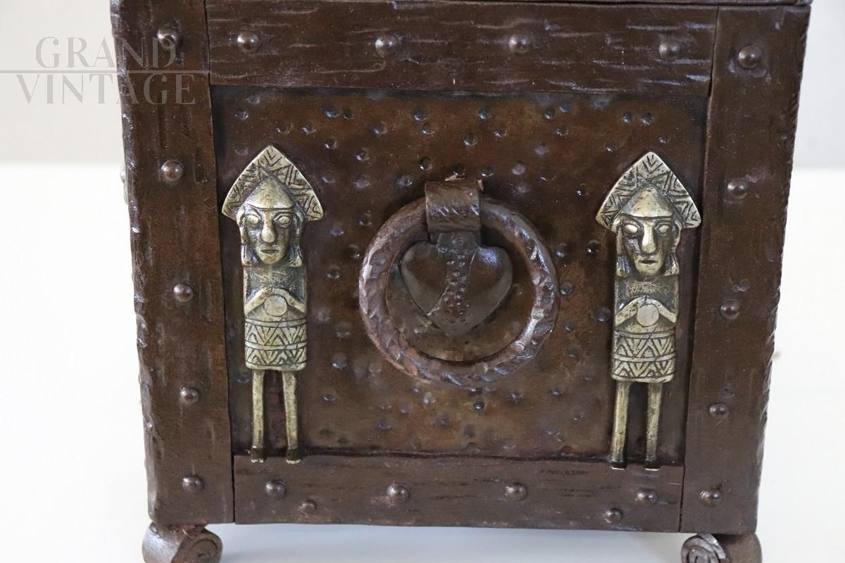 Bellissima e rara piccola scatola portagioie databile all'inizio del XX secolo; realizzata interamente in ferro con decorazioni in ottone, questo portagioie ha caratteristiche di ispirazione gotica. Un oggetto decorativo unico con un fantastico fascino antico. Si può scegliere di utilizzarlo in vari modi, per contenere documenti, piccoli oggetti o gioielli. Esposto su un comò o una credenza antica, catturerà sicuramente l'attenzione e la curiosità di tutti i vostri ospiti. Si noti che la serratura è presente ma manca la chiave. Nel caso desideraste ripristinare la serratura è possibile trovare una chiave compatibile, che ovviamente non sarà quella originale.Ottime condizioni. prezzo trattabile.