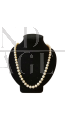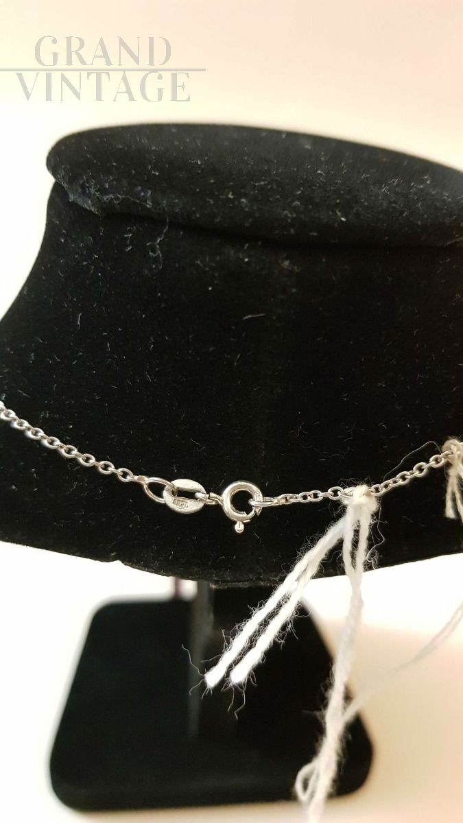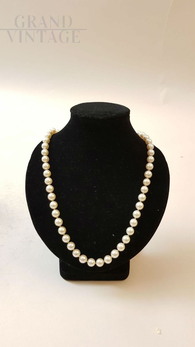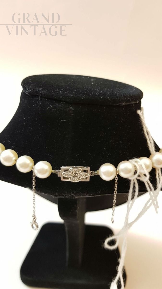 Collier vintage in perle di coltura diametro variabile da 7,4 a 7,8 mm, con montatura in oro grigio 18 K e piccoli diamanti.