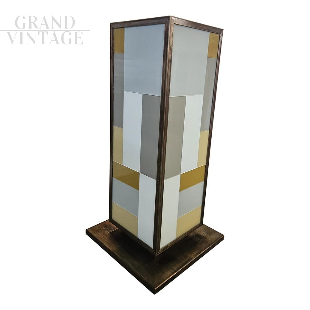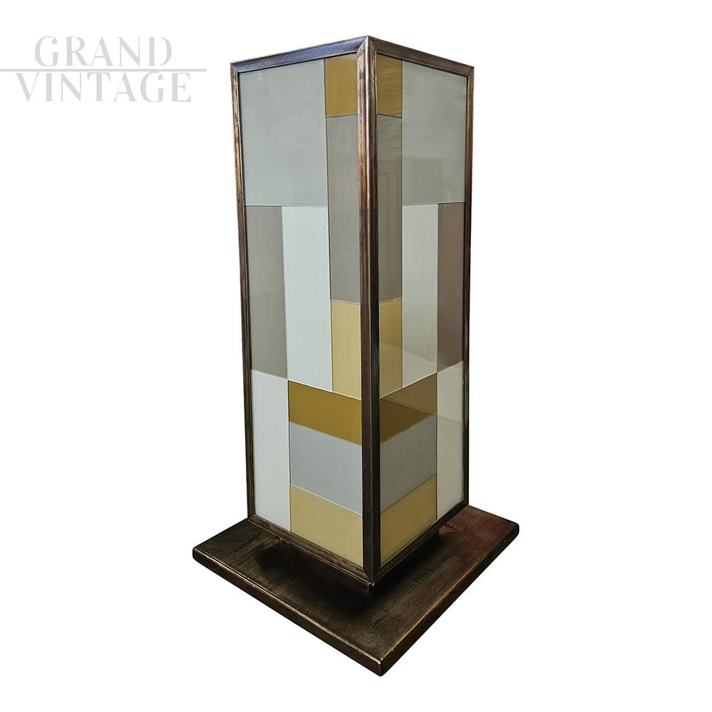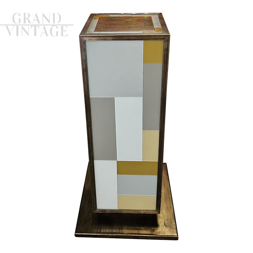 Coppia di colonne decorative basse a sezione quadrata interamente realizzate a mano in ottone e vetro di Murano multicolore.