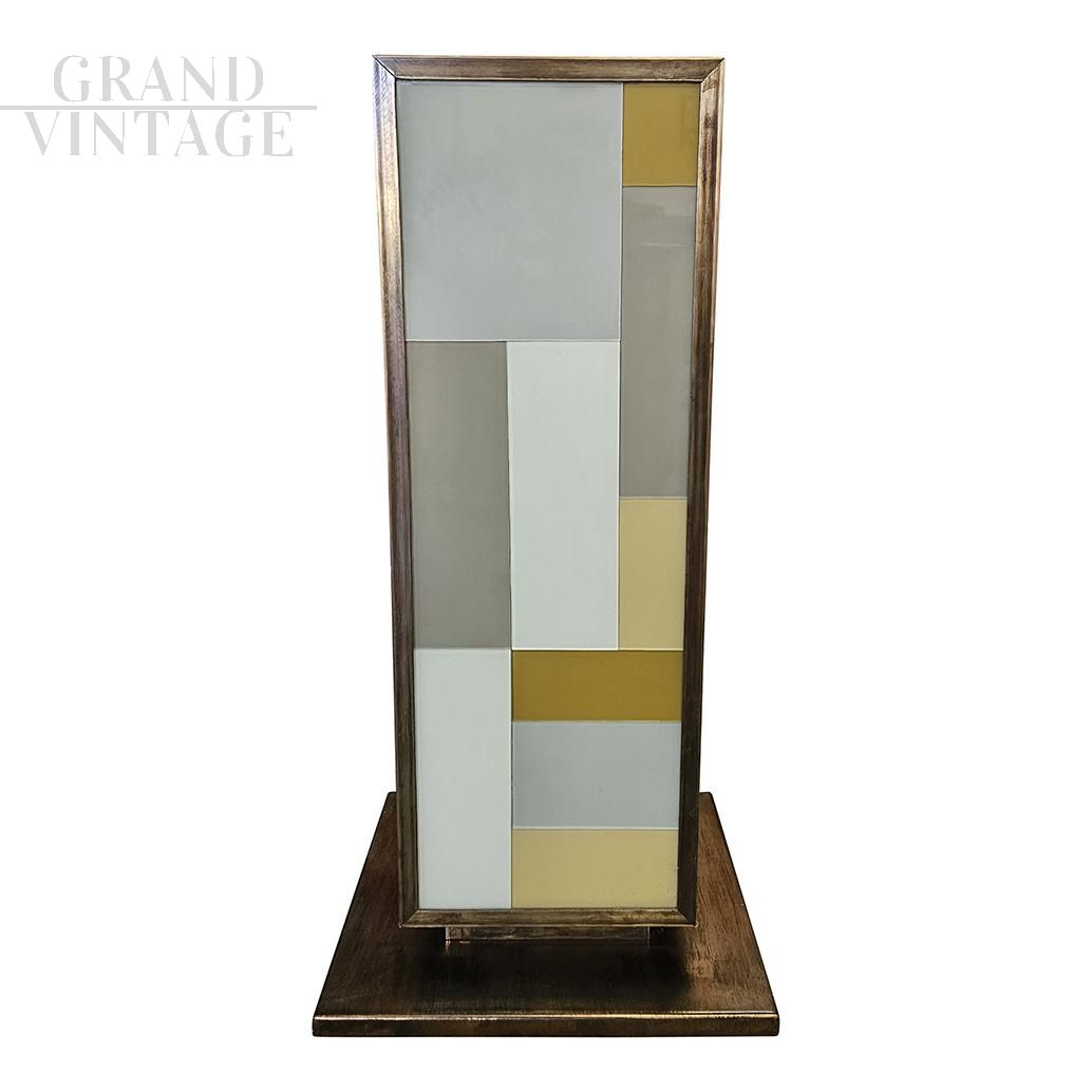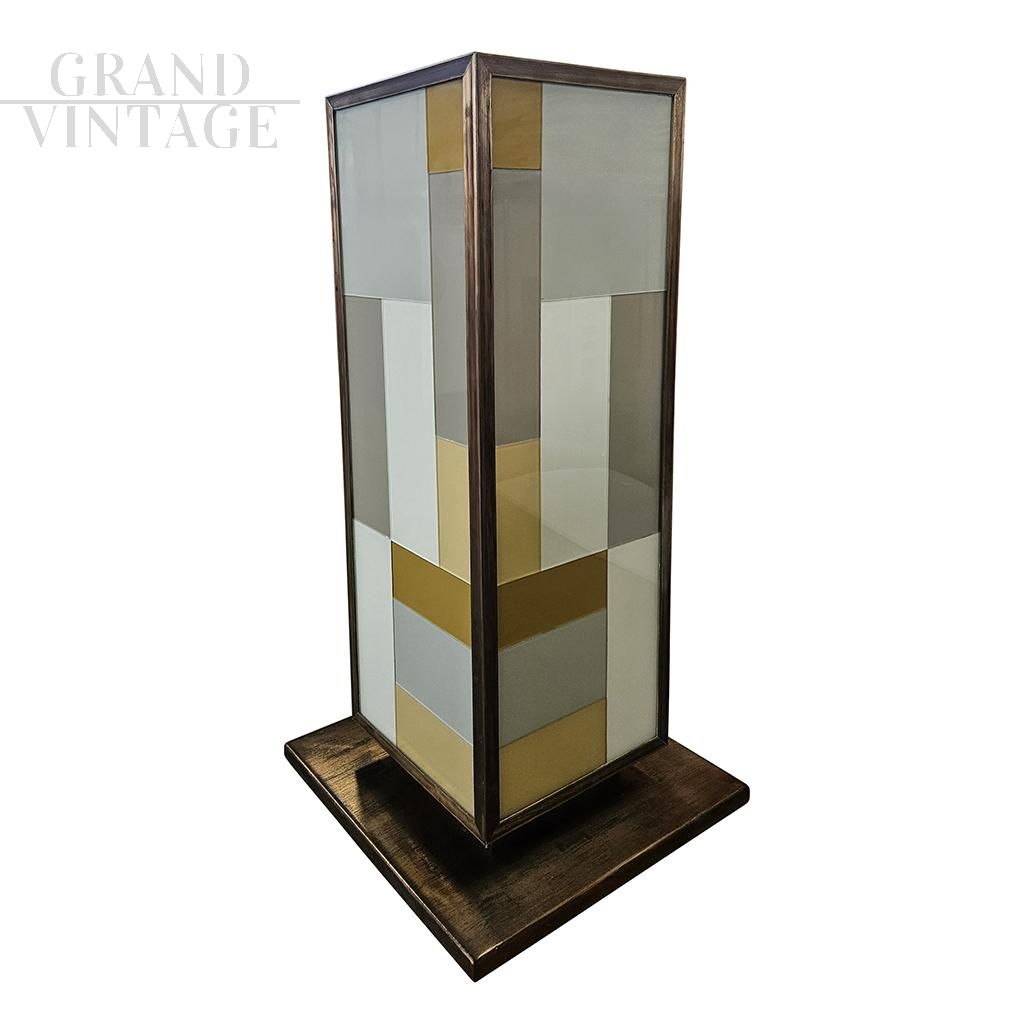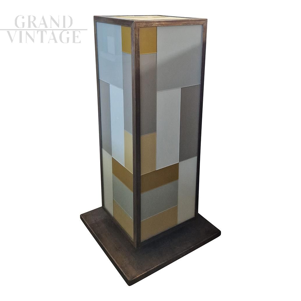 Coppia di colonne decorative basse a sezione quadrata interamente realizzate a mano in ottone e vetro di Murano multicolore.