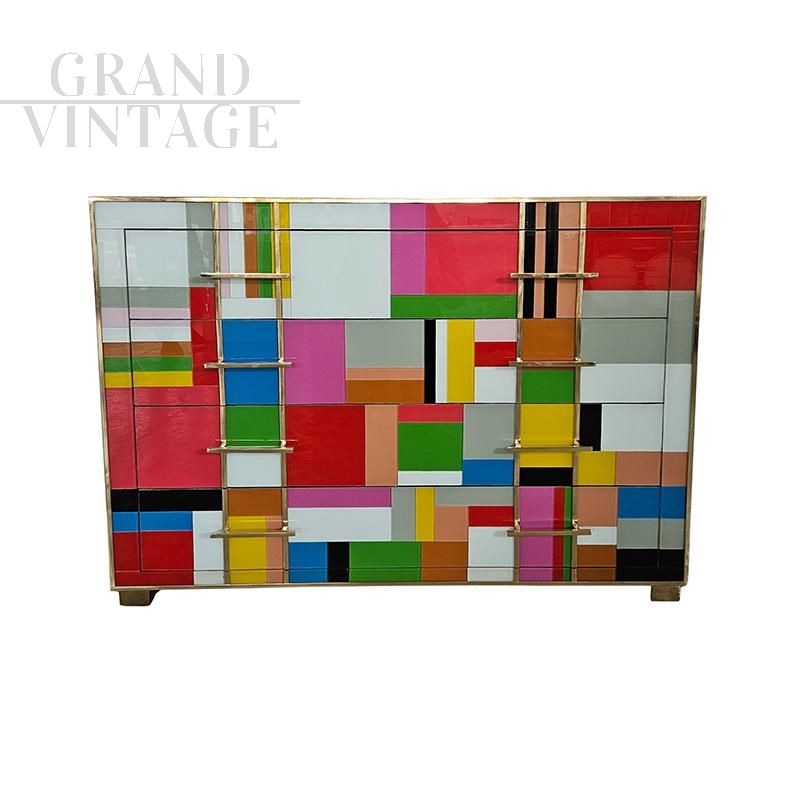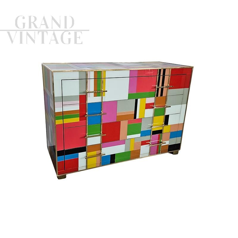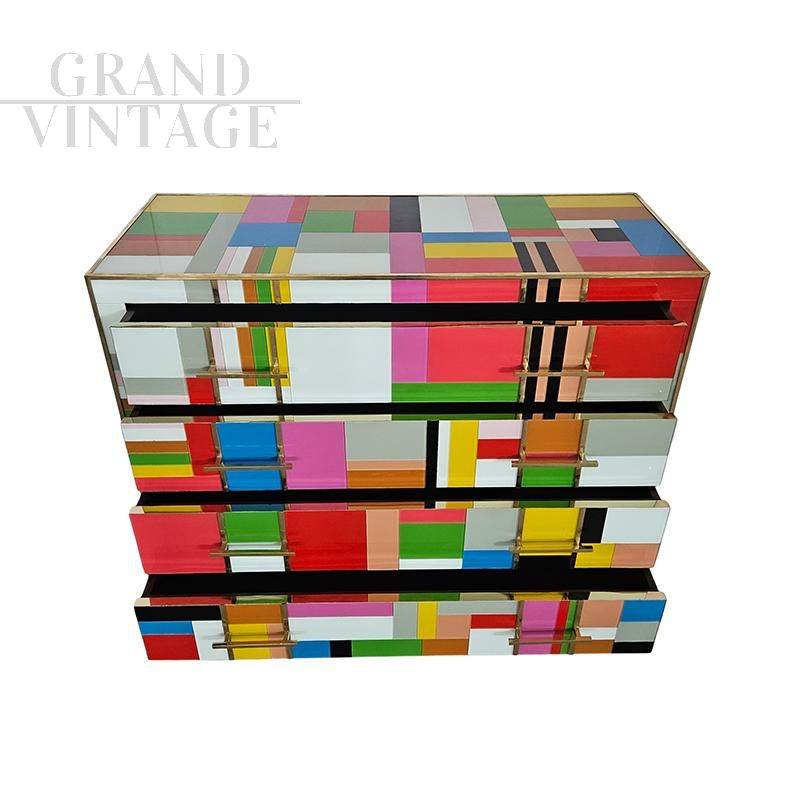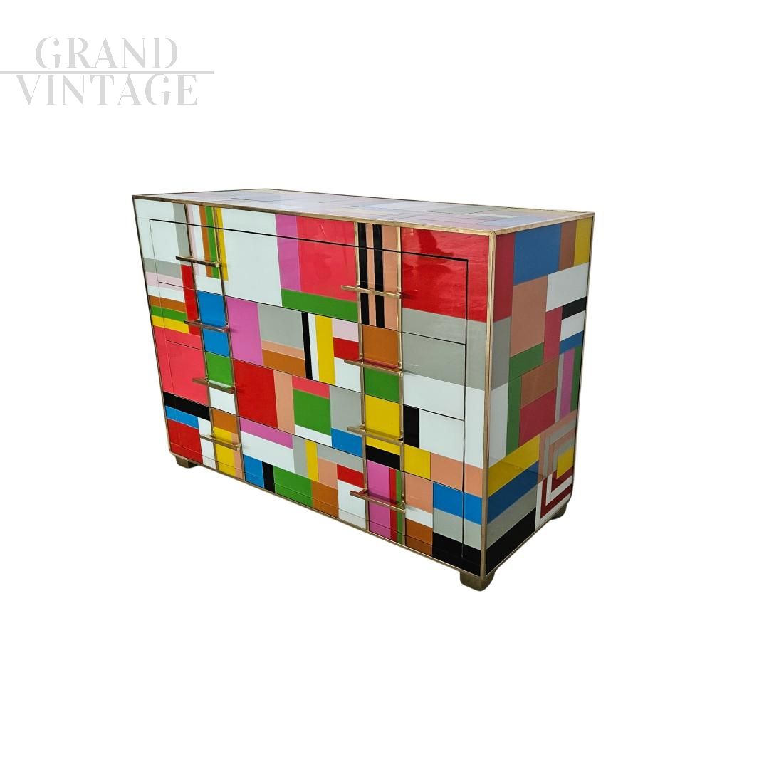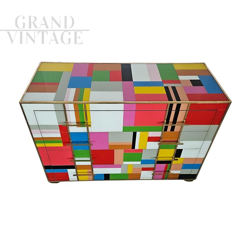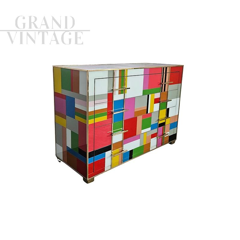 Comò a 4 cassetti, interamente realizzato a mano, con struttura in legno, ricoperto in vetro multicolore; profili e piedi in ottone dorato.