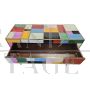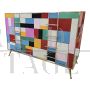Comò a 4 cassetti interamente realizzato a mano con struttura in legno, ricoperto in vetro multicolore; profili e piedi in ottone dorato.