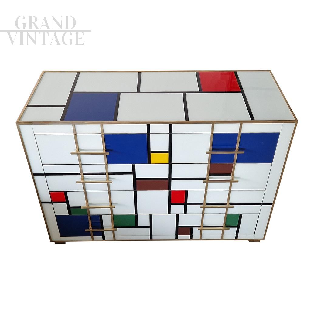 Comò in vetro di Murano multicolore stile Mondrian con 4 cassetti