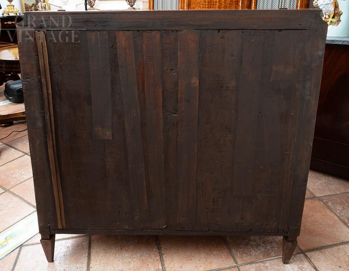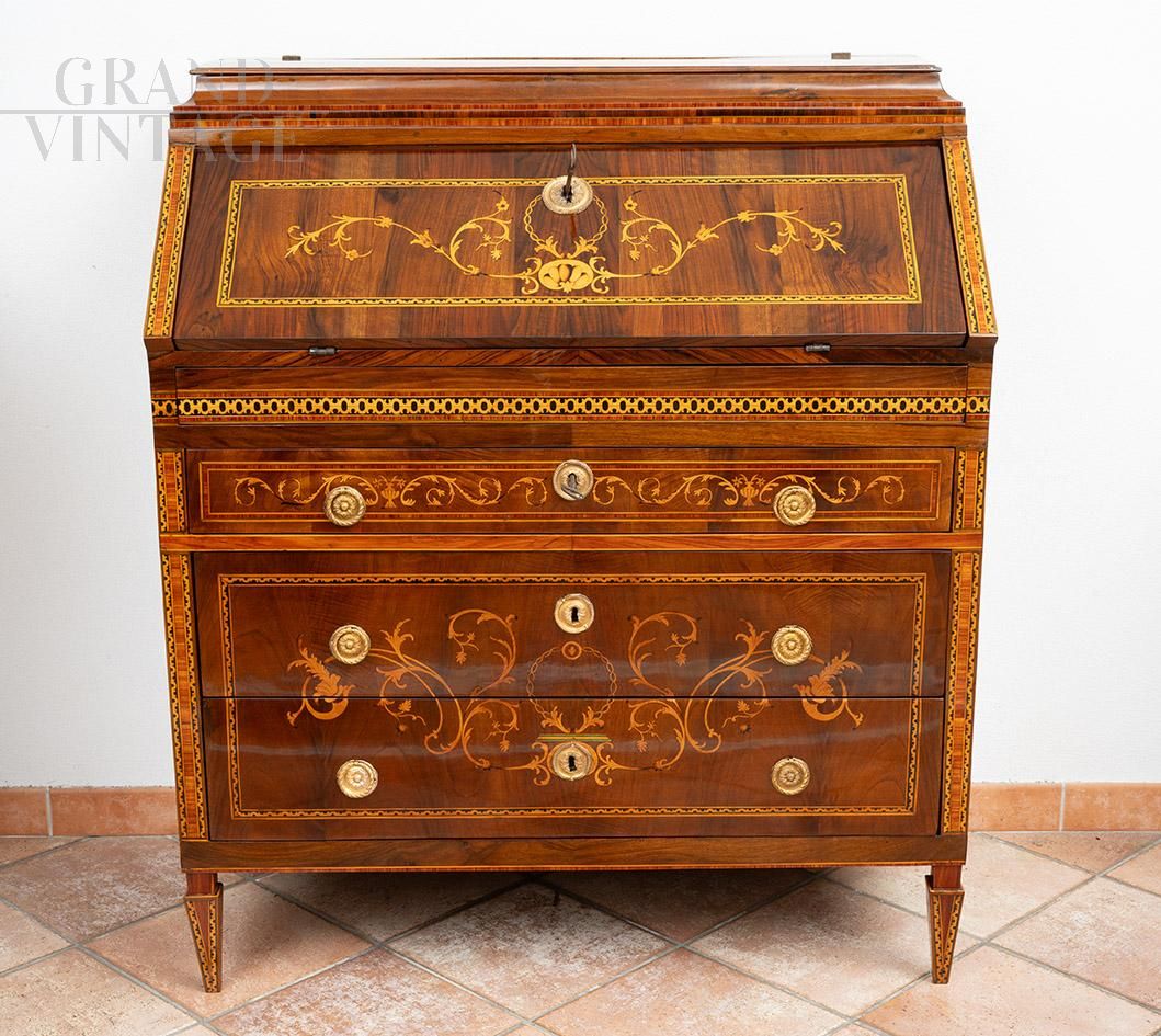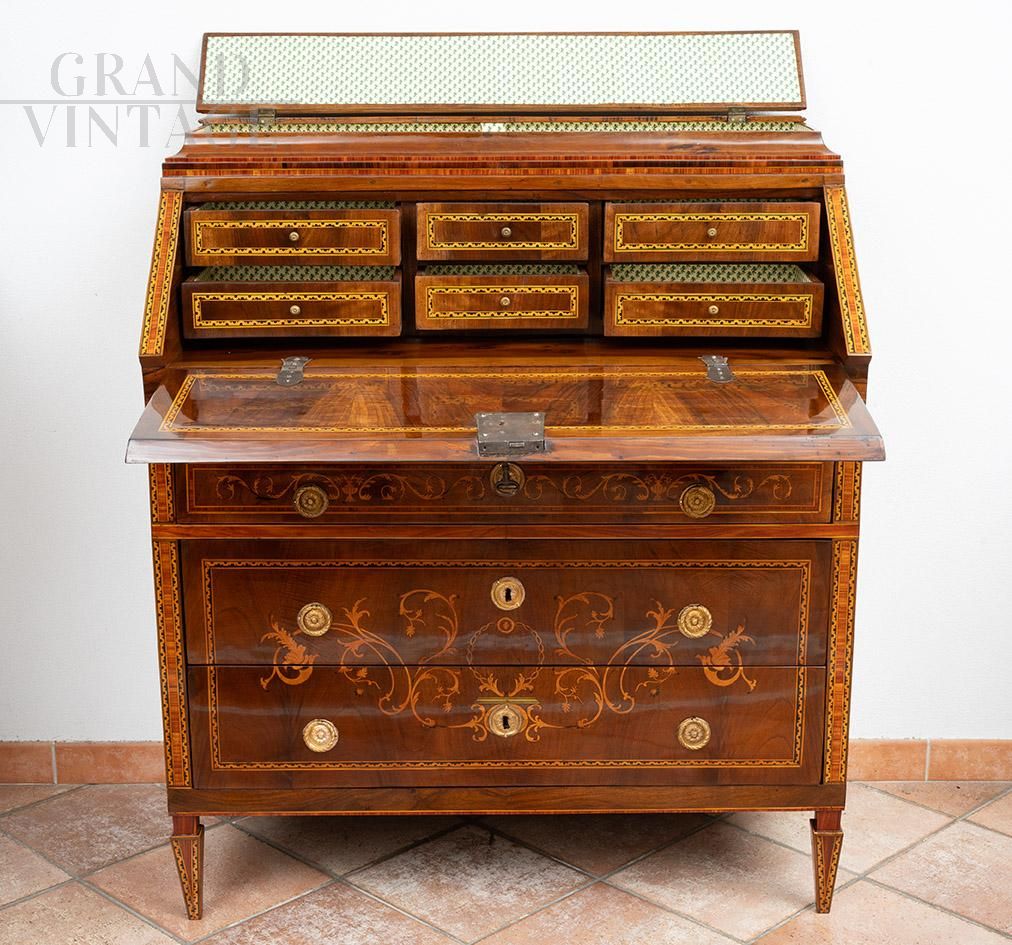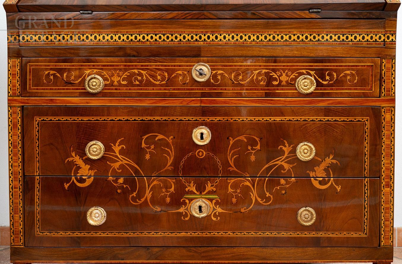 Comò antico a ribalta con tre cassetti, struttura lastronata in legni esotici e intarsi con essenze lignee pregiate, sormontato da un piano reclinabile con all'interno un vano portaoggetti. Il fronte è scandito da tre cassetti di cui uno più piccolo sottopiano esaltato dalla presenza di un fitto intarsio a racemi. I due cassetti più grandi presentano lo stesso intarsio a racemi e sono messi in risalto dalla presenza di bocchette e maniglie dorate. Sui laterali e sugli spigoli si ripete lo stesso impianto del fronte con al centro una conchiglia. La ribalta presenta all'interno sei cassetti portaoggetti estraibili tramite pomelli in bronzo. Tipici piedini tronco piramidali con strozzatura nobilitati da filetti disposti di testa a sottolineare gli angoli.