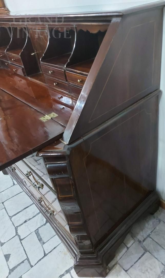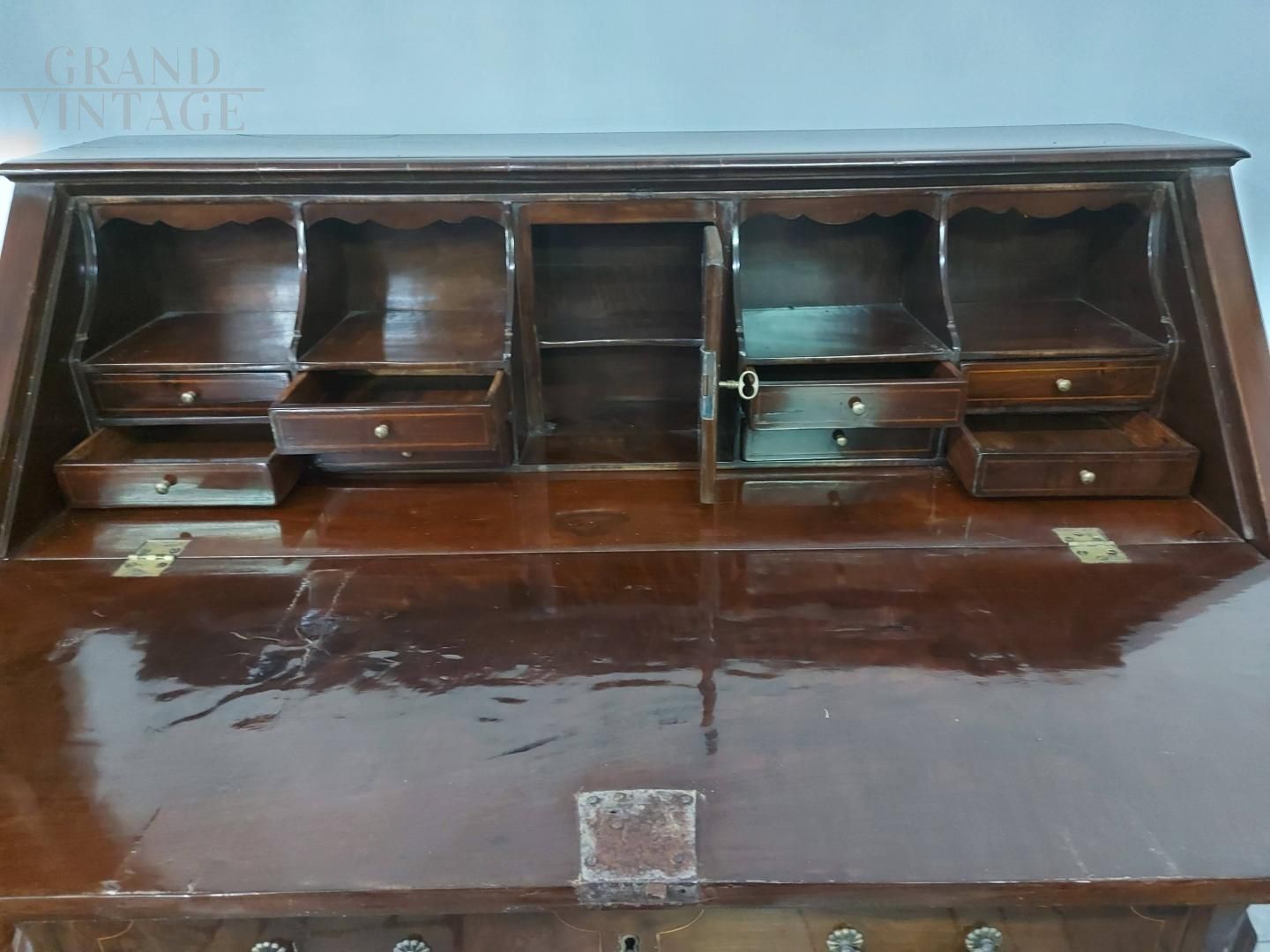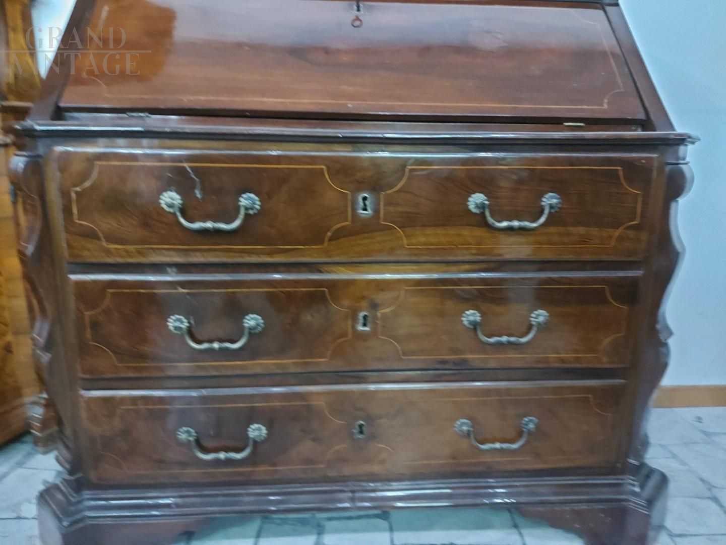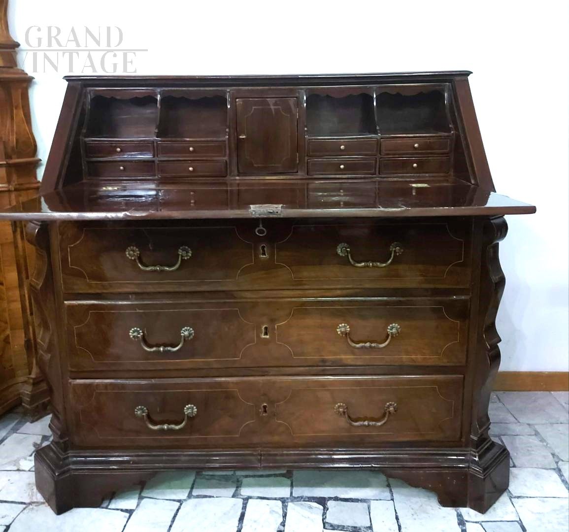 Comò antico con ribalta in legno di noce lastronato e filettato in legno di bosso anche sui lati, con maniglie in bronzo originale, interno con cassettini e segreti, piano a carattere. Epoca tardo Luigi XVI, Italia.