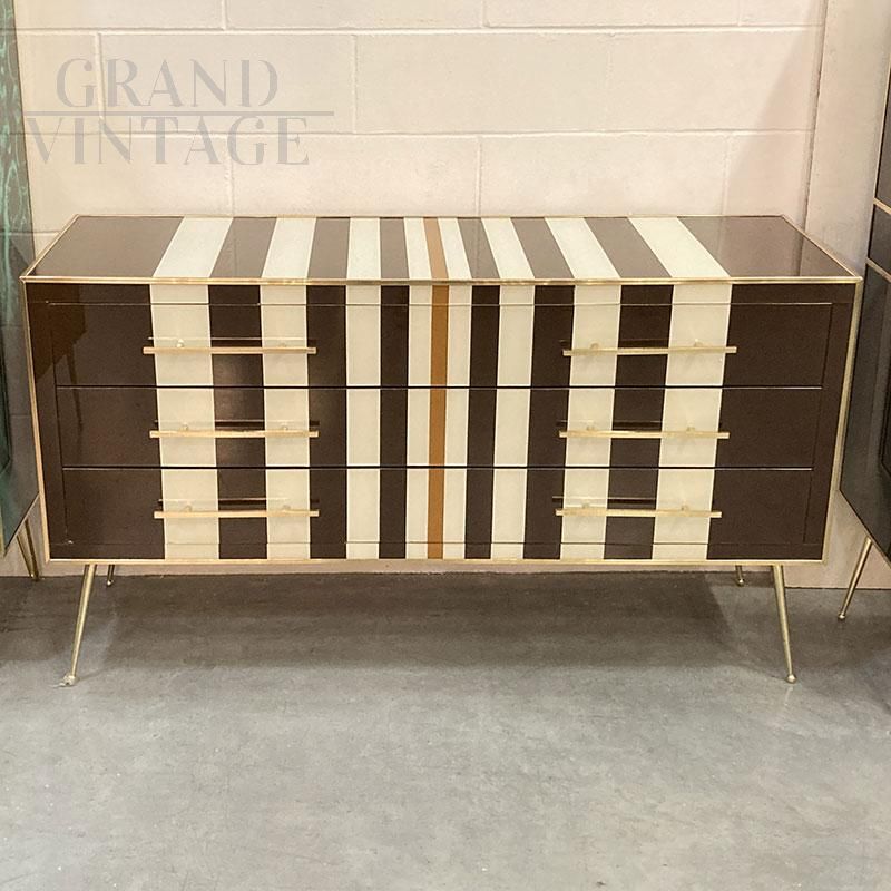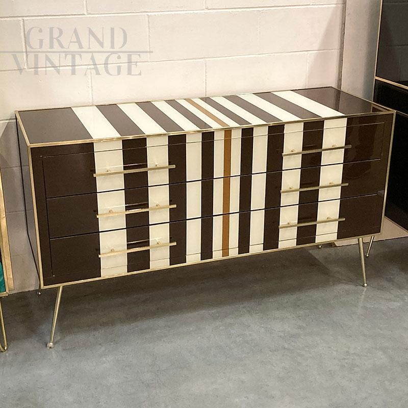 Comò con tre cassetti interamente realizzato a mano, con struttura in legno e finiture superficiali in vetro di Murano a strisce multicolore; profili, maniglie e piedi in metallo cromato.