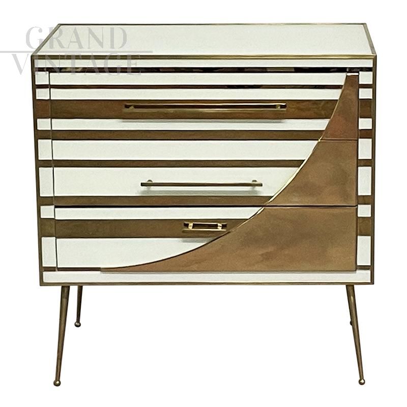 Comò a tre cassetti, interamente realizzato a mano, con struttura in legno e rivestito in vetro bianco e oro, con profili maniglie e piedi in ottone dorato.