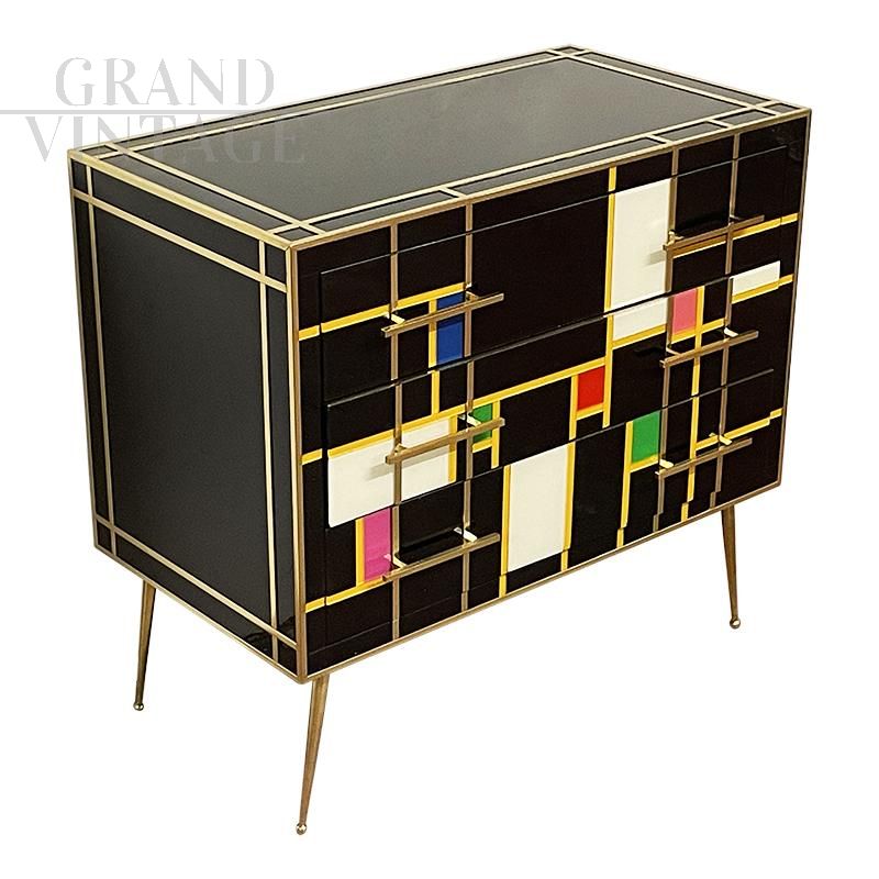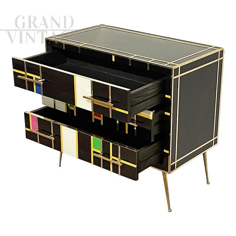 Comò a tre cassetti interamente realizzato a mano, con struttura in legno e ricoperto in vetro nero e colorato, con profili, maniglie e piedi in ottone dorato.