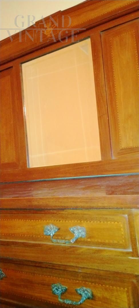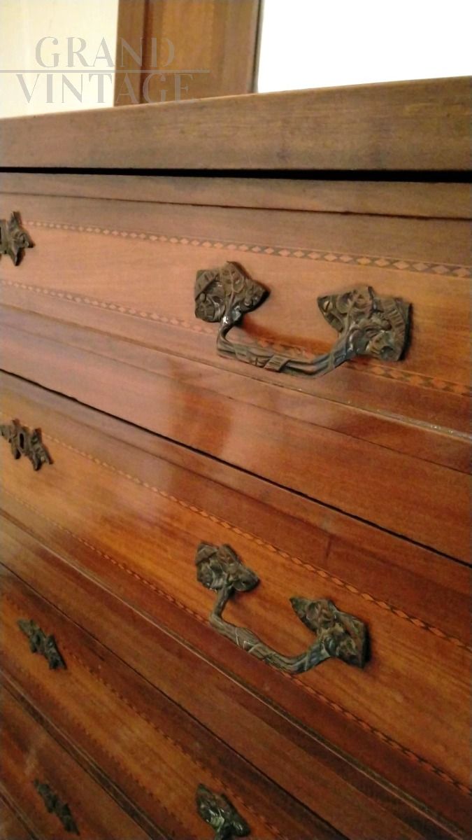 Cassettone comò anni '40 con specchiera, intarsiato sui cassetti e sulla cornice dello specchio.