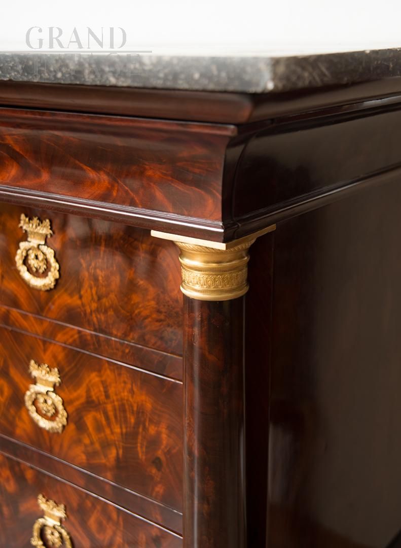 Cassettone comò Impero francese in piuma di mogano con piano in marmo nero del Belgio. Il fronte è scandito da tre grandi cassetti adornati con belle bocchette in bronzo dorato finemente cesellate a motivo floreale. Il cassetto sottopiano risulta essere più piccolo degli altri ed è svasato verso l'alto. I due cantoni sono caratterizzati da due colonne in piuma di mogano terminanti con capitelli e base in bronzo dorato finemente cesellato.