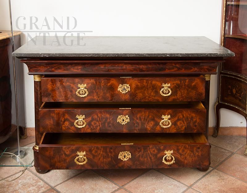 Comò antico Impero Francese in piuma di mogano con piano in marmo