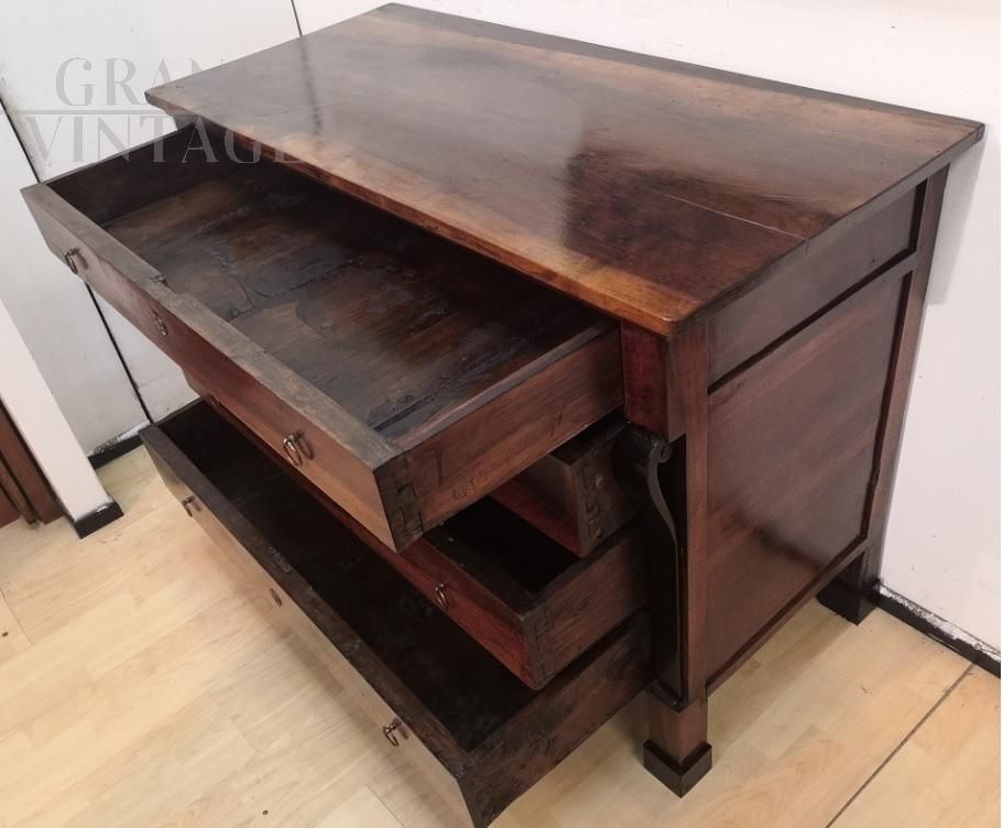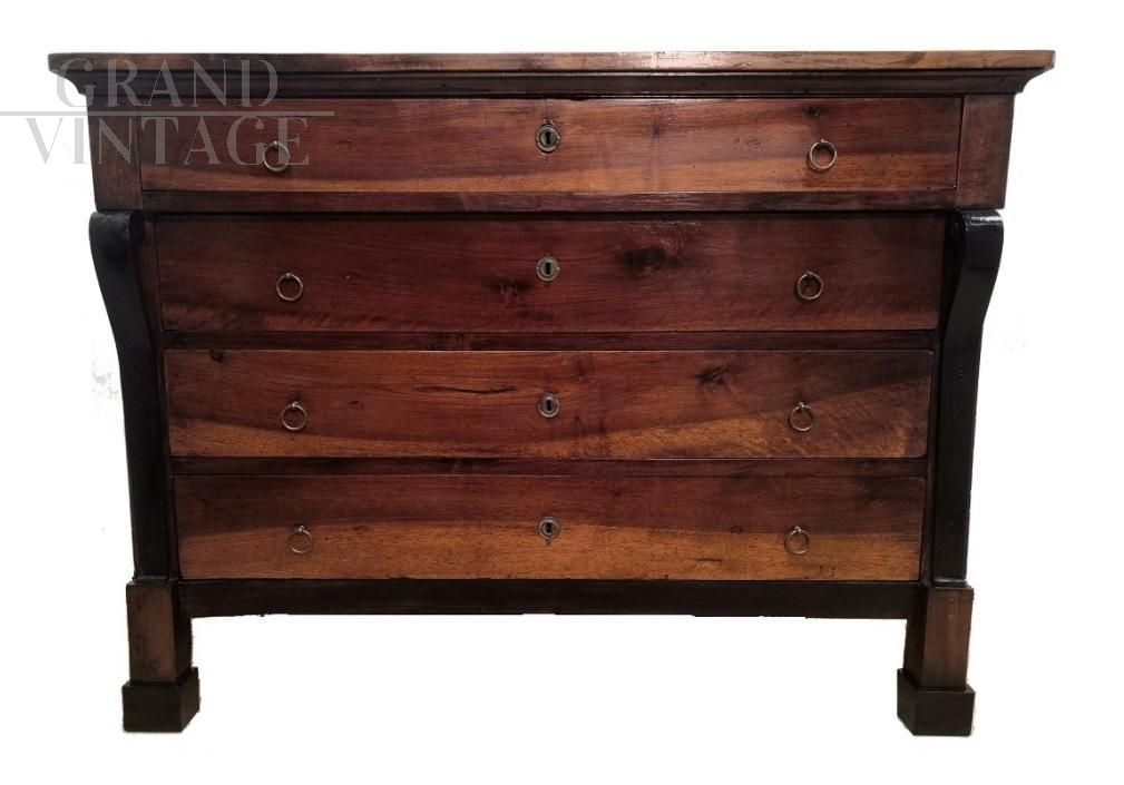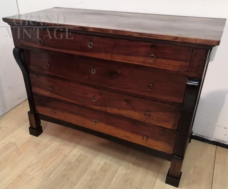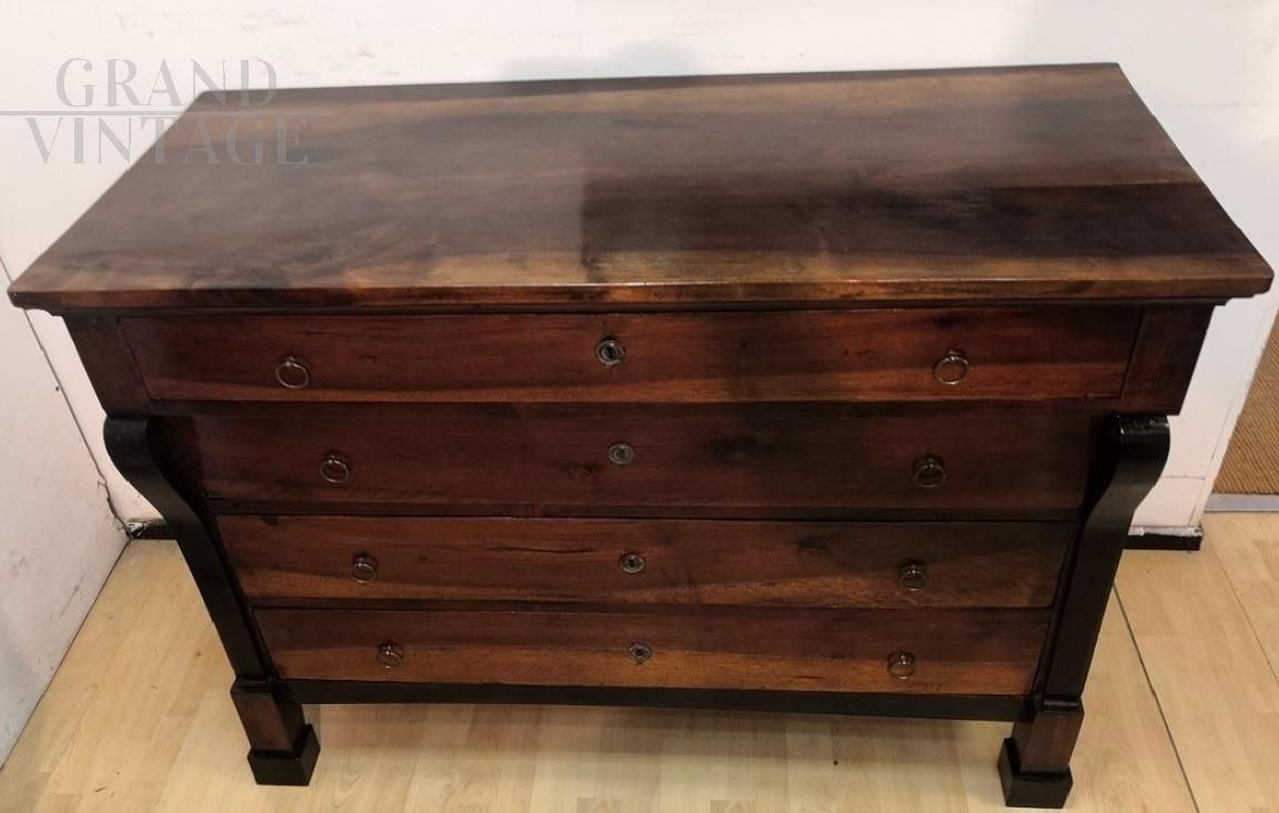 Comò periodo Impero italiano dei primi dell'800, con 4 cassetti, costruito in legno di noce nazionale. Il cassettone è decorato da colonne a cravatta e ha piedi quadrati ebanizzati. La struttura e i frontali sono in legno di noce nazionale, l'interno dei cassetti e lo schienale sono in legno di abete. I cassetti sono completi di pomoli a ciondolo con bocchette e serrature originali. Mobile restaurato in ottimo stato conservativo, finiture in patina originale gommalacca e cere.