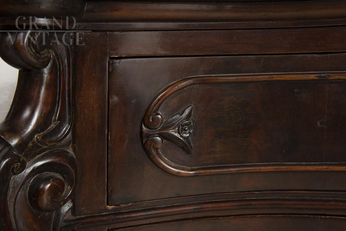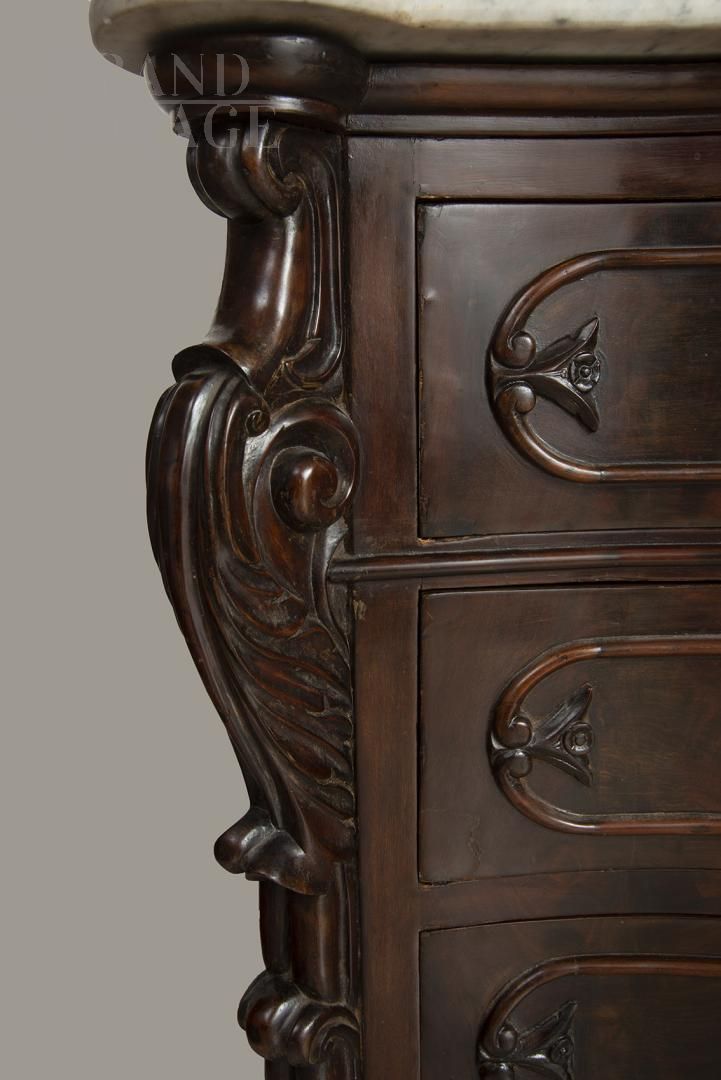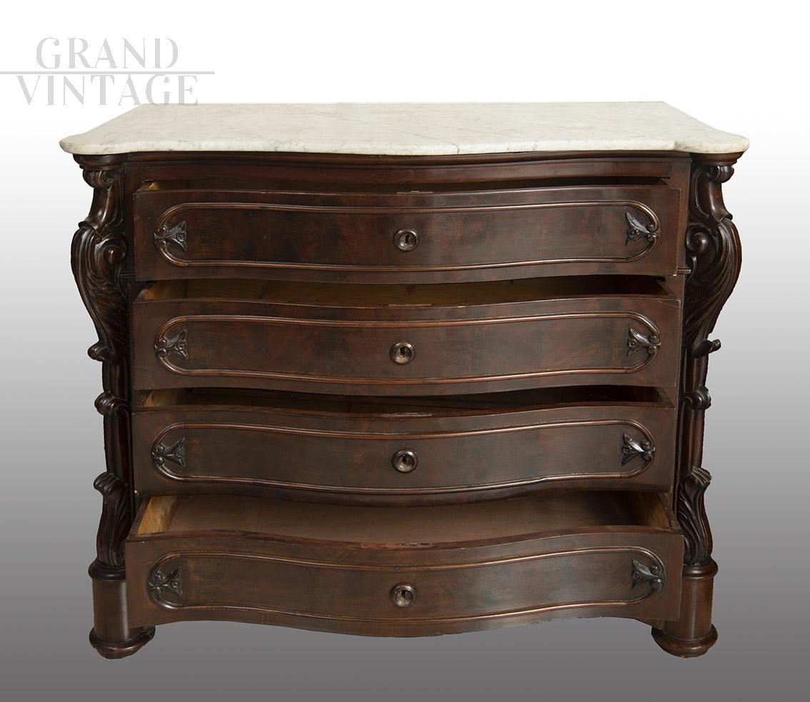 Comò cassettone antico Luigi Filippo Napoletano in piuma di mogano con piano in marmo bianco Carrara. Il fronte curvilineo è caratterizzato da quattro cassetti con interni in acero bordati da profili in legno con palmette negli angoli. I piedi a cuscinetto sono collegati da una base mistilinea, mentre i cantoni sono intagliati a motivo vegetale.