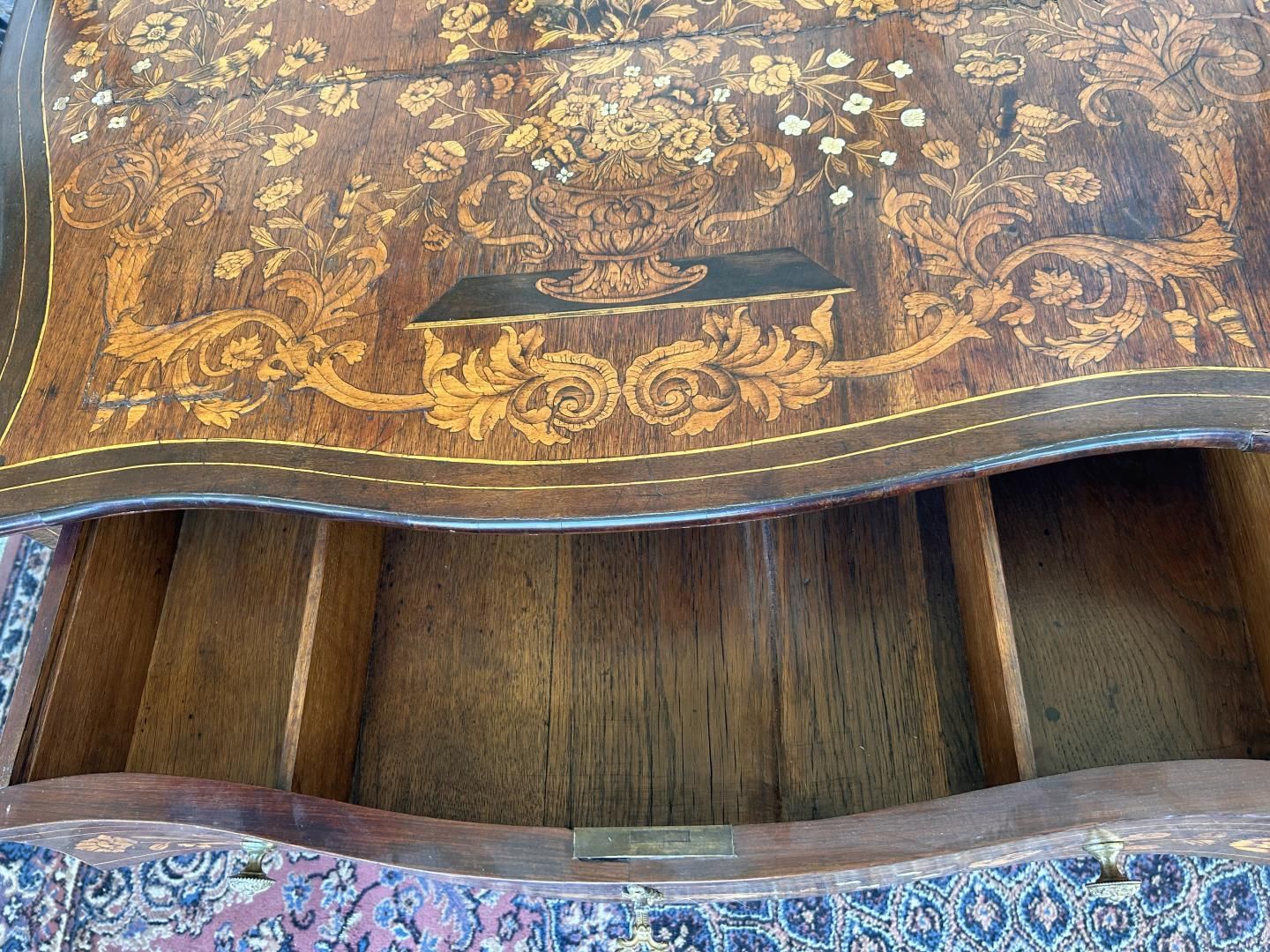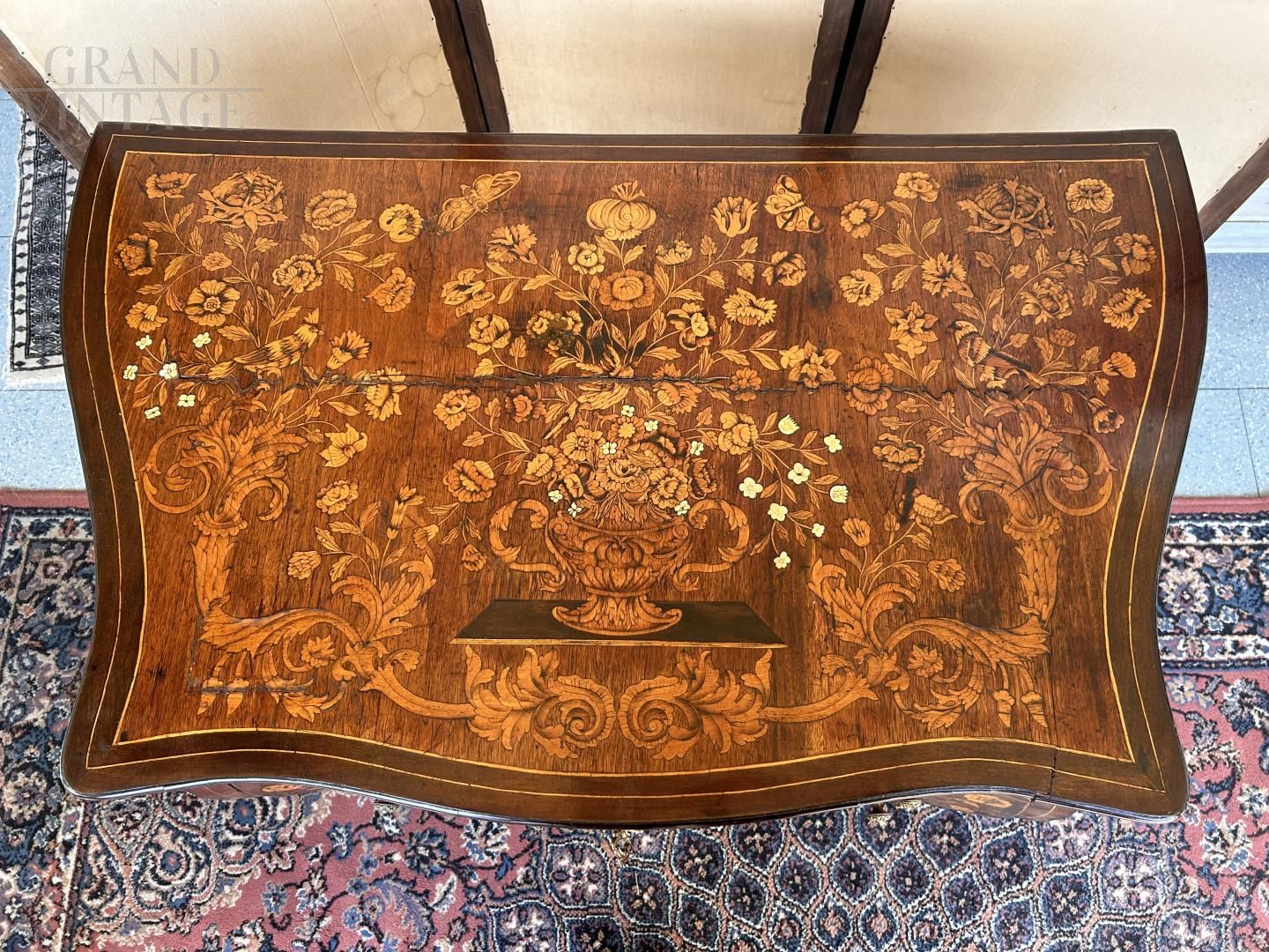 Meraviglioso comò antico olandese del ‘700 intarsiato con motivi floreali su 3 lati con un lavoro di alta ebanisteria, alcuni dei fiori in particolare sono intarsi in osso. Il comò e costituito da 2 cassetti, di cui uno con divisiori. Ferramenta originale con chiave, gambe a sciabola con piedini in ottone. In buone condizioni, presenta i naturali segni del tempo.
