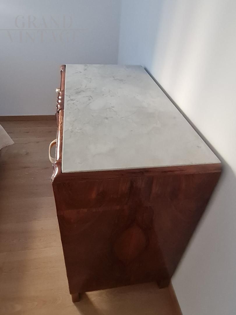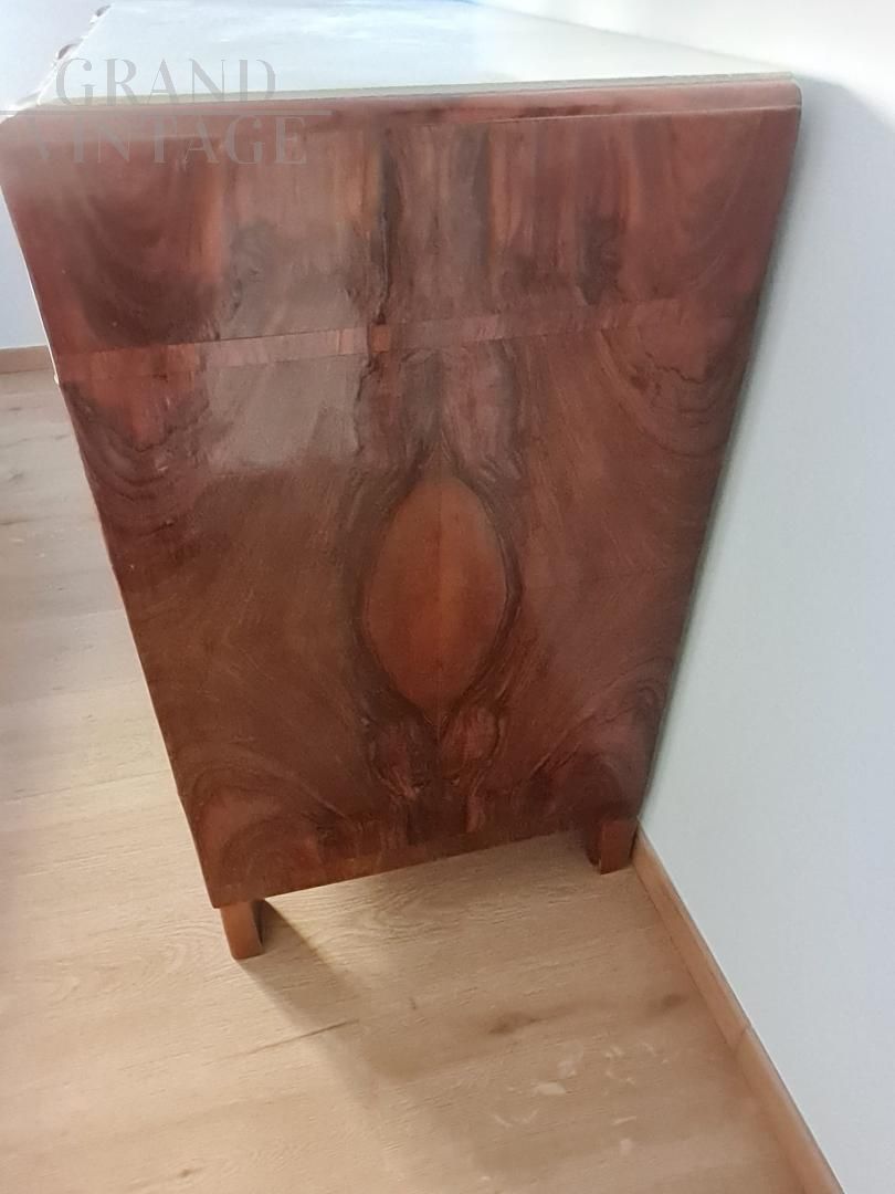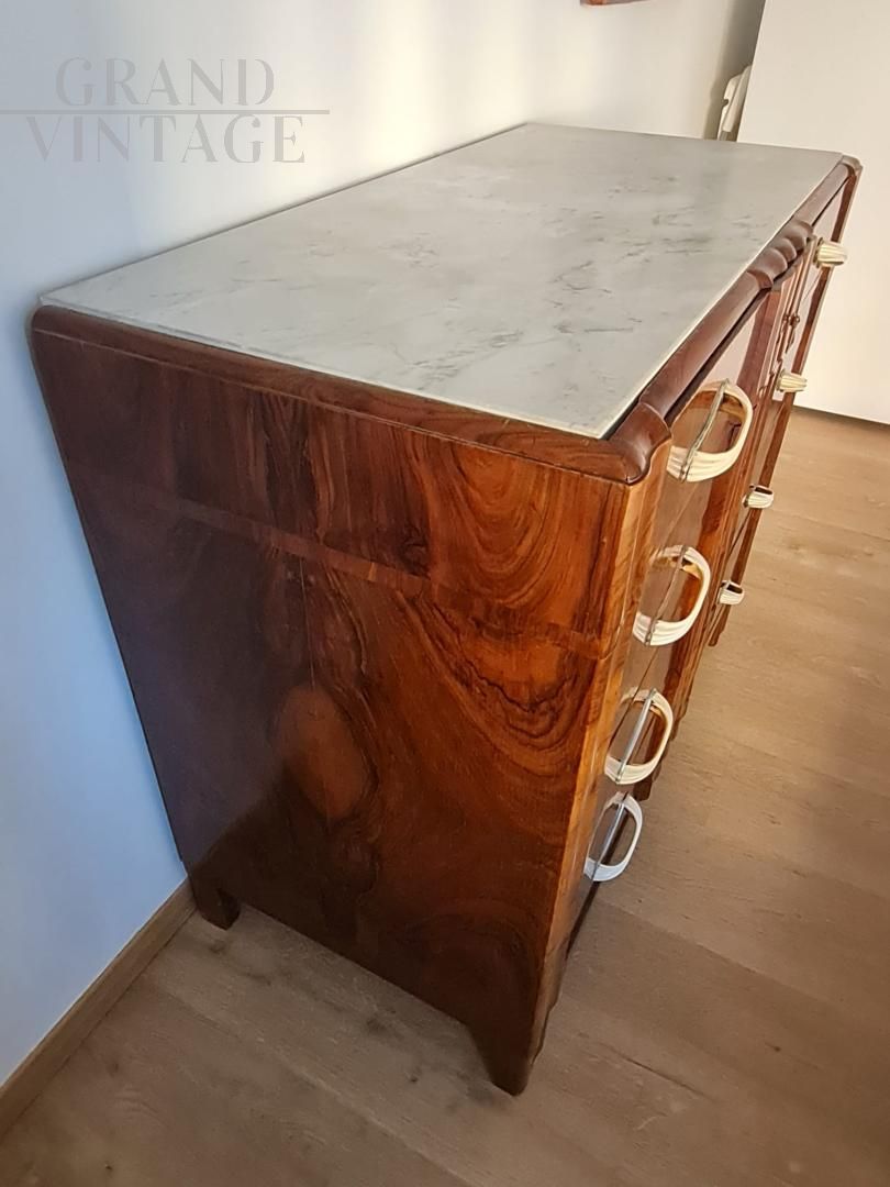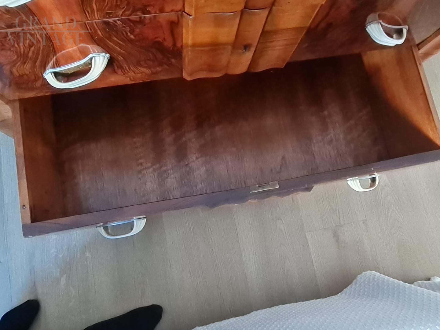 Elegante e particolare comò Art Déco anni '40 in radica di noce, costituito da 4 cassetti con maniglie in bachelite, in ottimo stato.