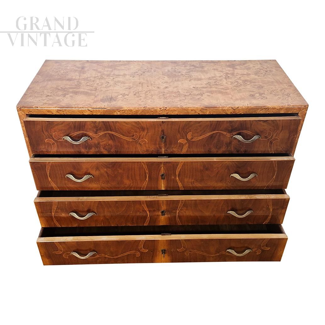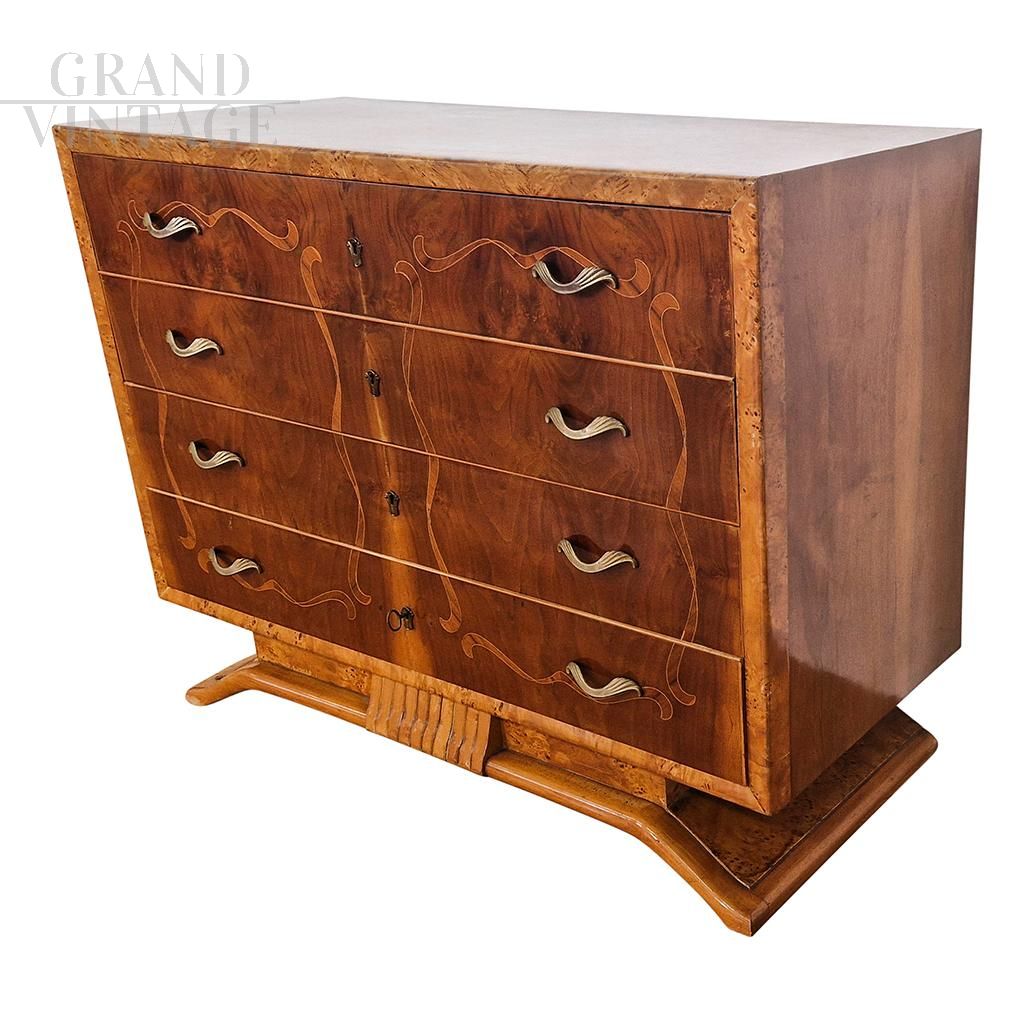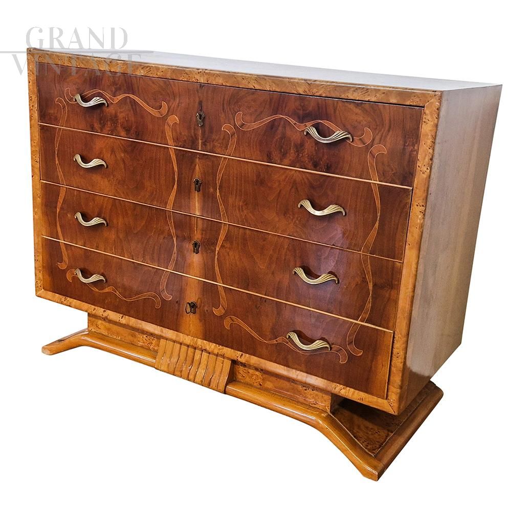 Magnifico comò art déco in radica di noce con quattro cassetti, dalla linea sinuosa, arricchito da intarsi in acero.