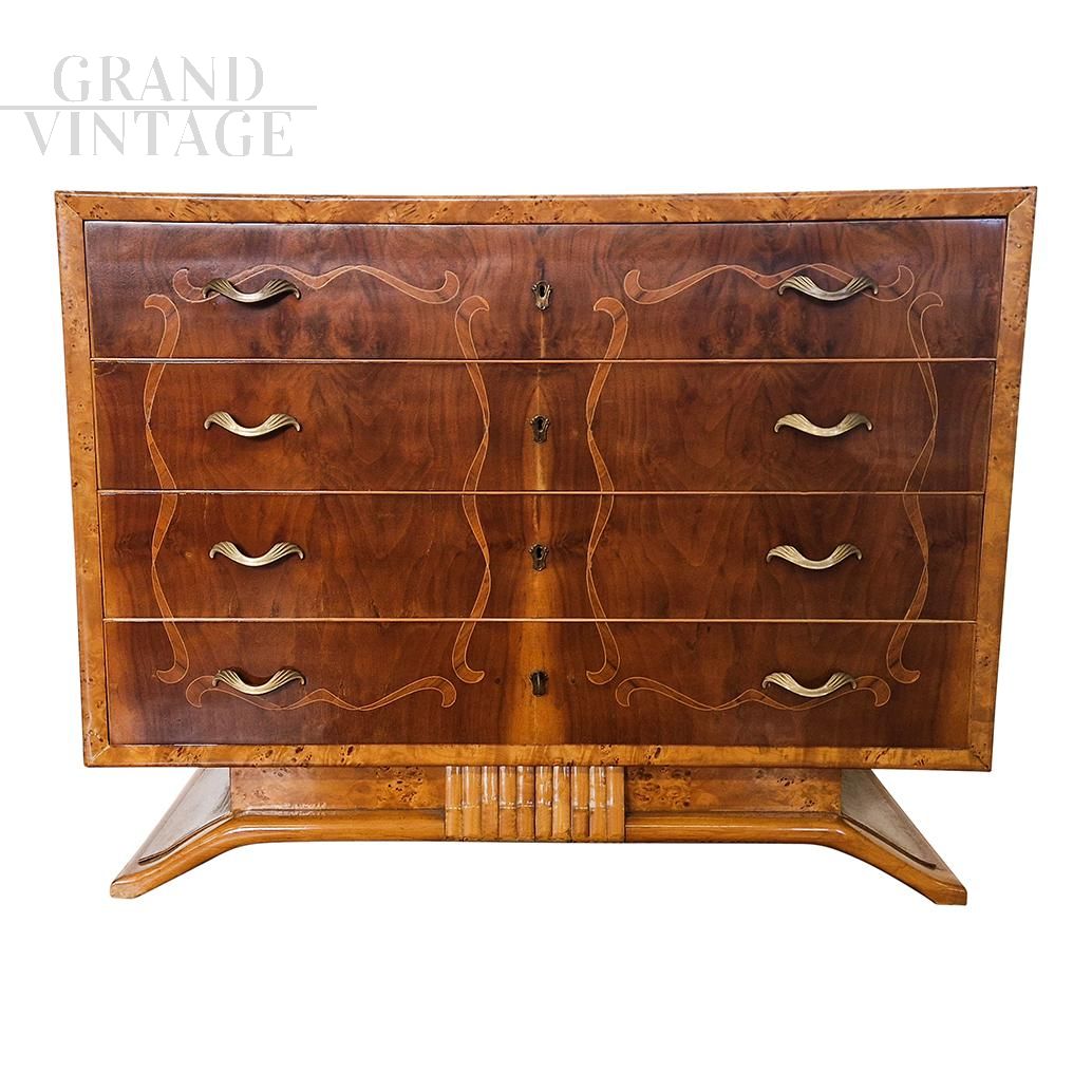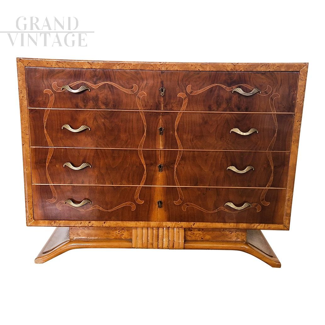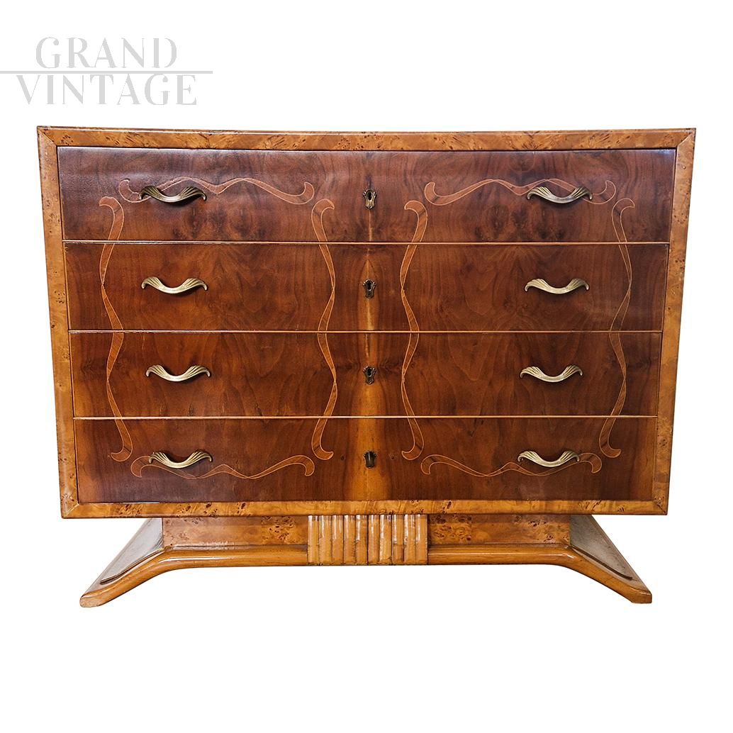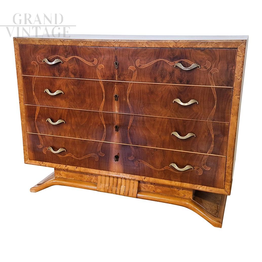 Magnifico comò art déco in radica di noce con quattro cassetti, dalla linea sinuosa, arricchito da intarsi in acero.