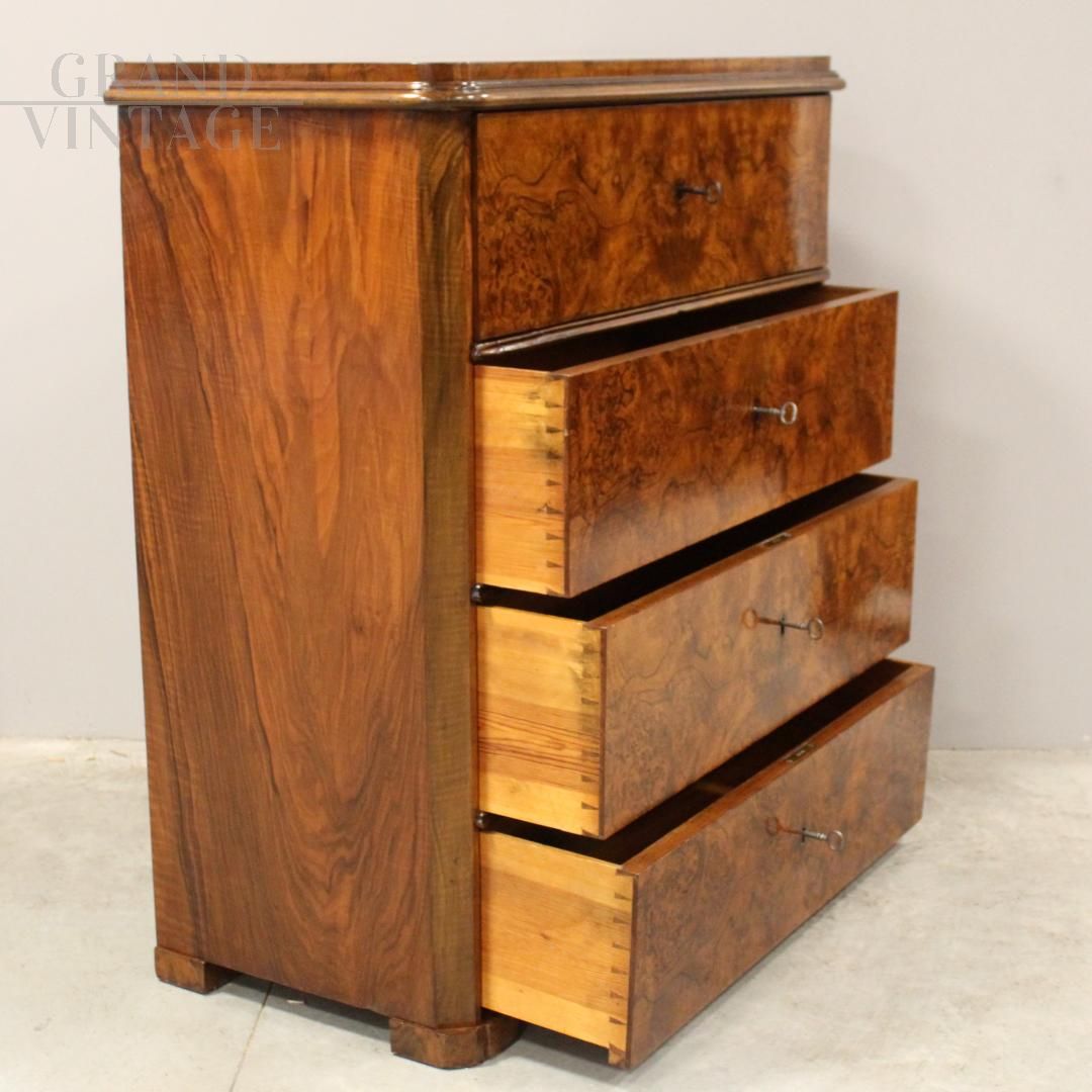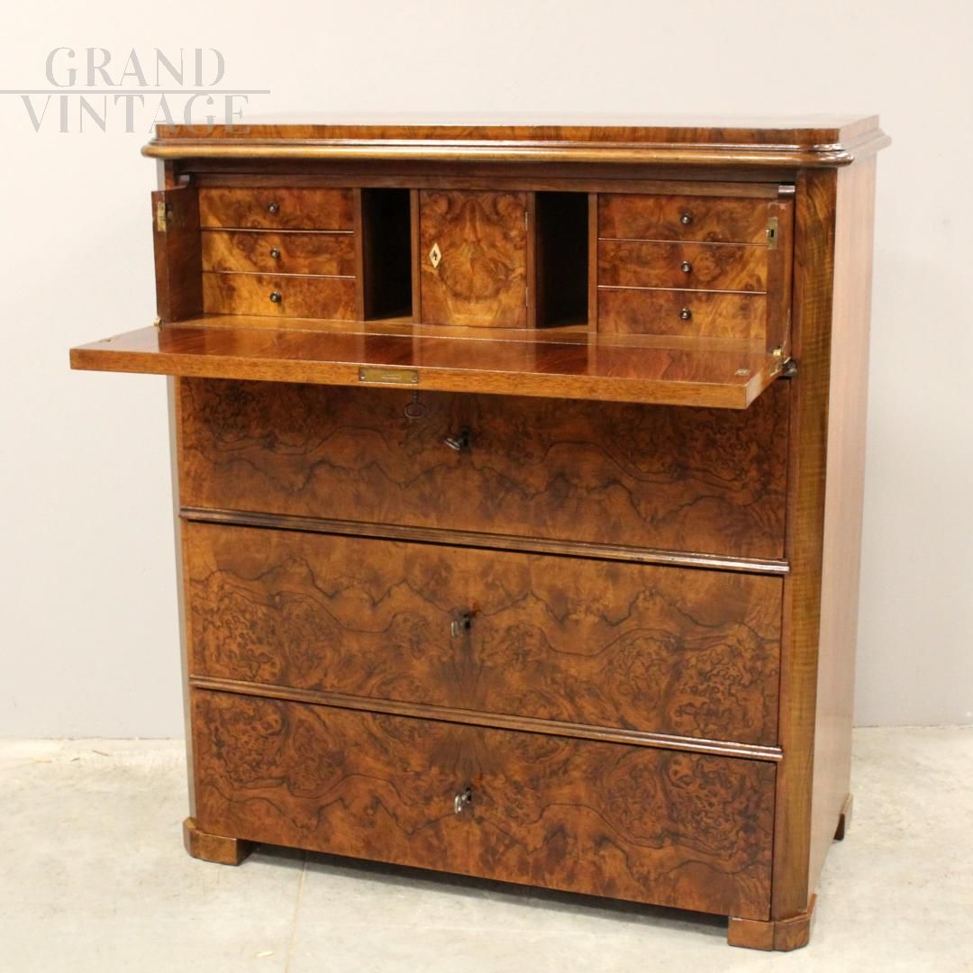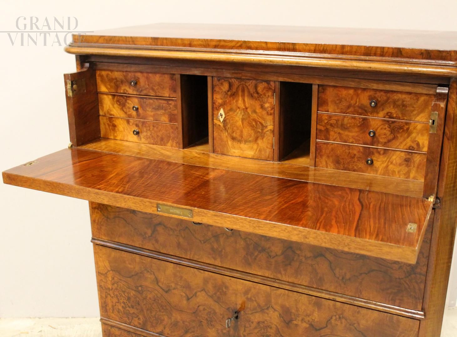 Cassettone comò secretaire antico con piano a ribalta in noce del periodo e in stile Biedermeier, lastronato in noce e magnifica radica di noce, realizzato nella prima metà dell'800, restaurato.