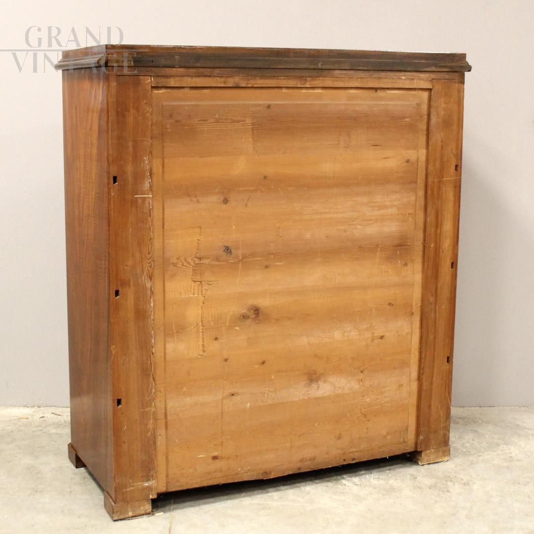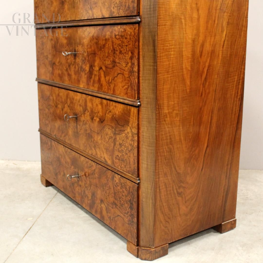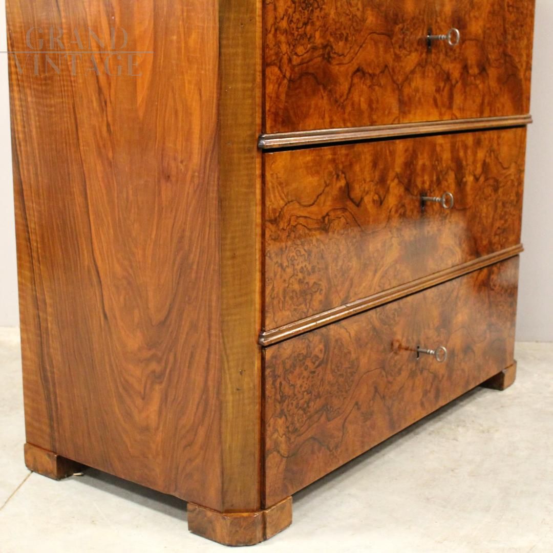 Cassettone comò secretaire antico con piano a ribalta in noce del periodo e in stile Biedermeier, lastronato in noce e magnifica radica di noce, realizzato nella prima metà dell'800, restaurato.
