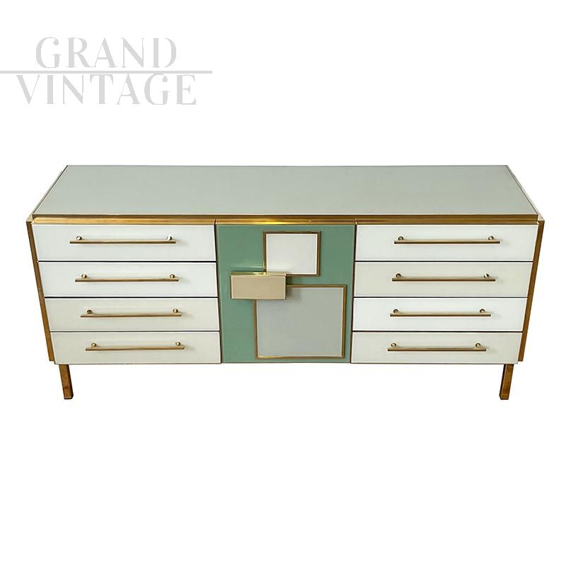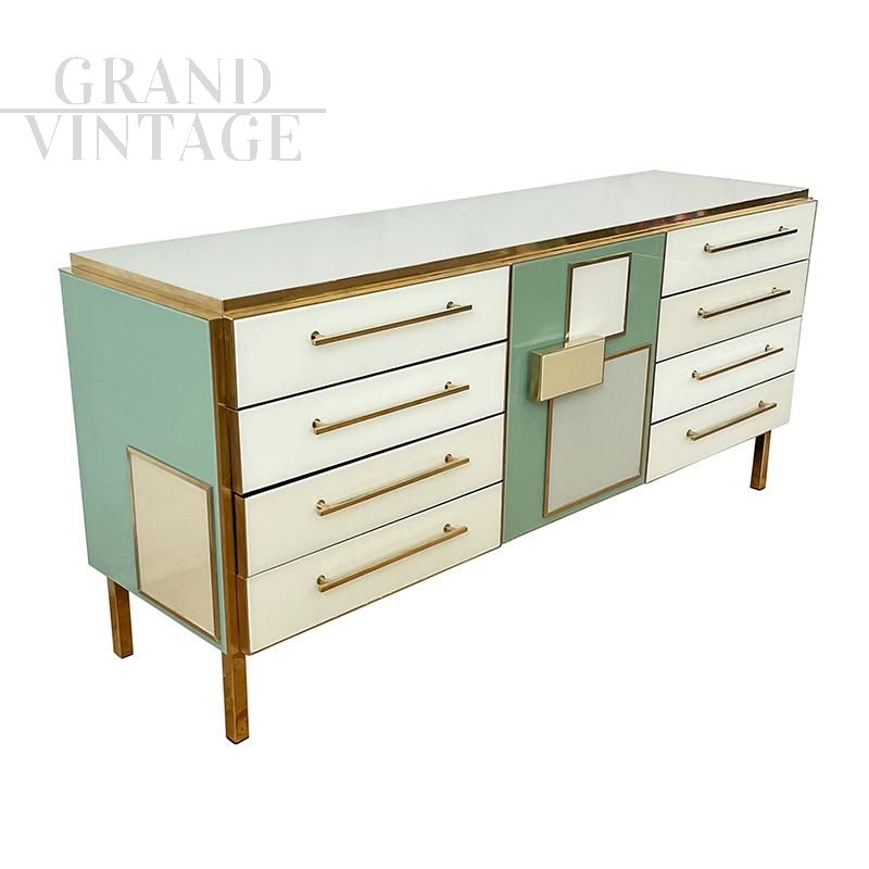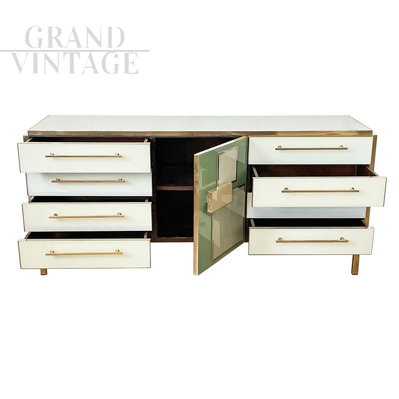 Comò mobile buffet in vetro colorato bianco e verde con finiture in ottone, composto da otto cassetti e un'anta centrale.