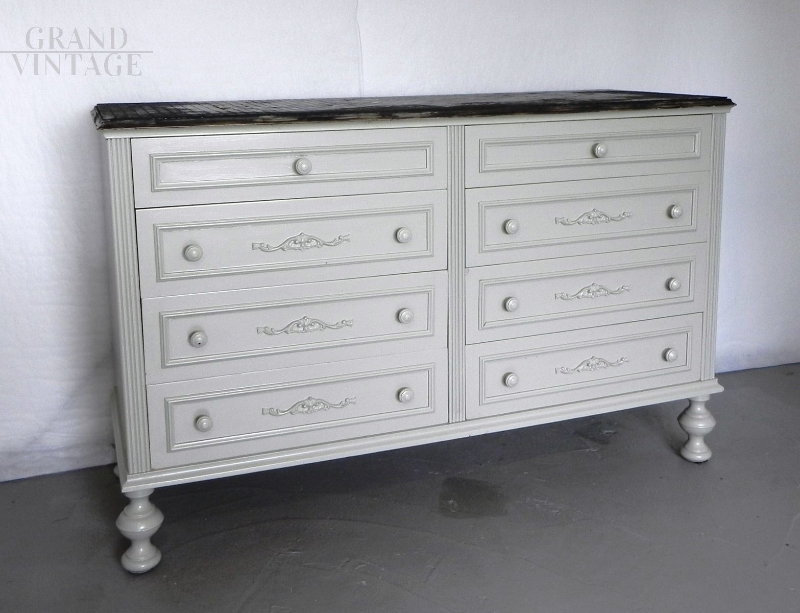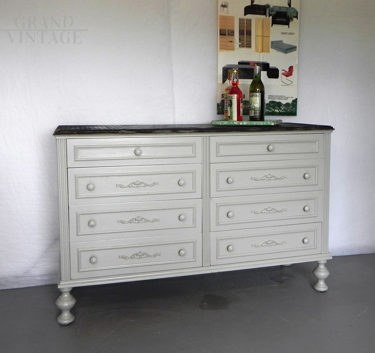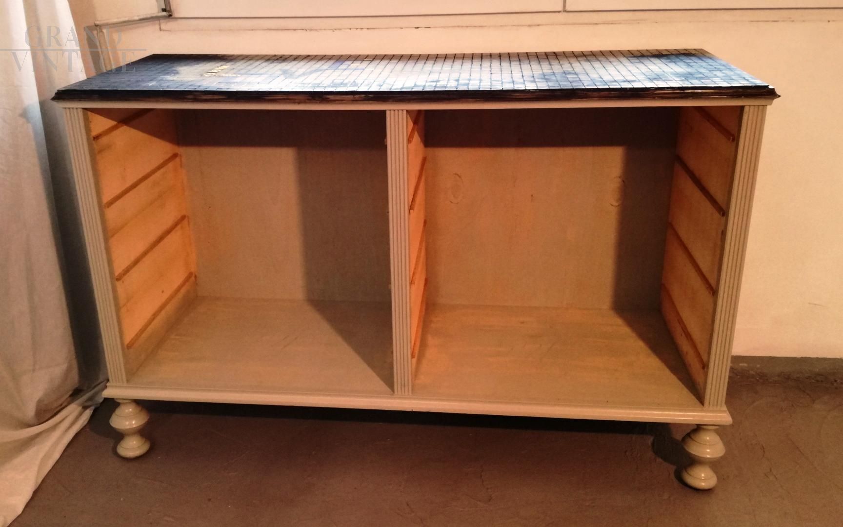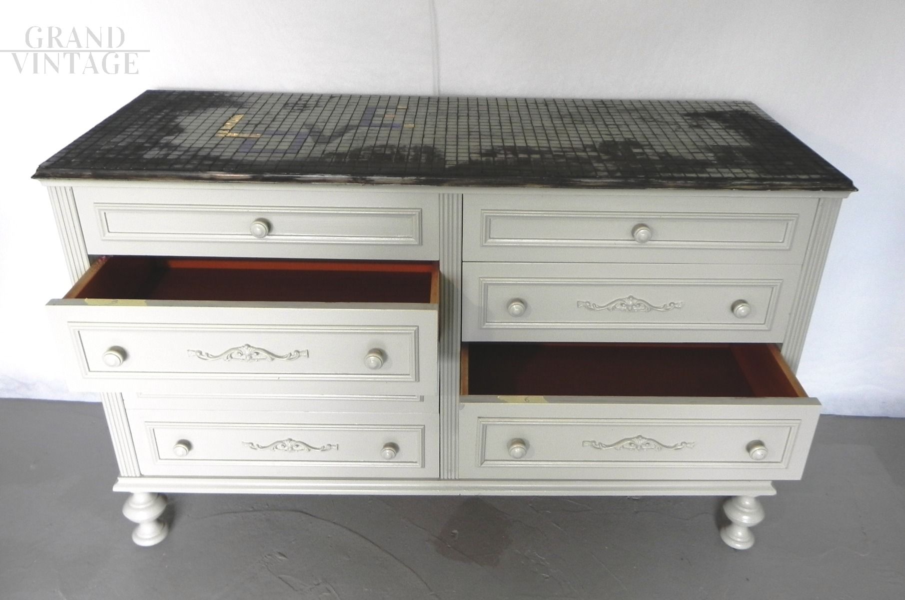Cassettone vintage in legno con mosaico sul piano, anni '60, riverniciato con smalto grigio. Il top è stato rivestito in vero Mosaico Bisazza anni '80 creando la scritta Love che traspare da una stuccatura scura volutamente Grunge. Il cassettone è perfetto in tutte le sue parti, adatto ad un uso quotidiano.